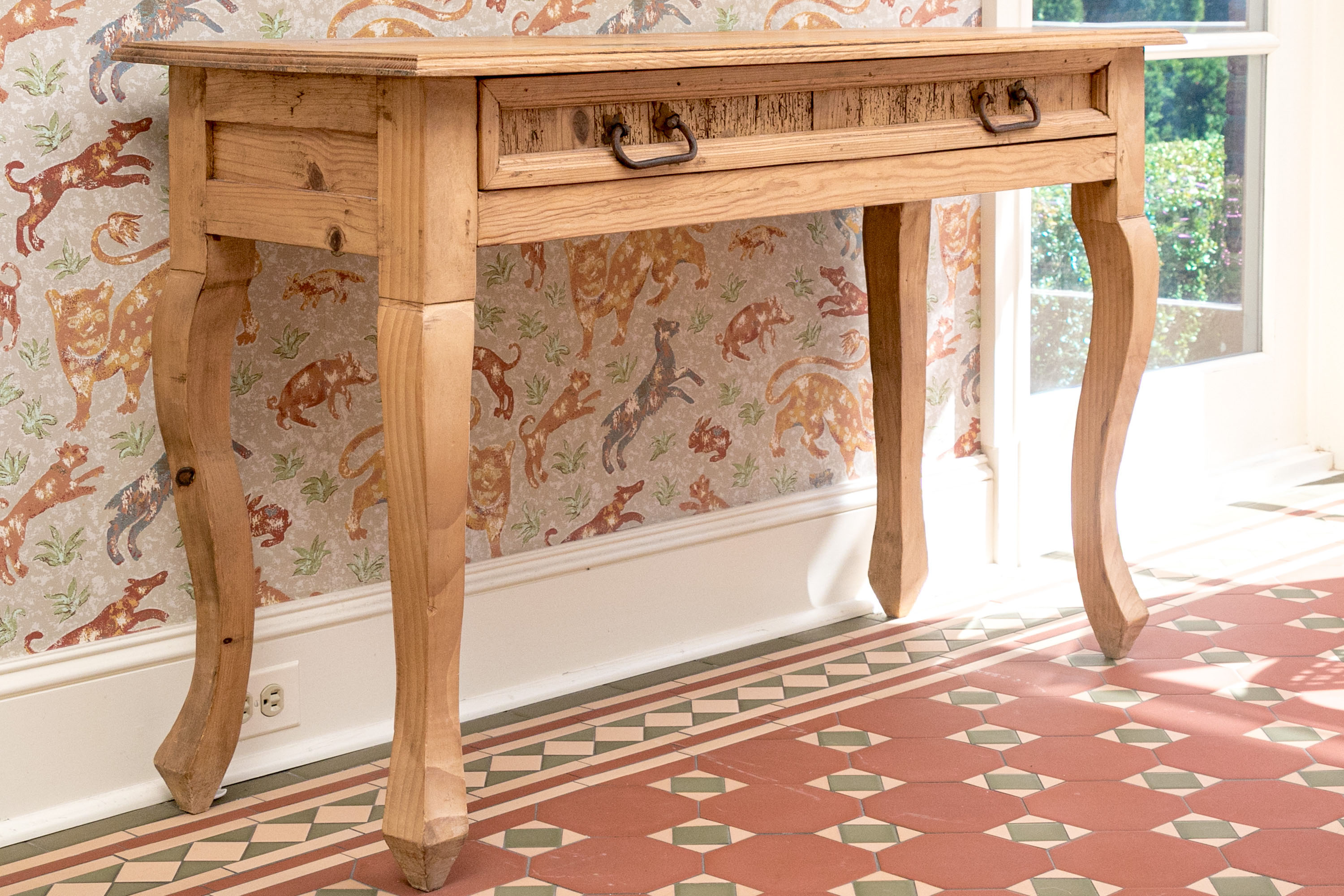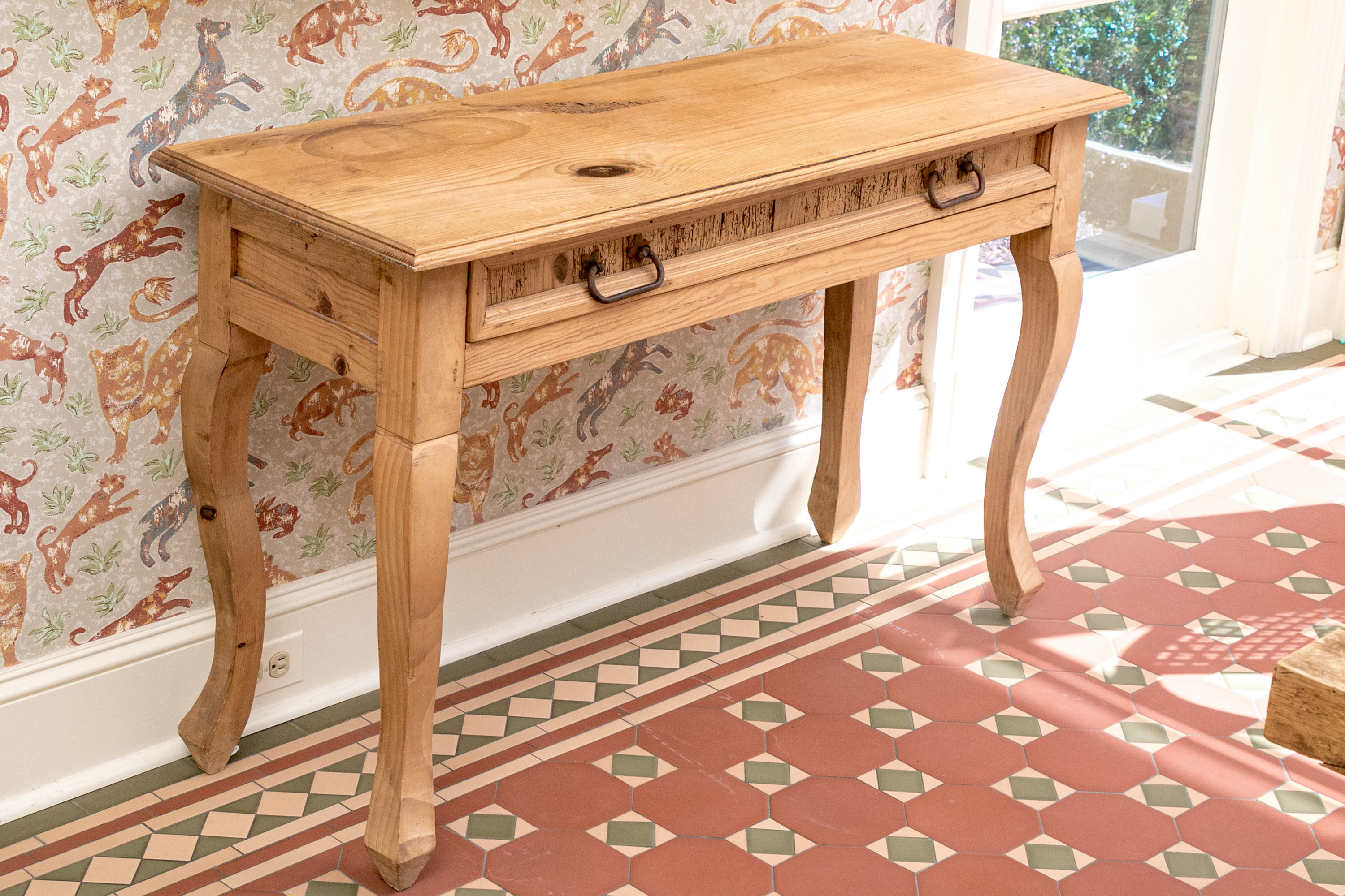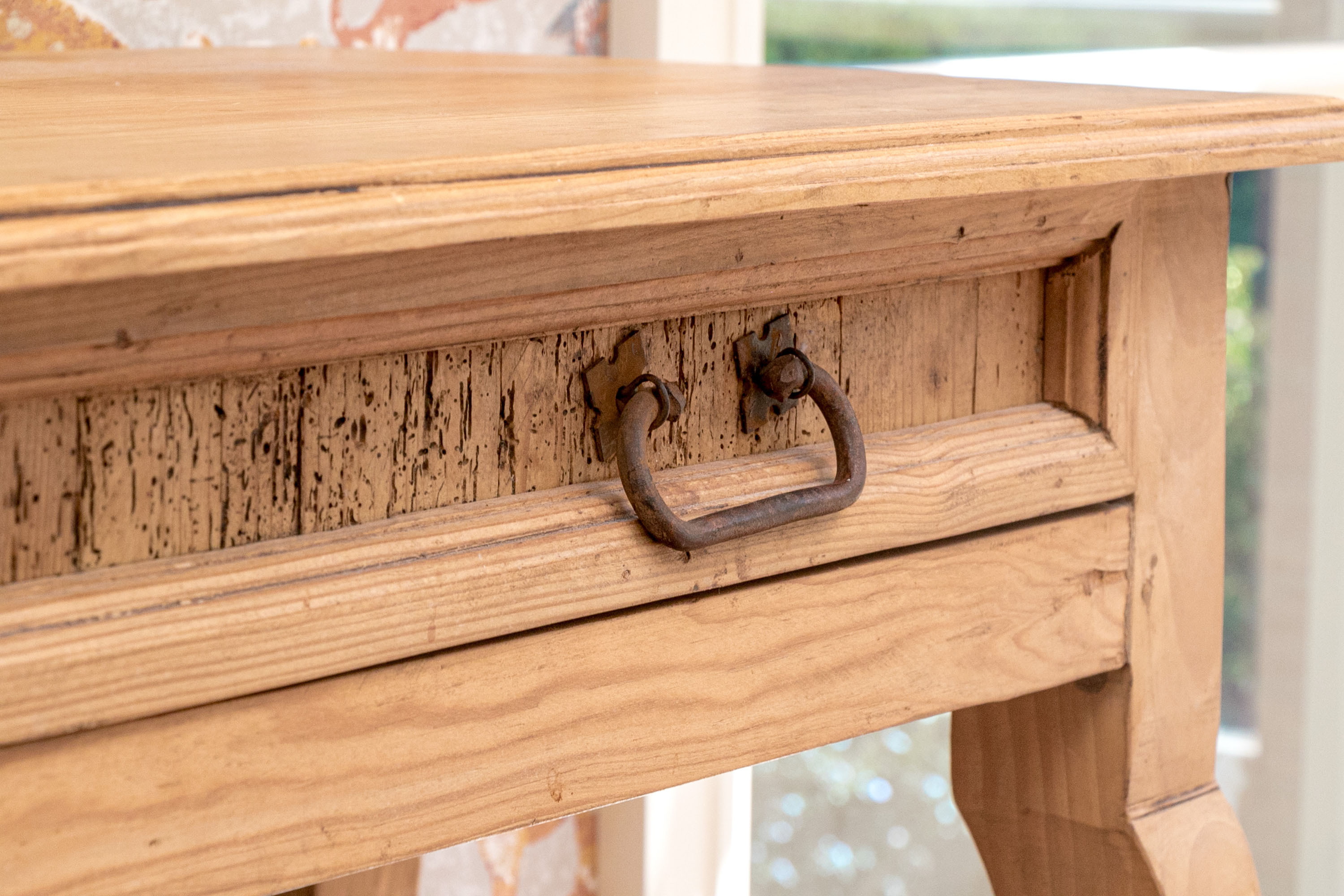 Standing upon four carved cabriole legs with the tabletop above hosting a single long drawer to the case with two oval iron pulls.