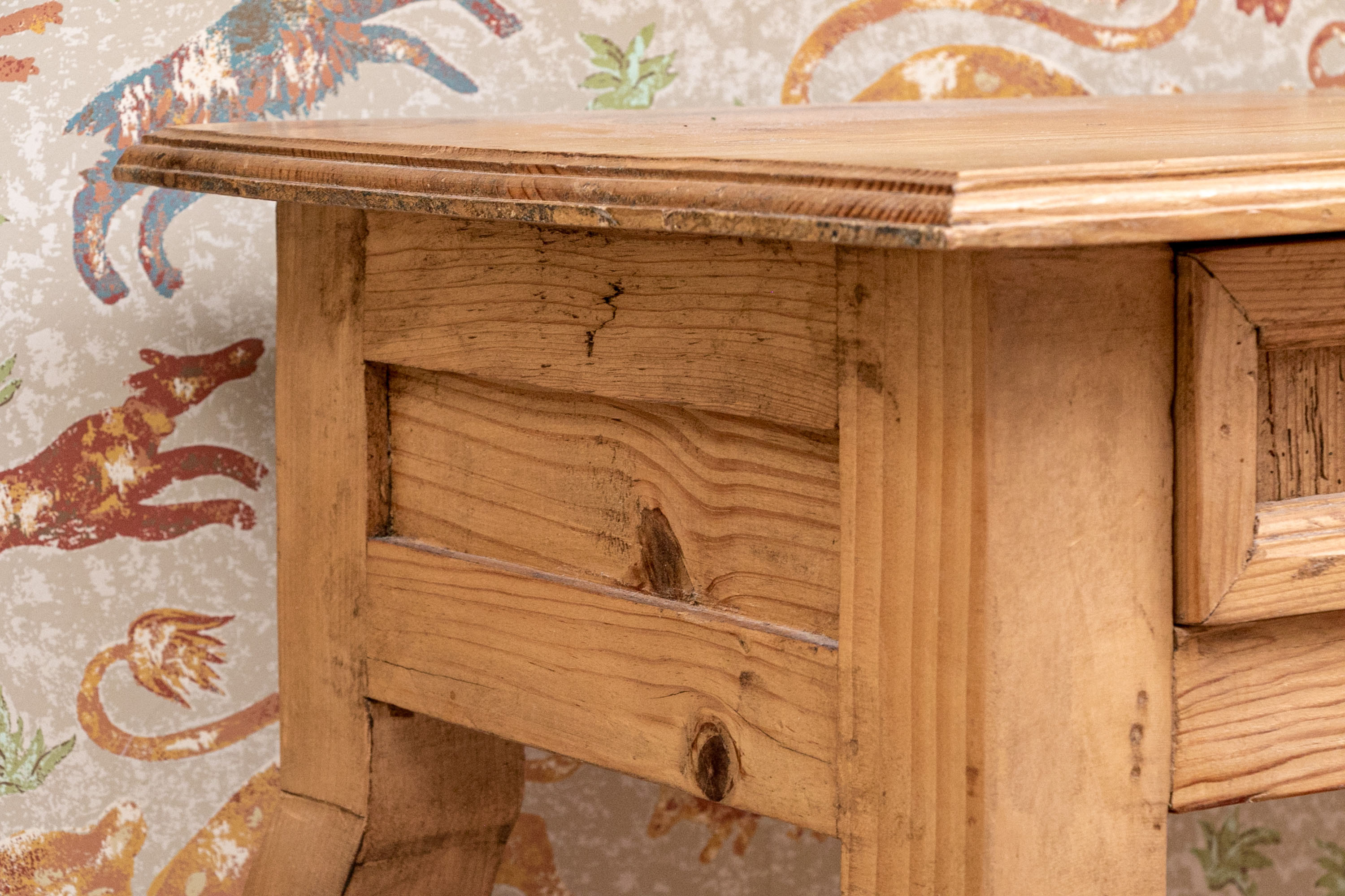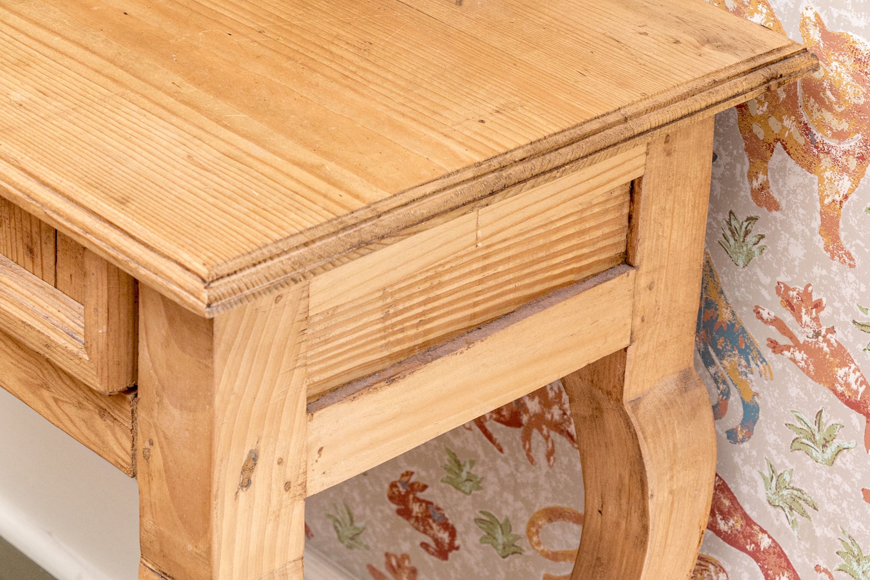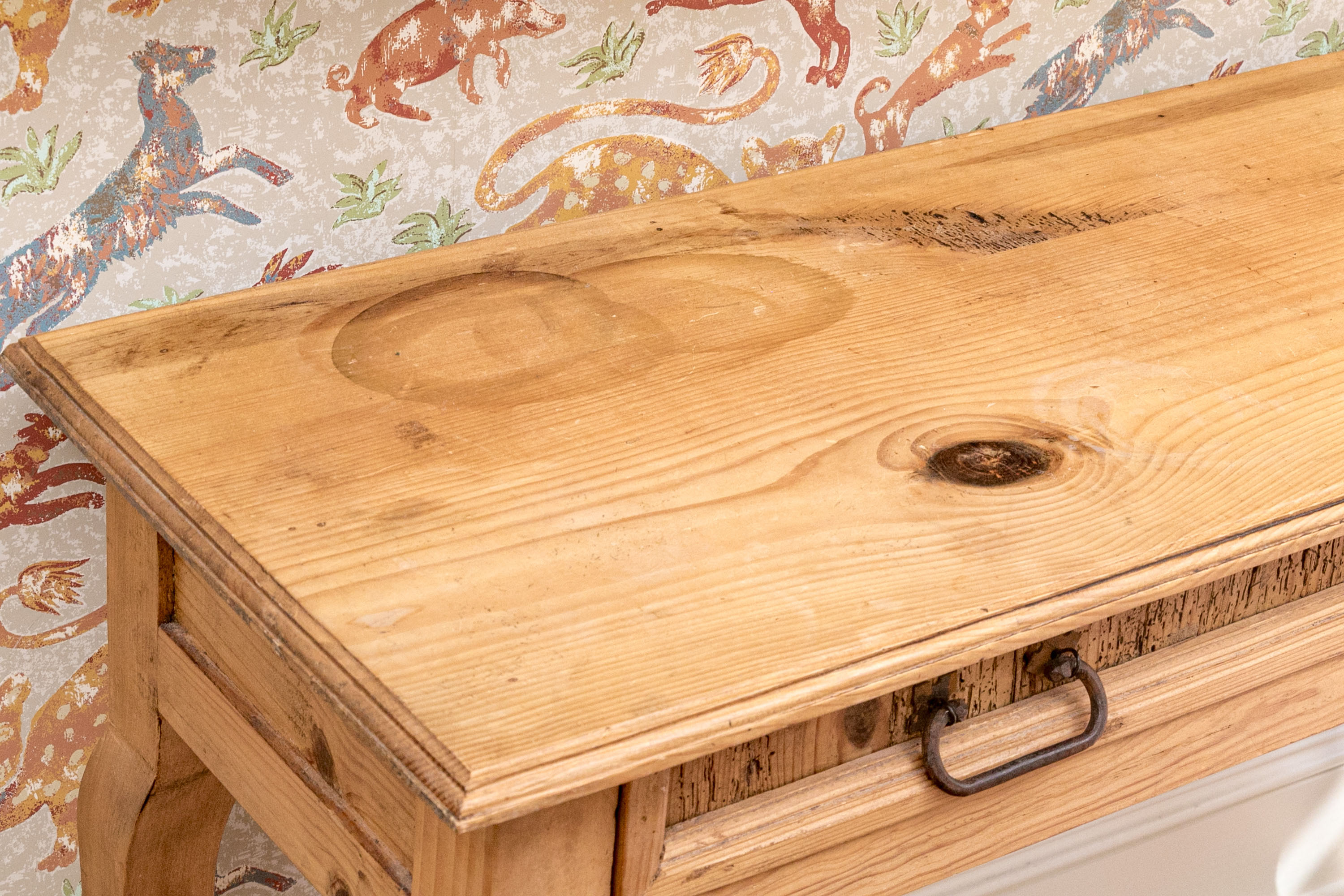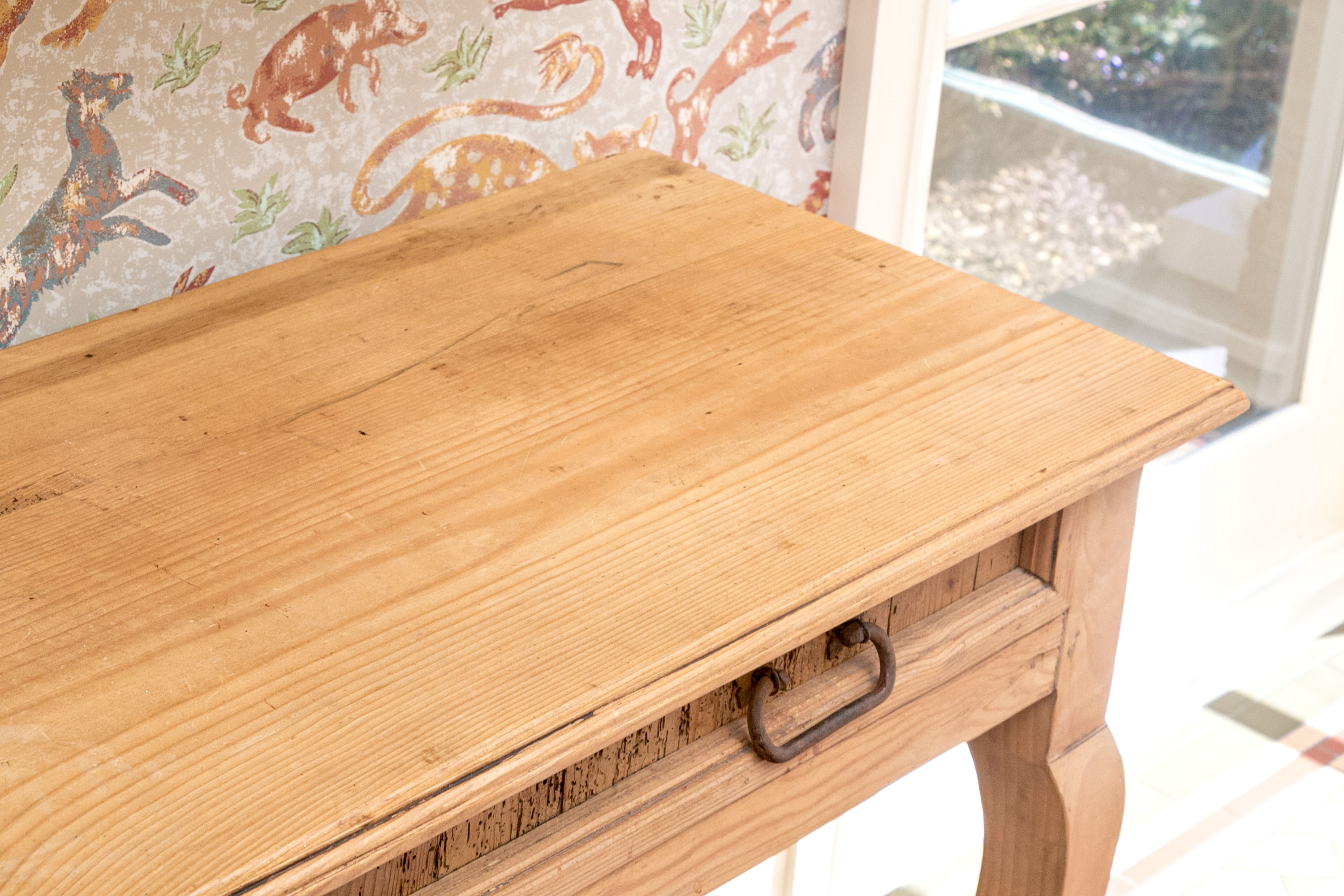 Standing upon four carved cabriole legs with the tabletop above hosting a single long drawer to the case with two oval iron pulls.