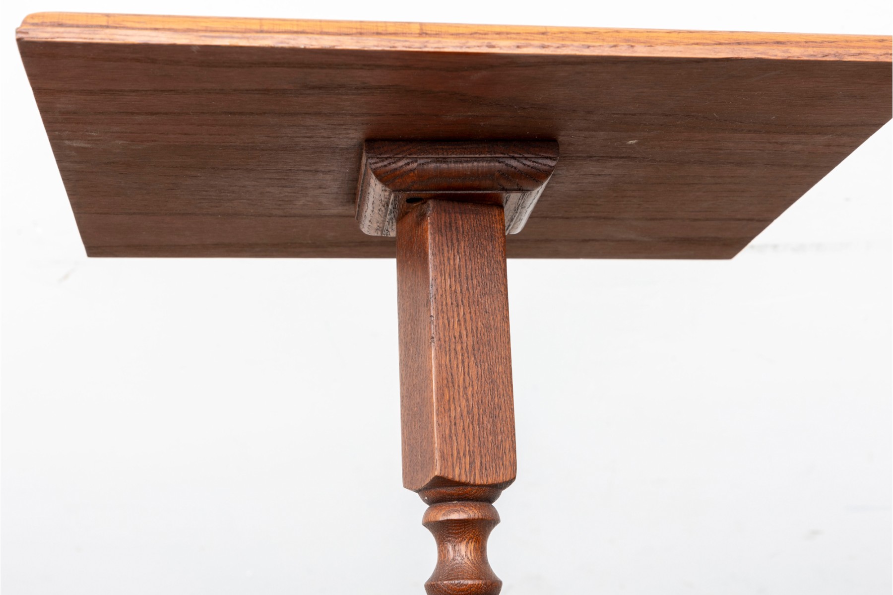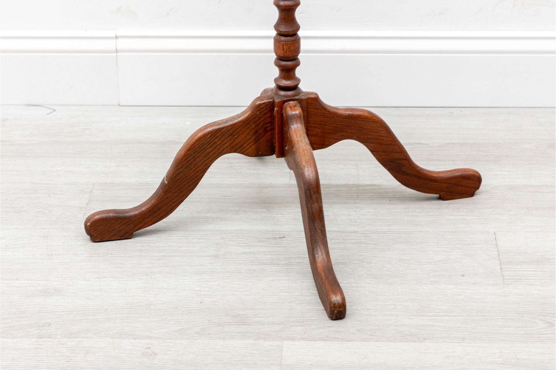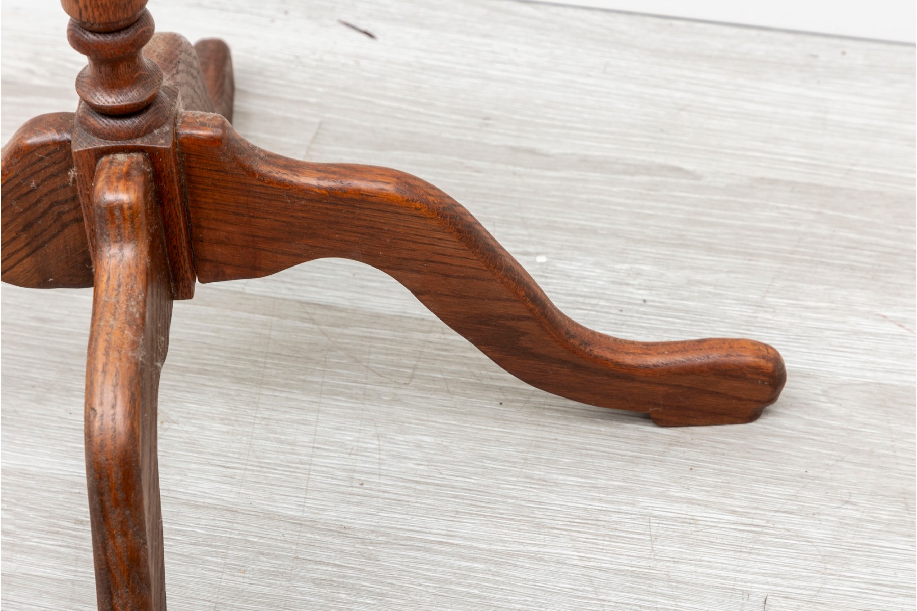 A rustic, farmhouse inspired regency style pedestal table with a central lathe-turned wood baluster column supported on four primitive cabriole legs.
