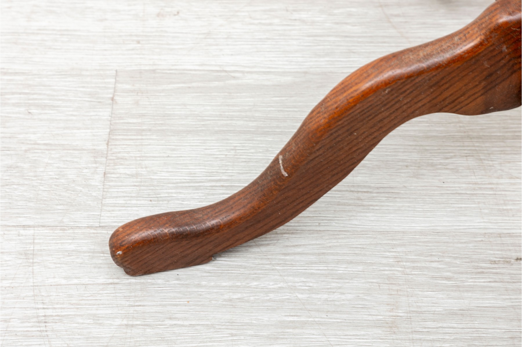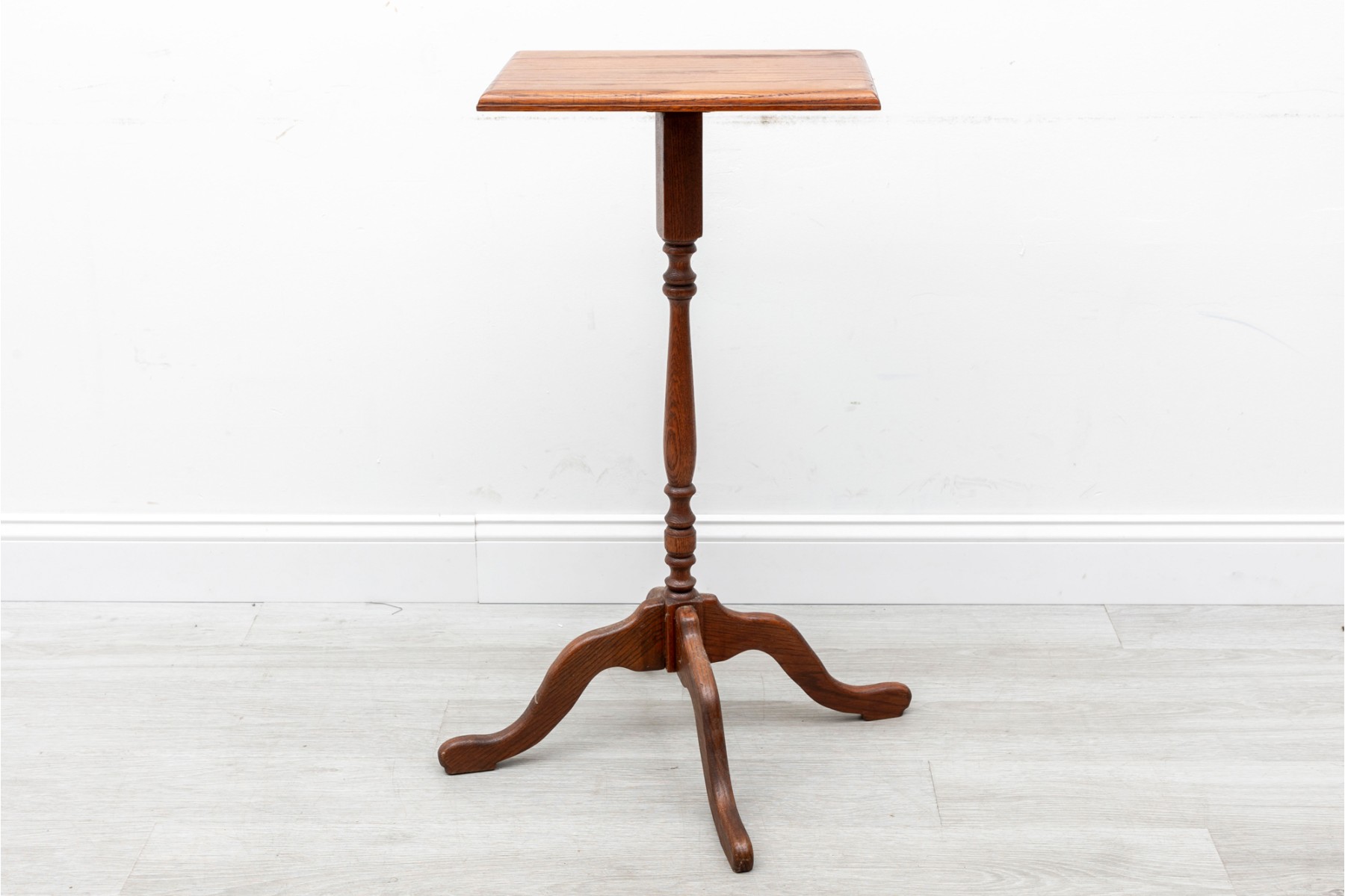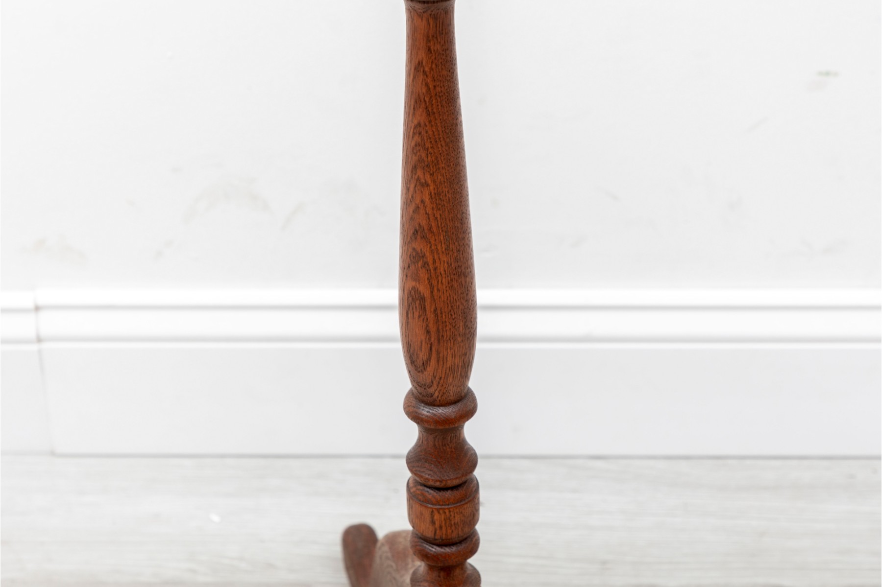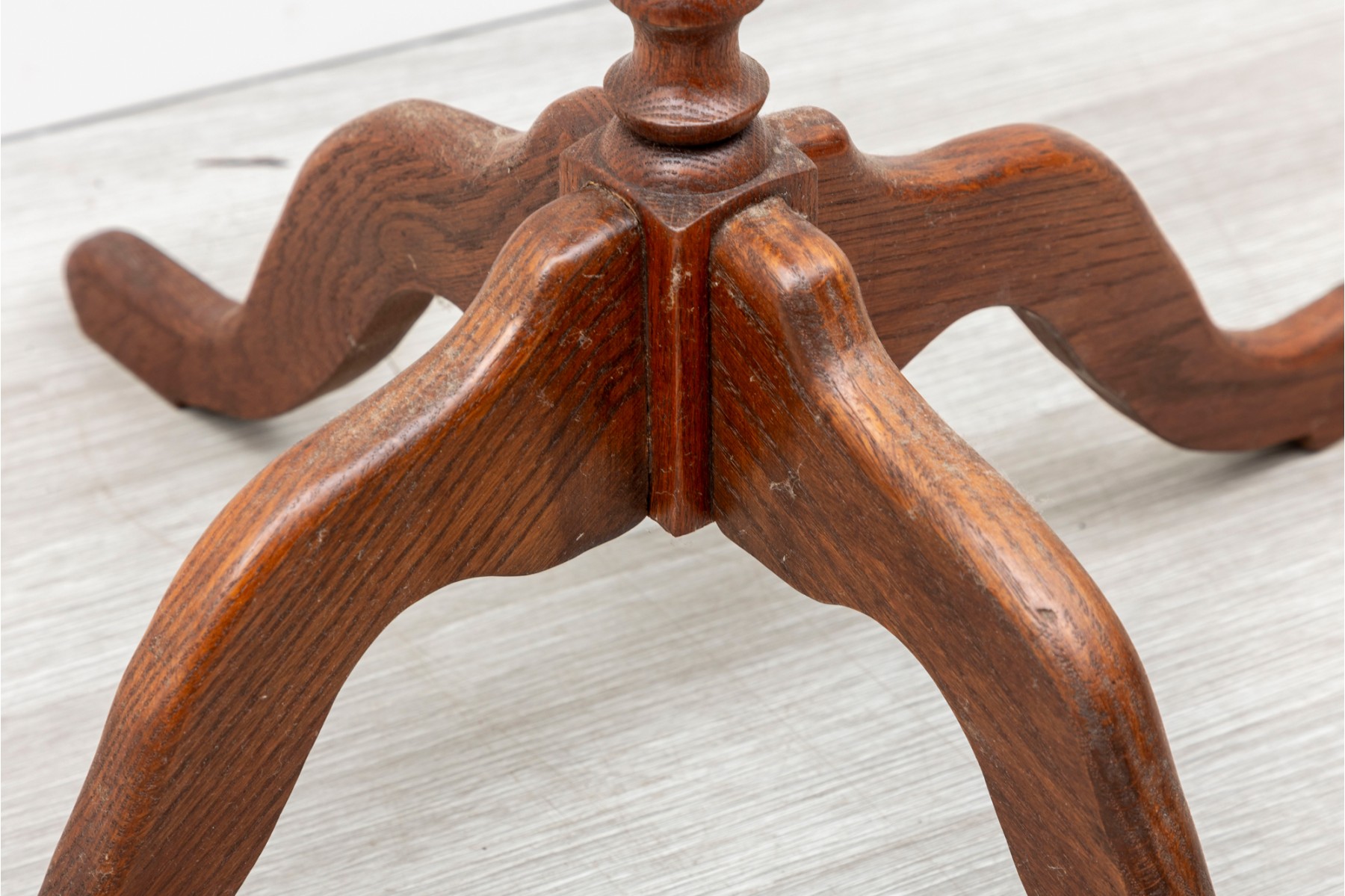 A rustic, farmhouse inspired regency style pedestal table with a central lathe-turned wood baluster column supported on four primitive cabriole legs.