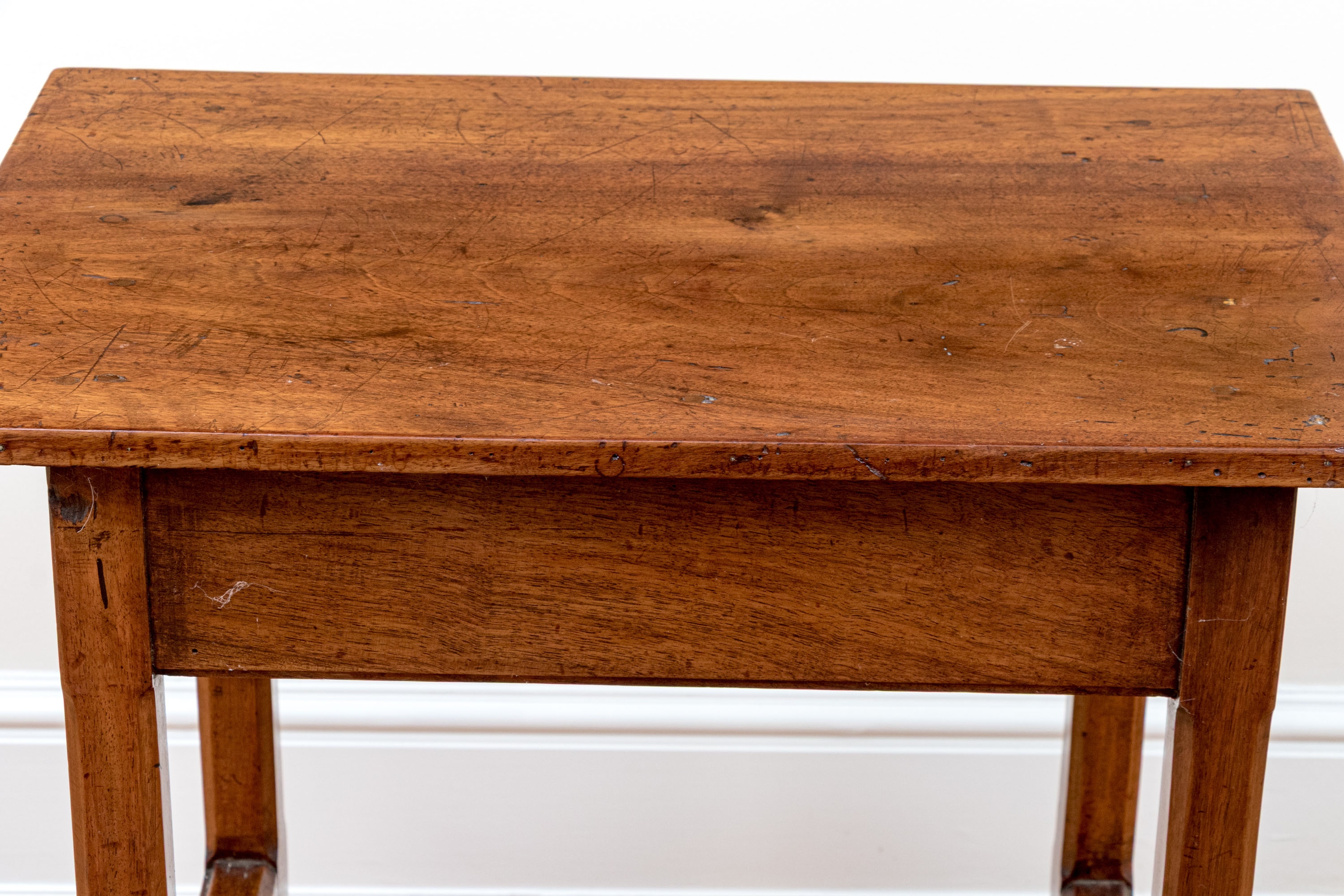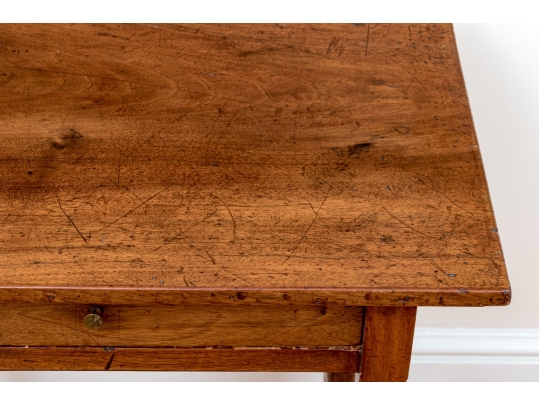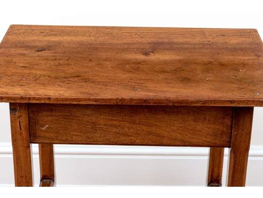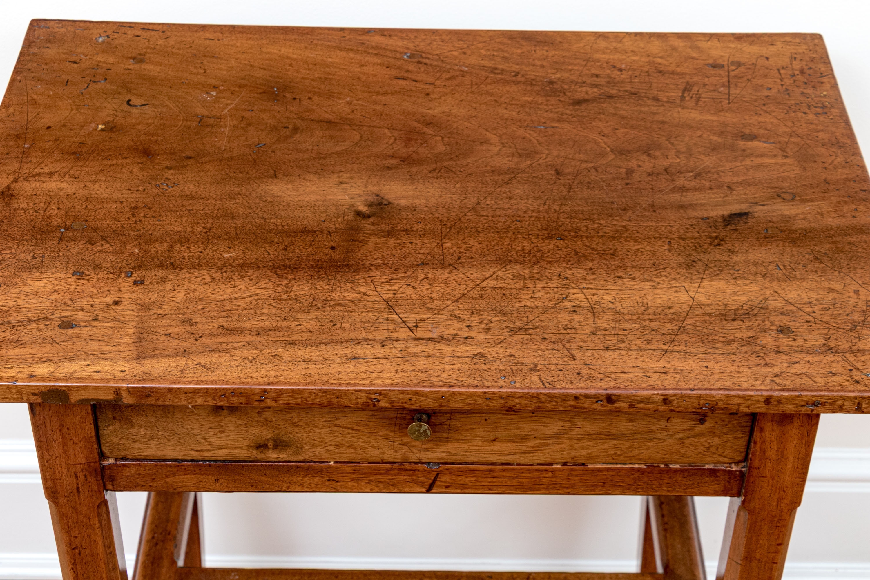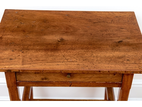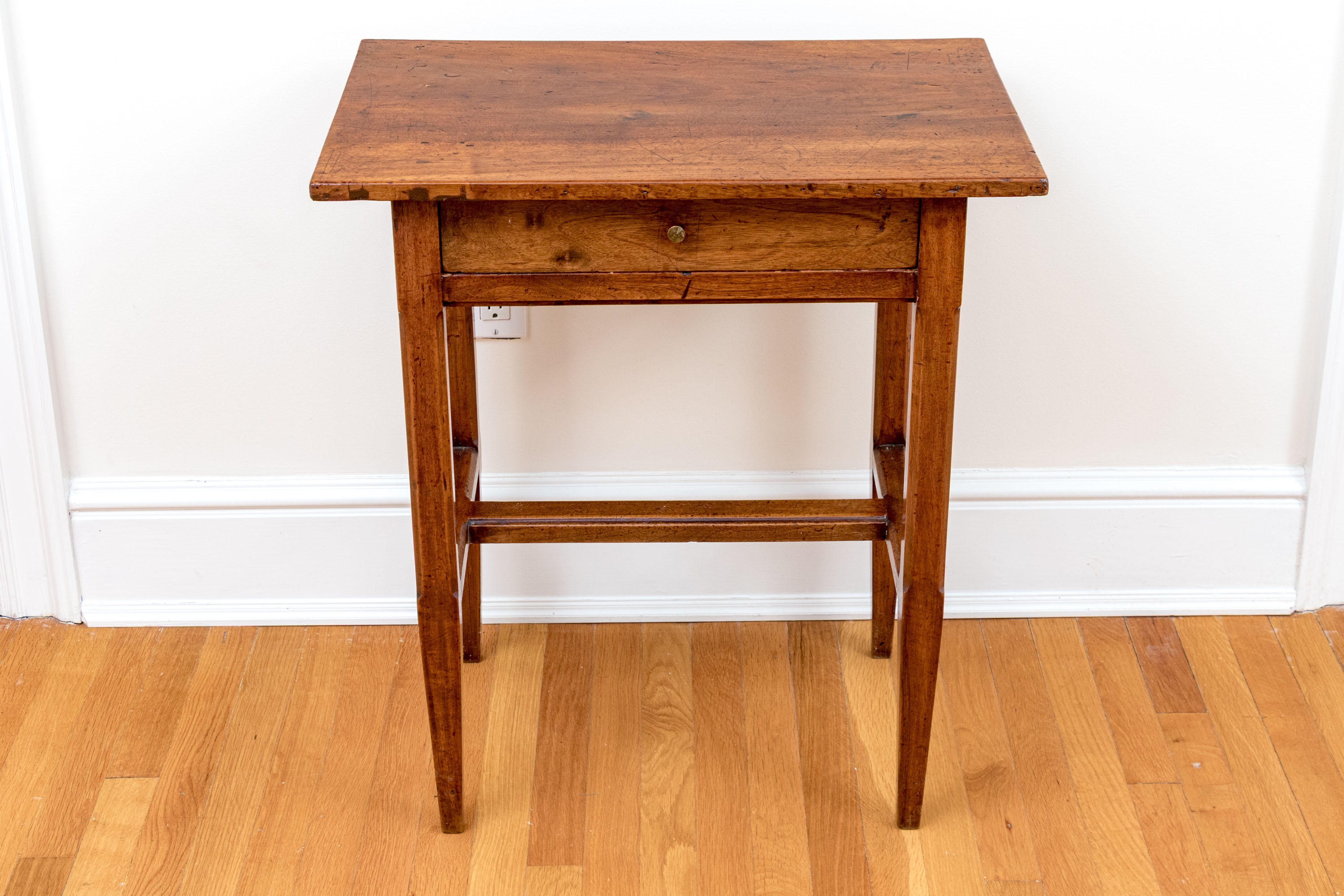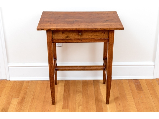 A semi-antique accent table with great Federal influence and minimalist style, nicely crafted in honeyed medium brown wood. The table features a rectangular top over a single drawer with a small brass knob, raised over straight and gently tapered legs with a high H-stretcher.
