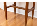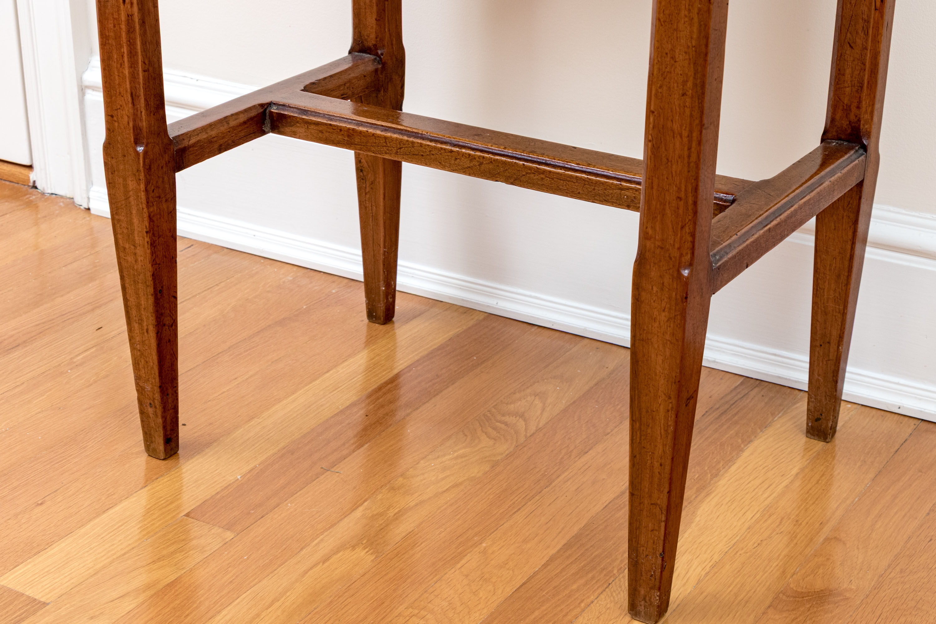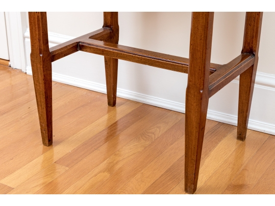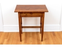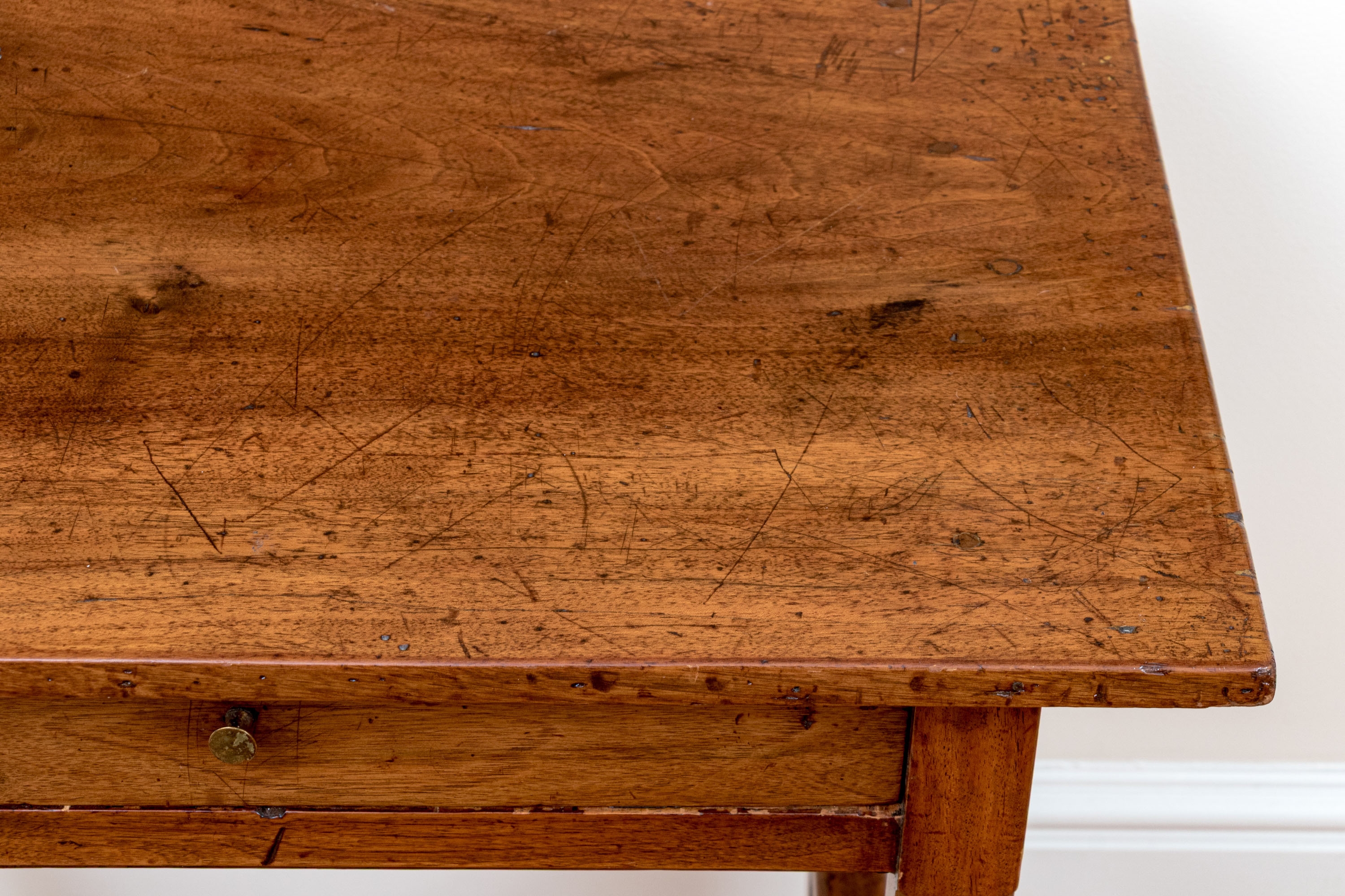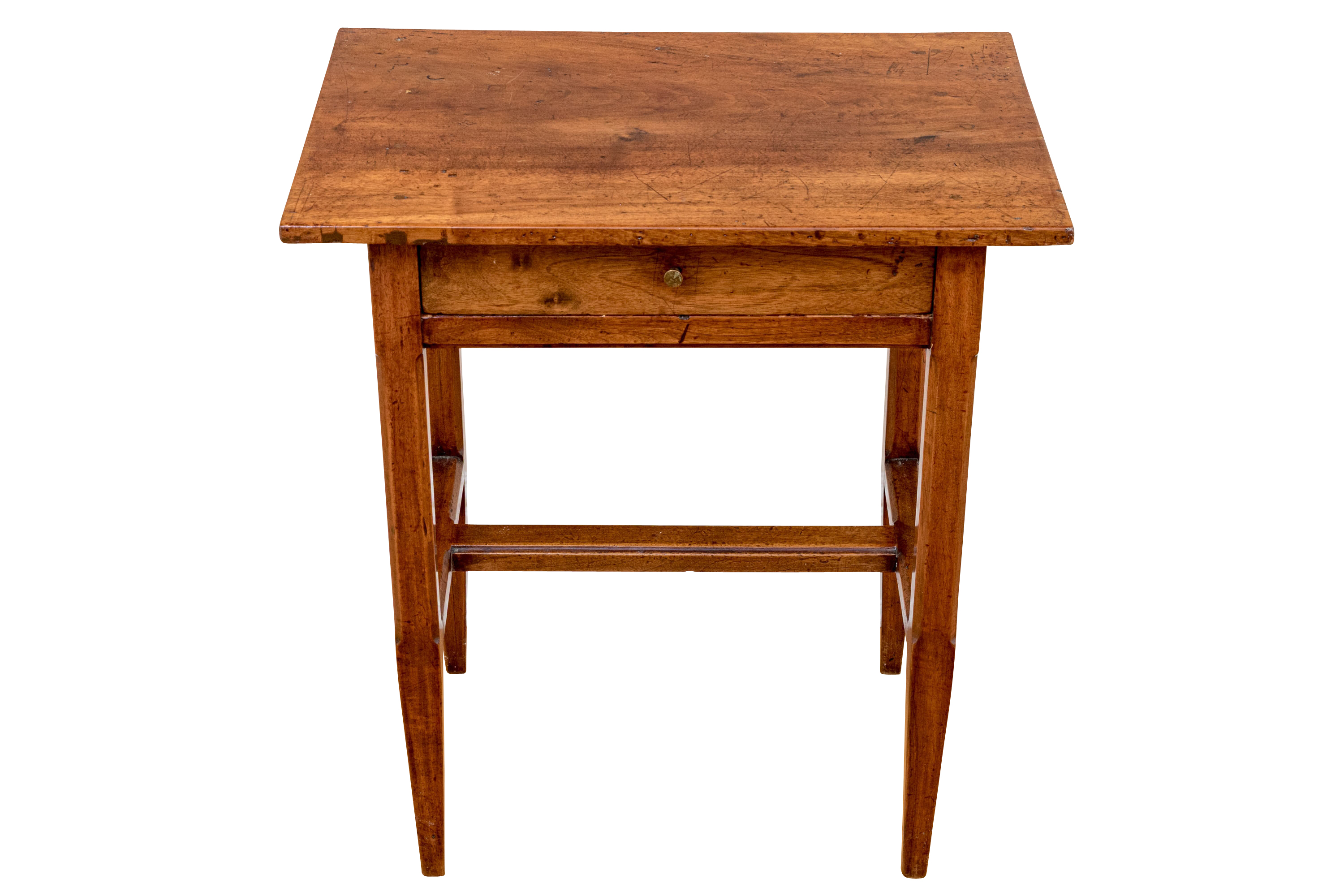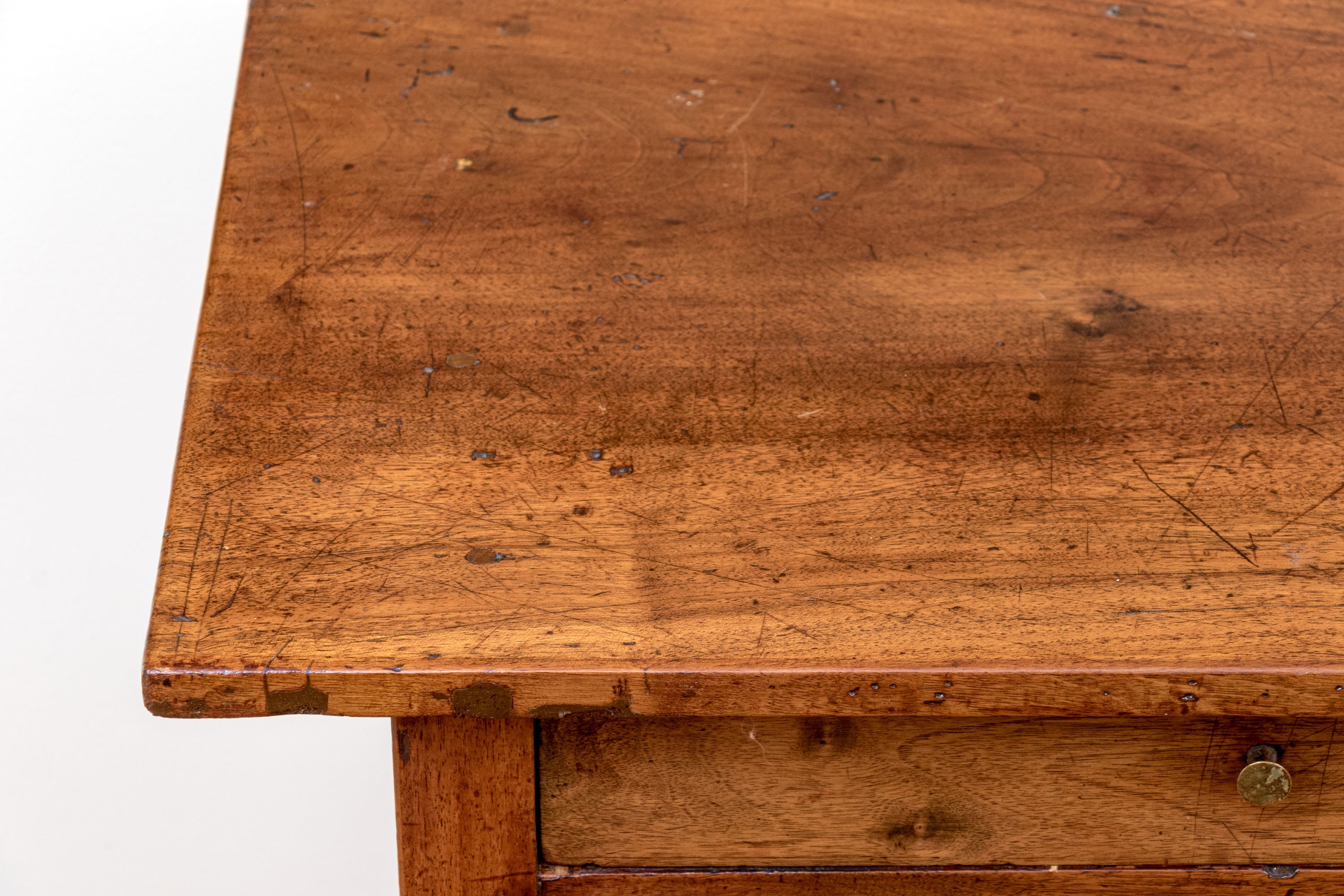 A semi-antique accent table with great Federal influence and minimalist style, nicely crafted in honeyed medium brown wood. The table features a rectangular top over a single drawer with a small brass knob, raised over straight and gently tapered legs with a high H-stretcher.