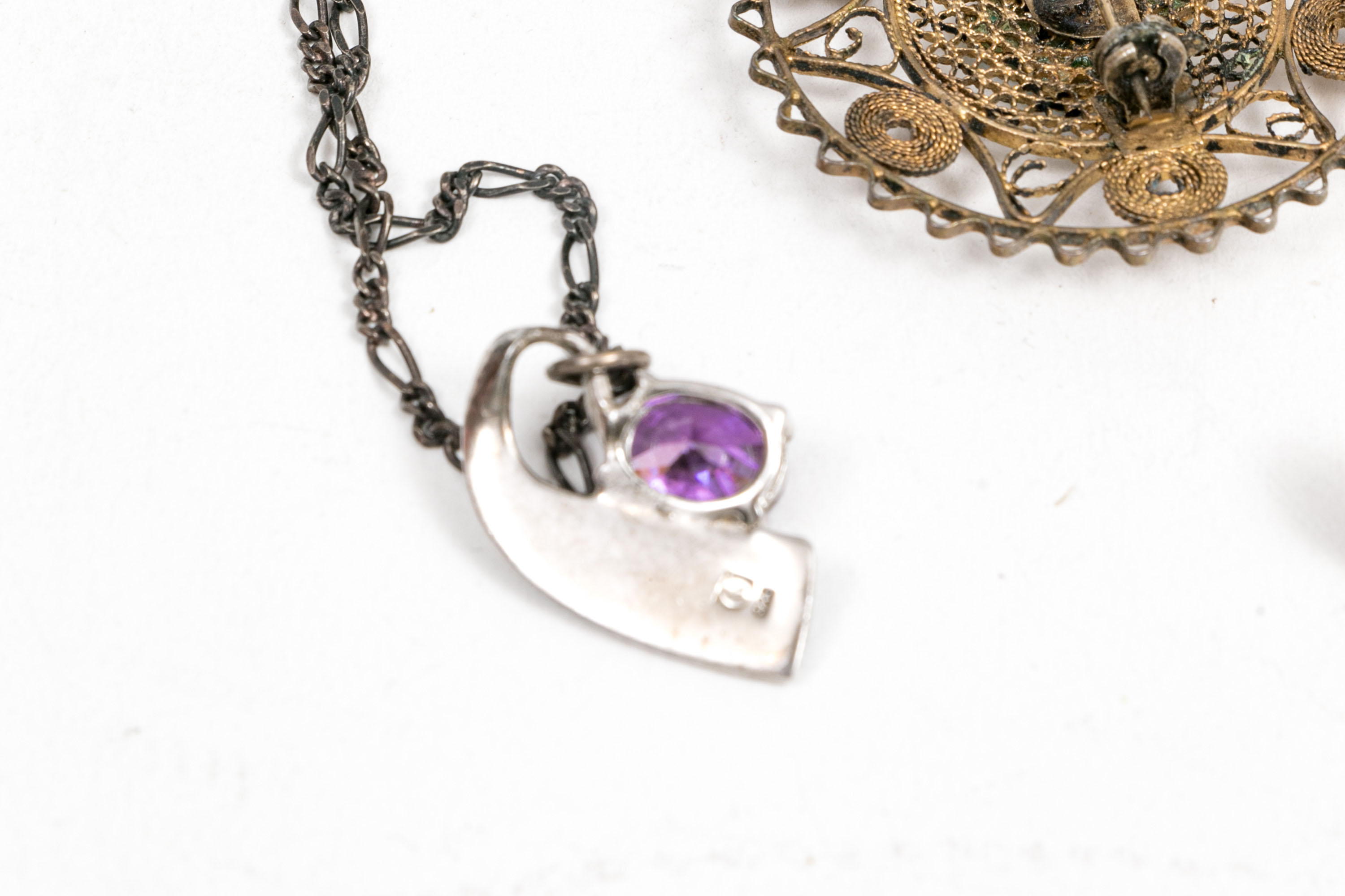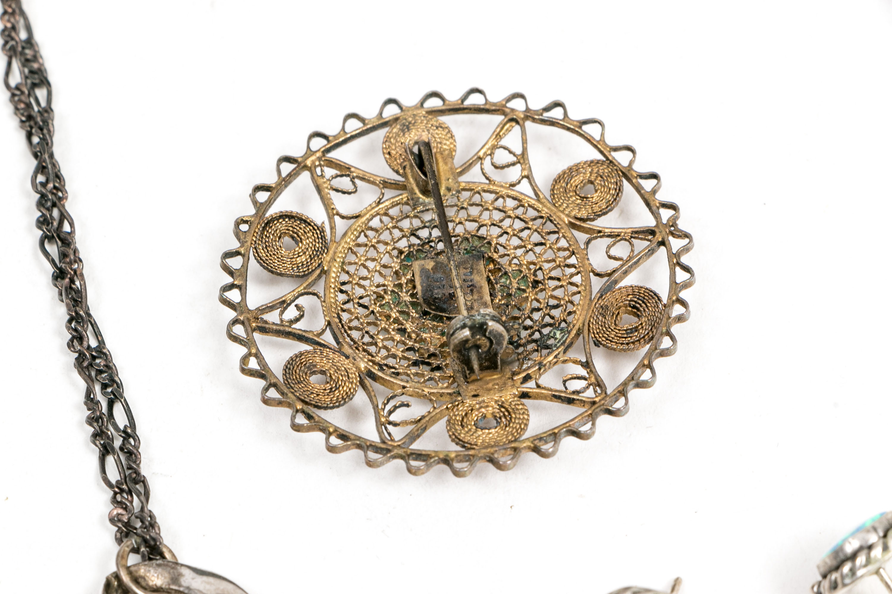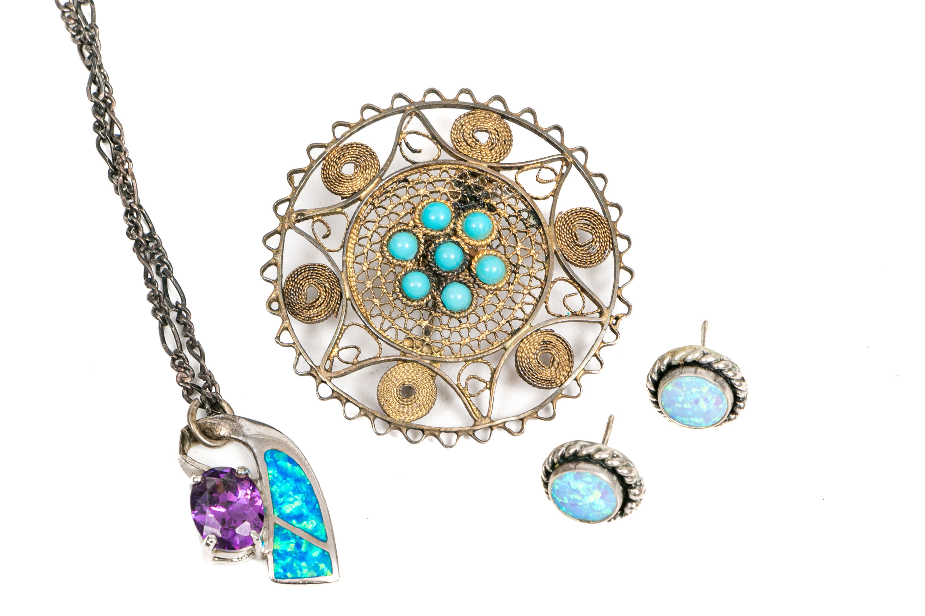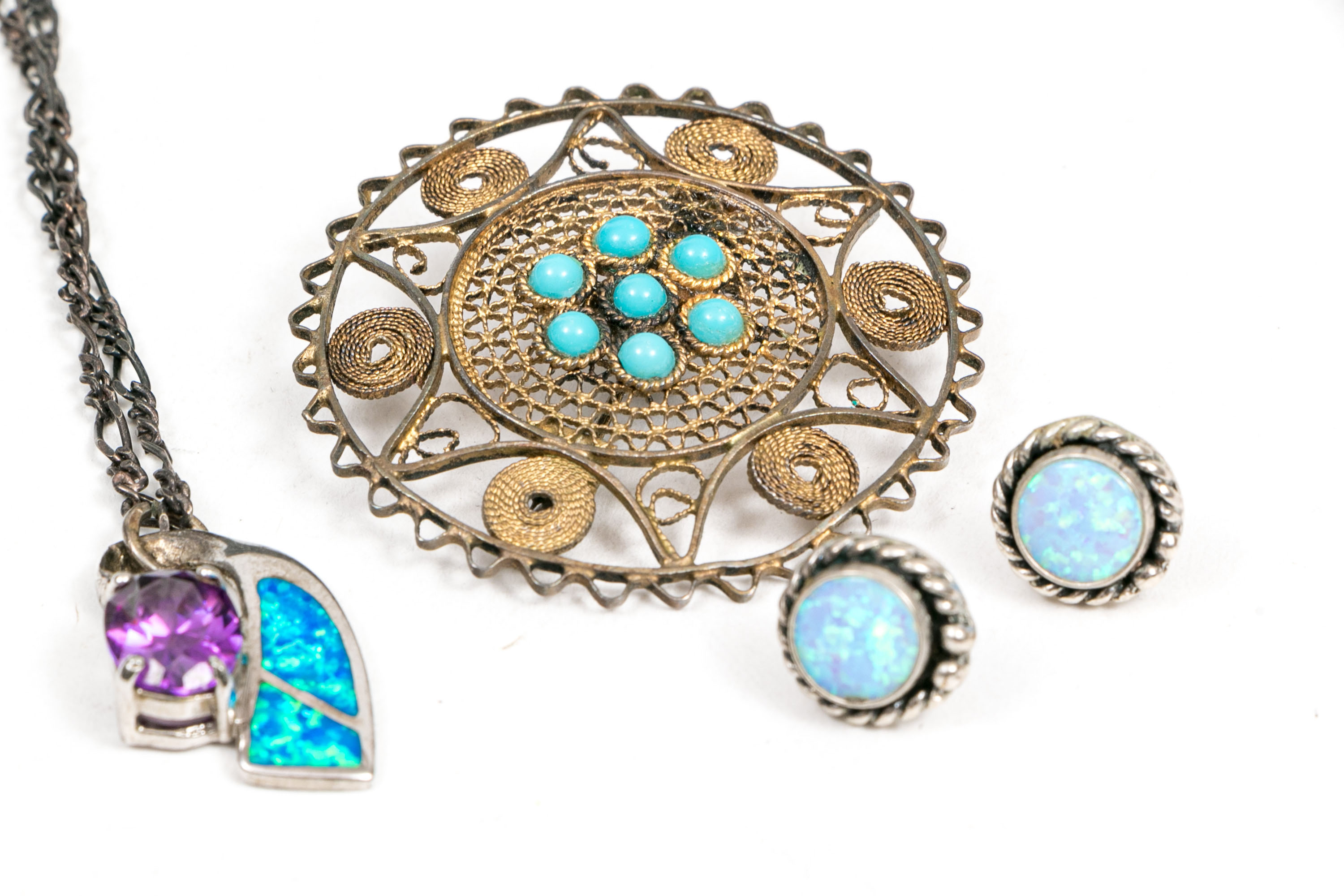 Sterling silver jewelry collection. A circular filigree brooch set with a cluster of turquoise stones at the center. Stud style earrings with white opal doublets, post backings. Chain necklace displaying opal inlay and amethyst, spring ring clasp.