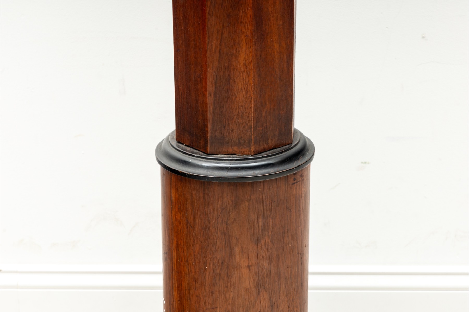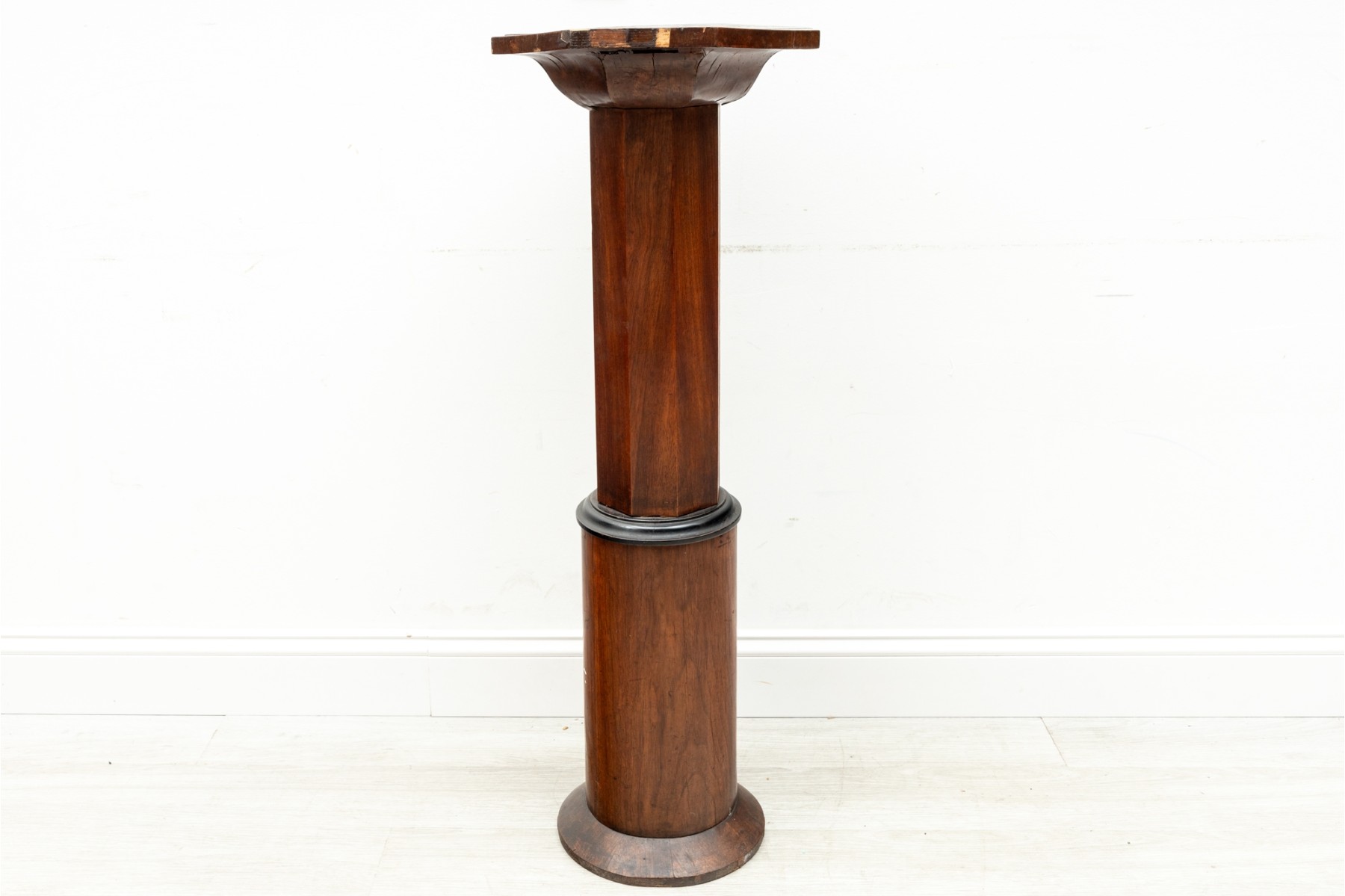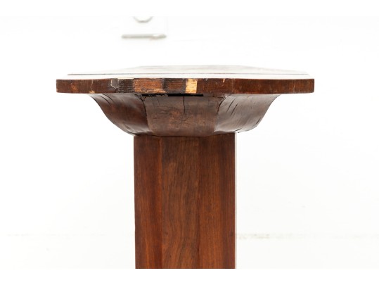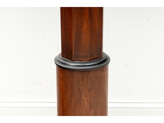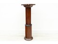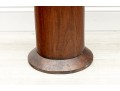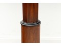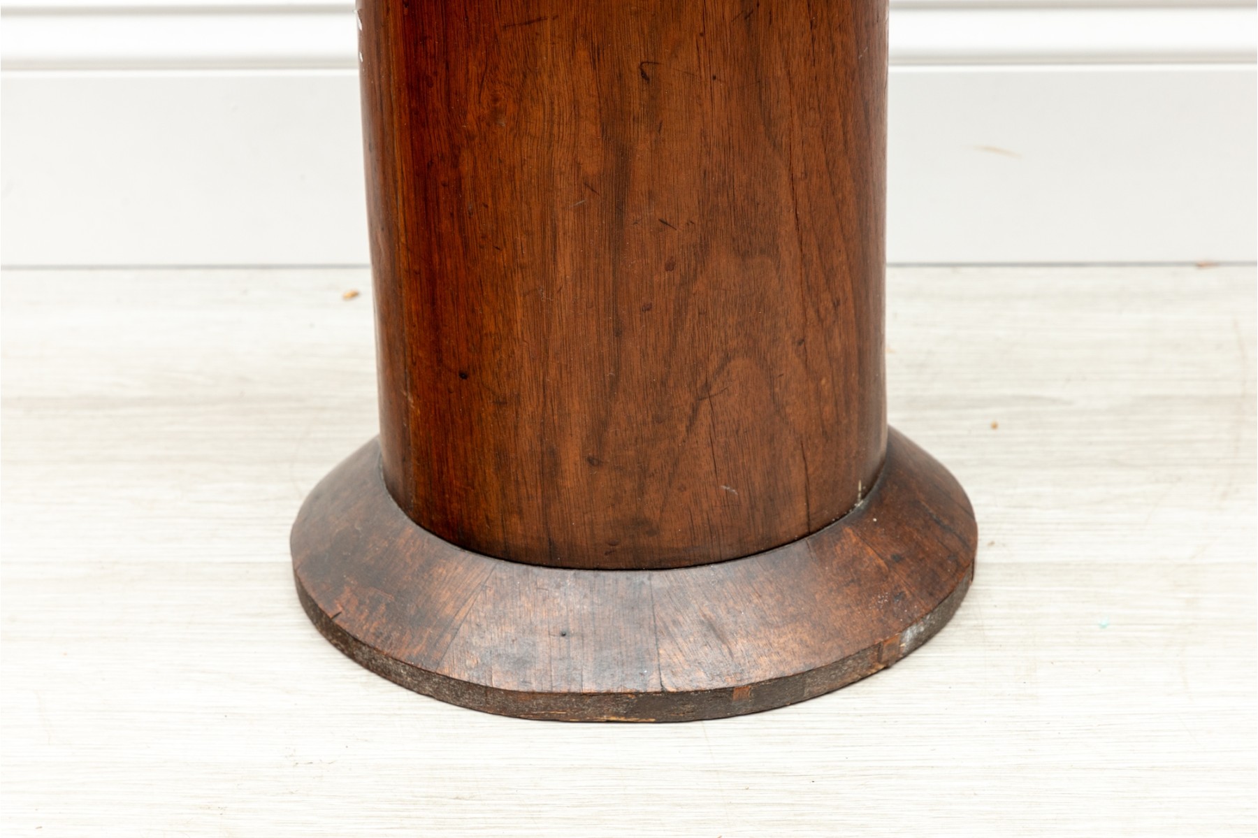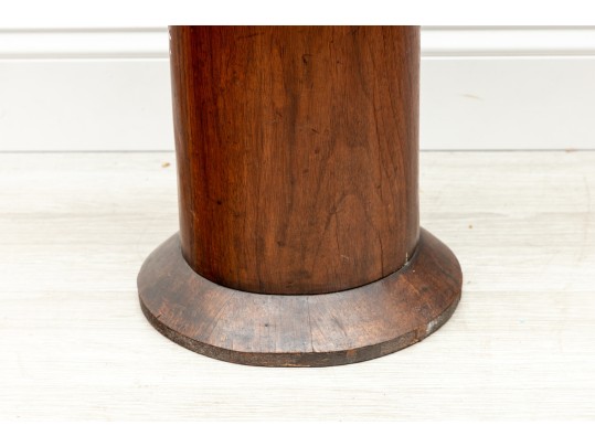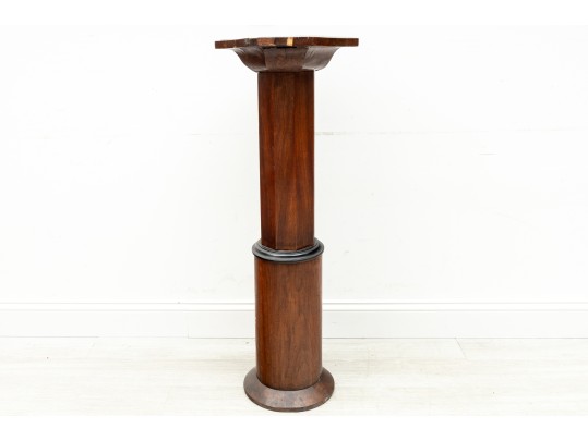 A simplistic, rounded wood pedestal column rich with veneers, and terminating on a flared base.