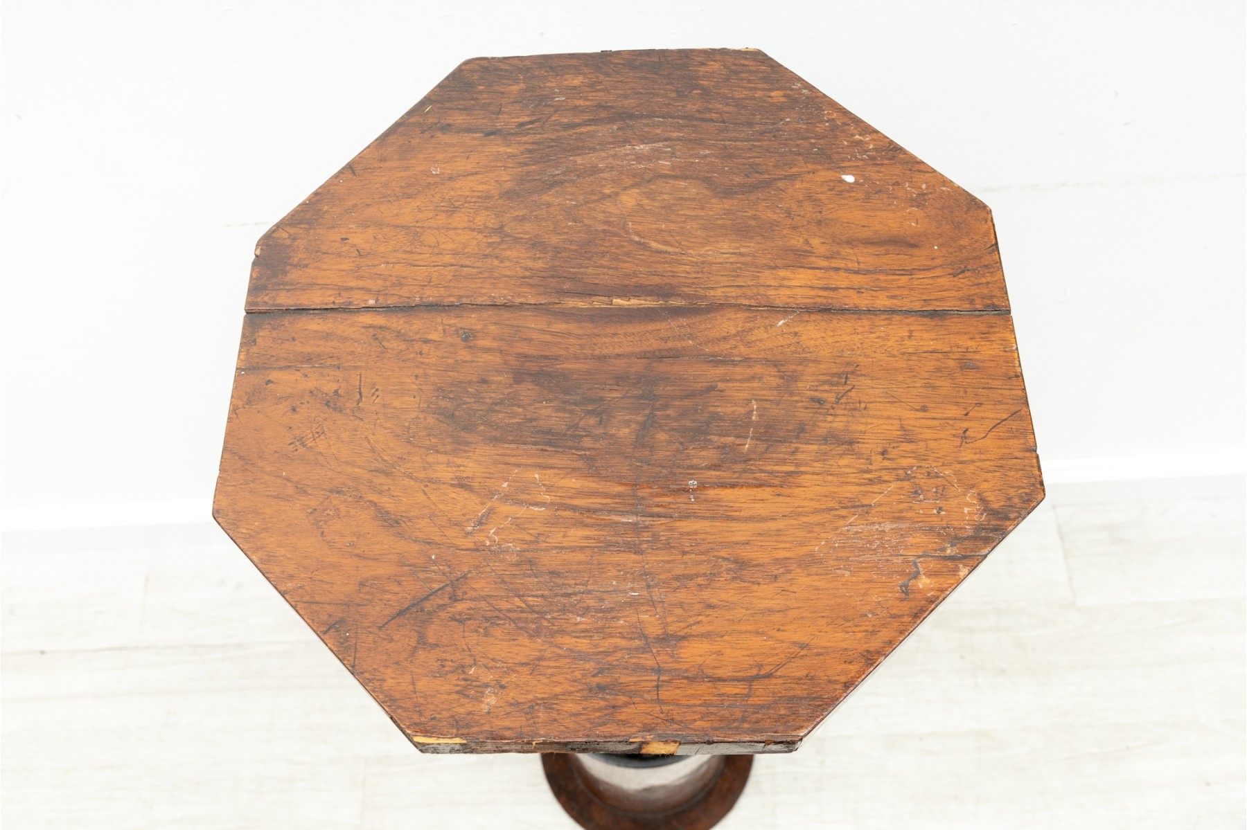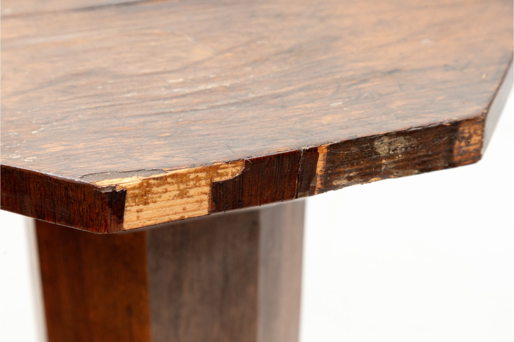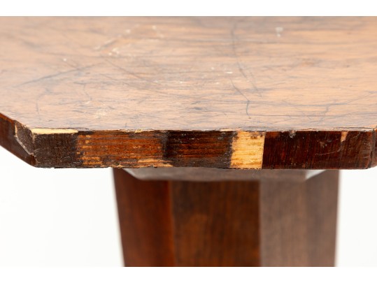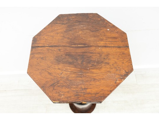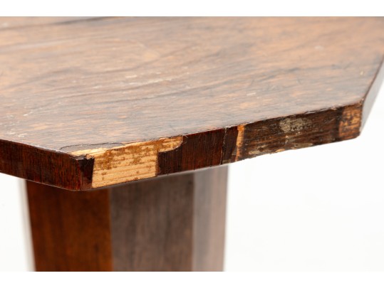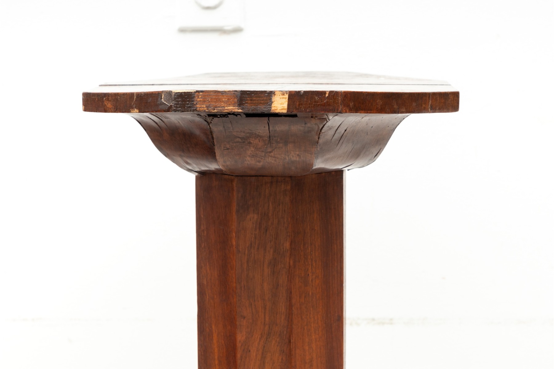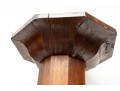 A simplistic, rounded wood pedestal column rich with veneers, and terminating on a flared base.