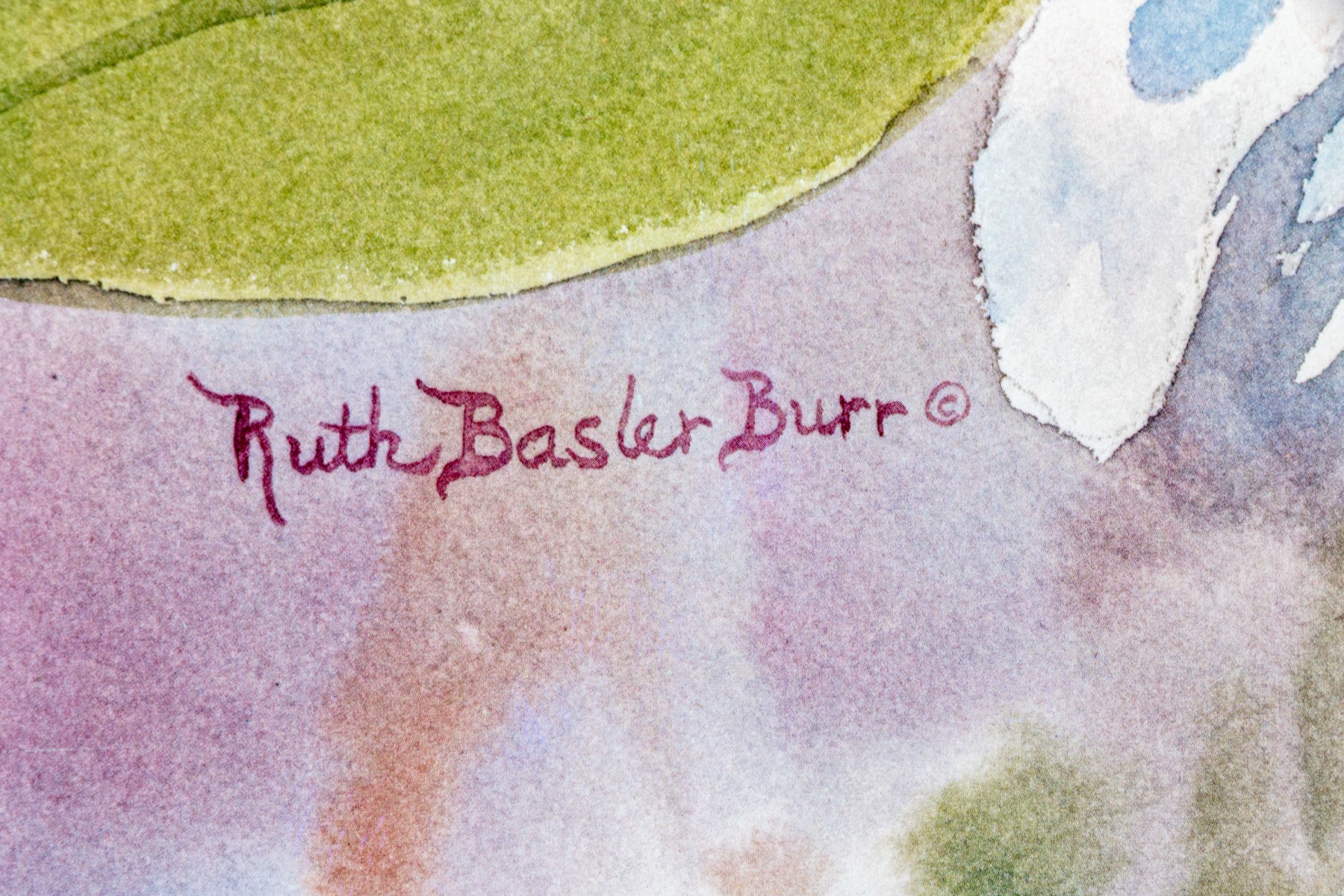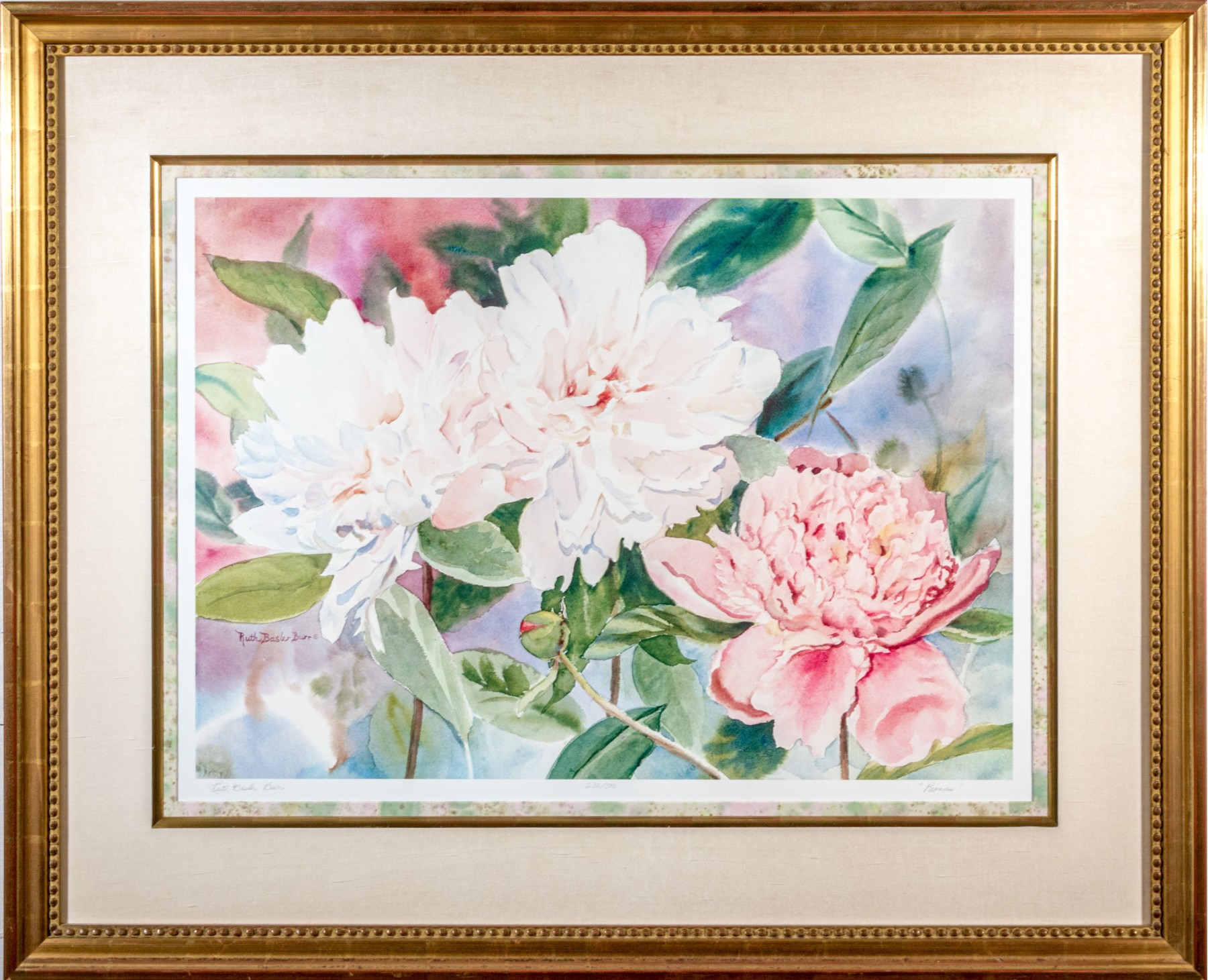 A beautiful original lithograph by American artist Ruth Basler Burr. Nice mute color pallet with thick custom mat and gold 1/4 molding liner with linen surround. The custom beaded frame finished with real gold leaf., probably a $700-800 framing job in today's market. Very impressive!