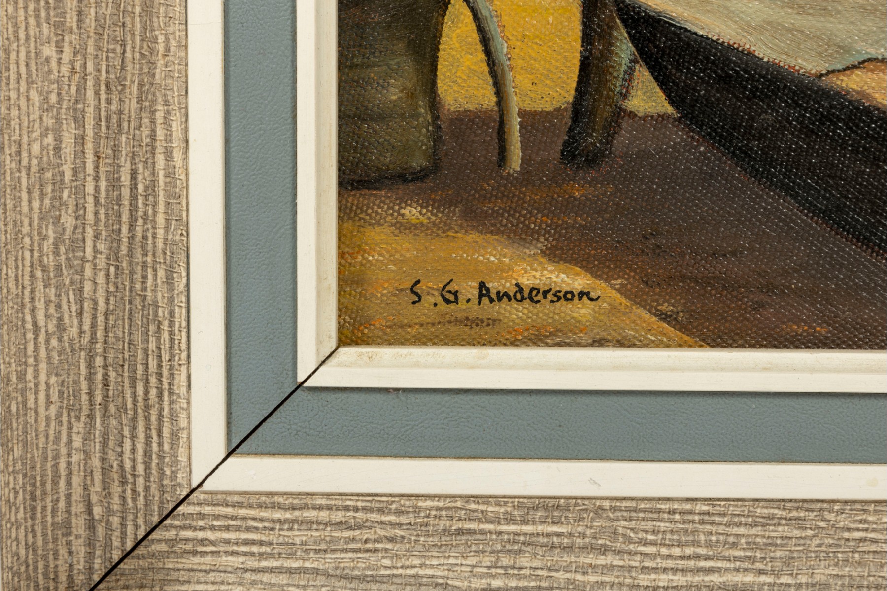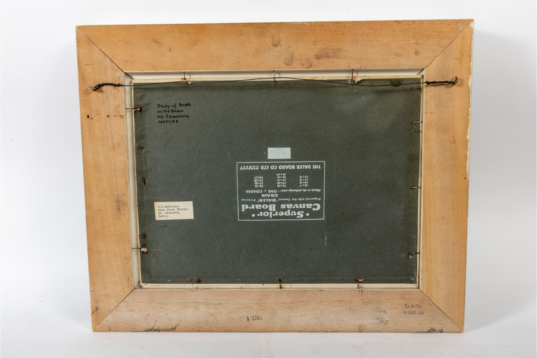 A small oil on canvas board painting entitled, "Study of Boats on the Beach" by American artist S.G. Anderson. Inspired by Via Francesco Caracciolo of Naples, Italy. The painting is displayed openly in a stylized wood frame.
