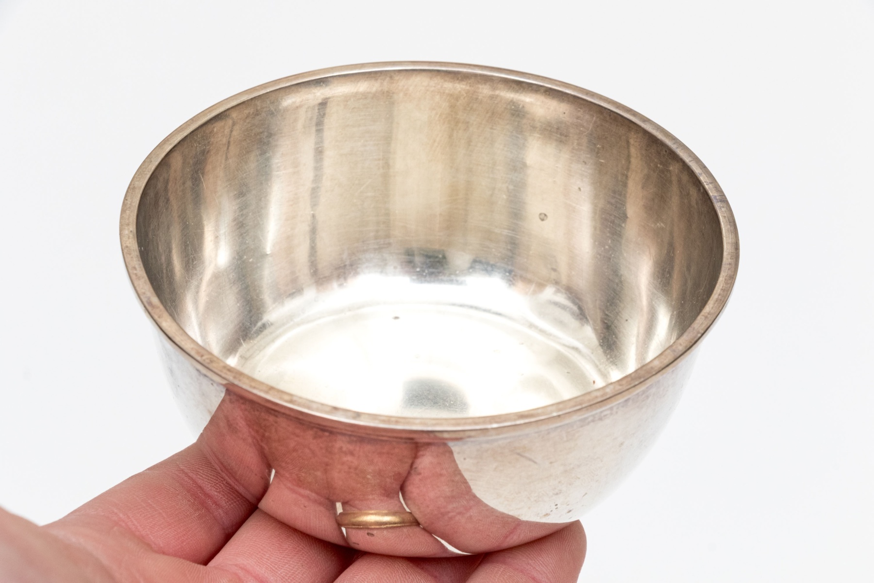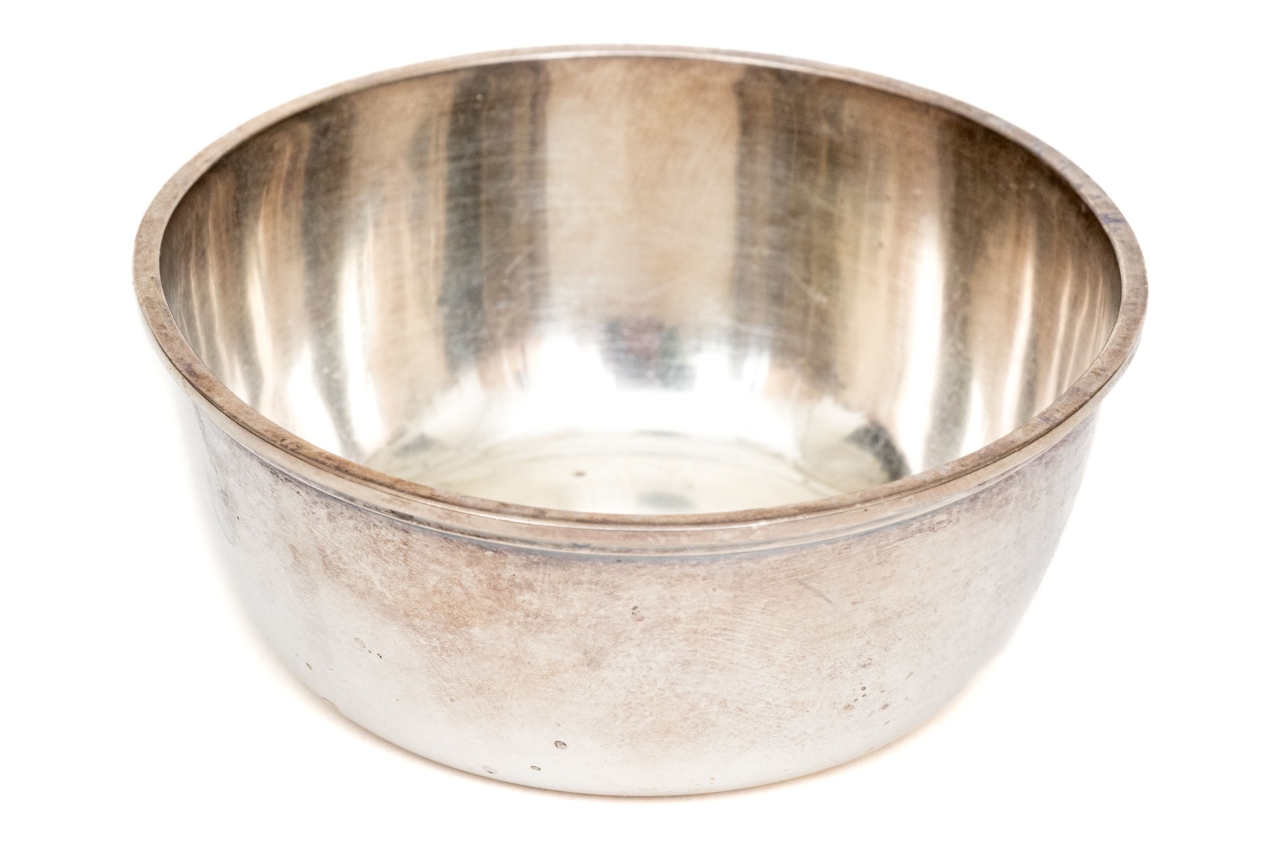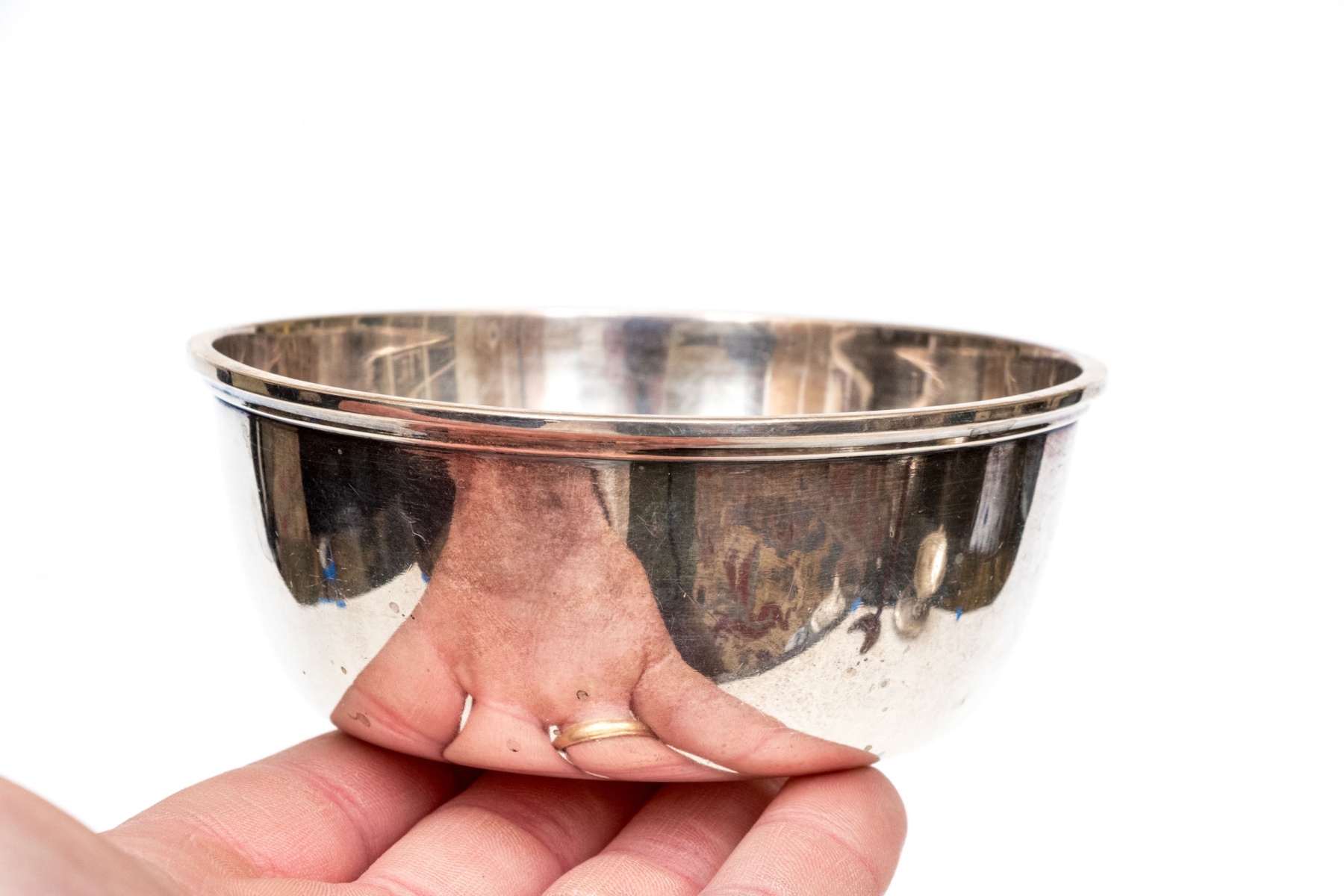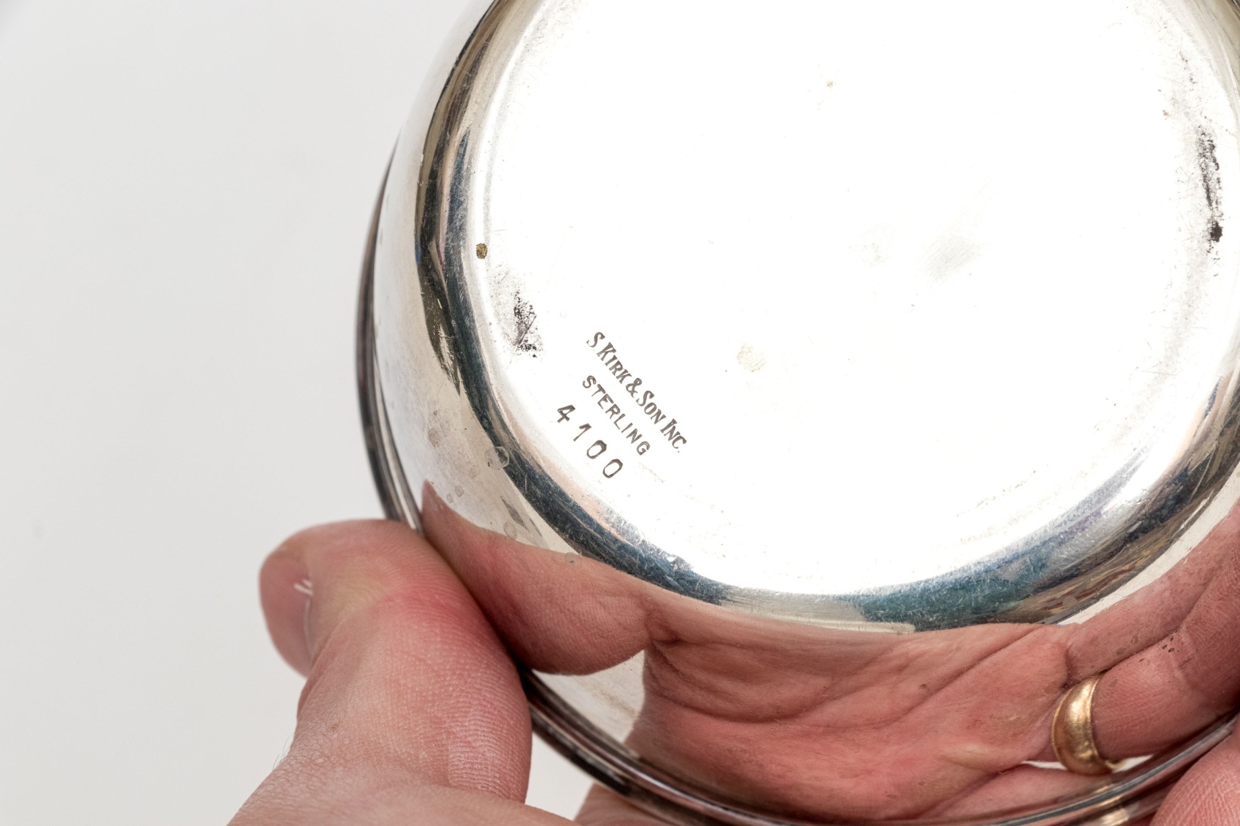 A charming S. Kirk & Son sterling silver bowl with a sleek and minimalist form subtly decorated with a tiered band around the rim and finished with a flat foot. Marked underfoot.