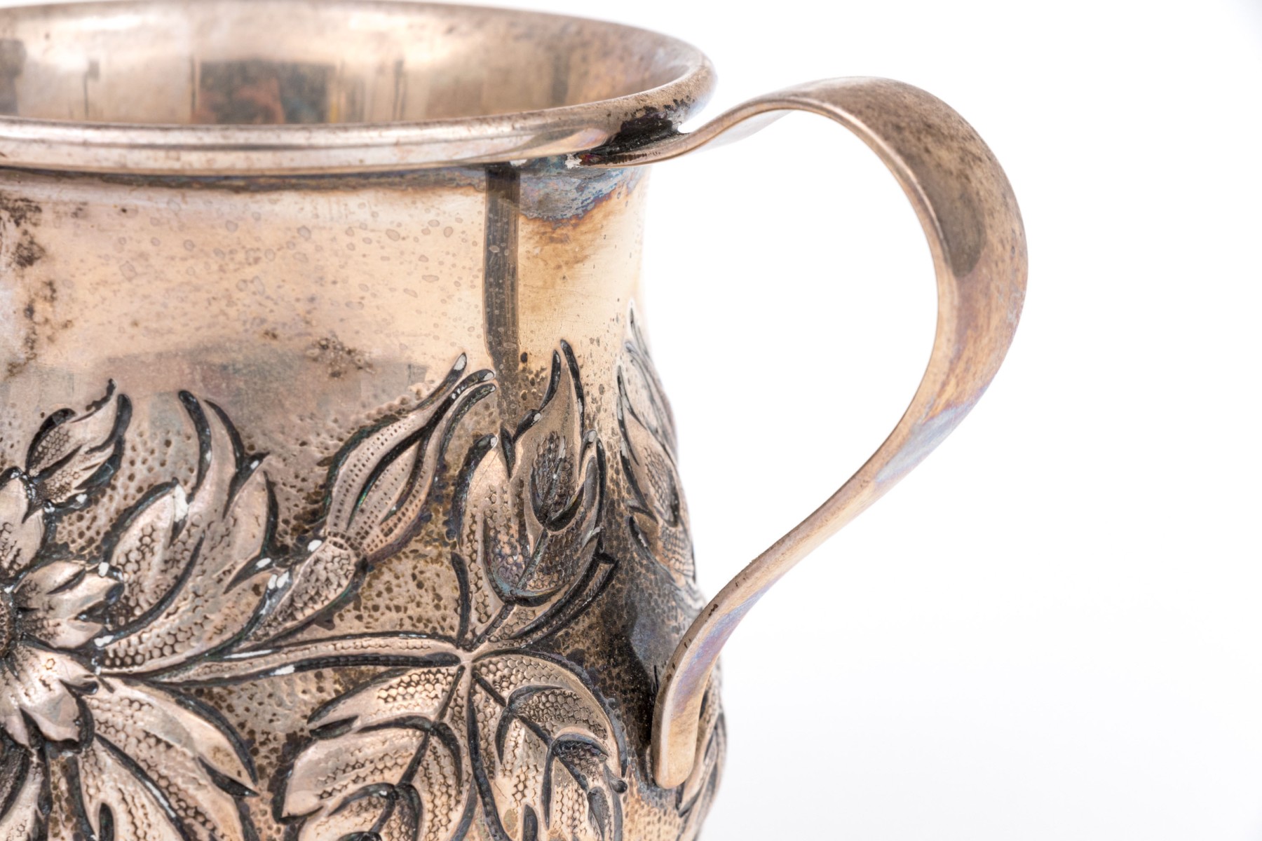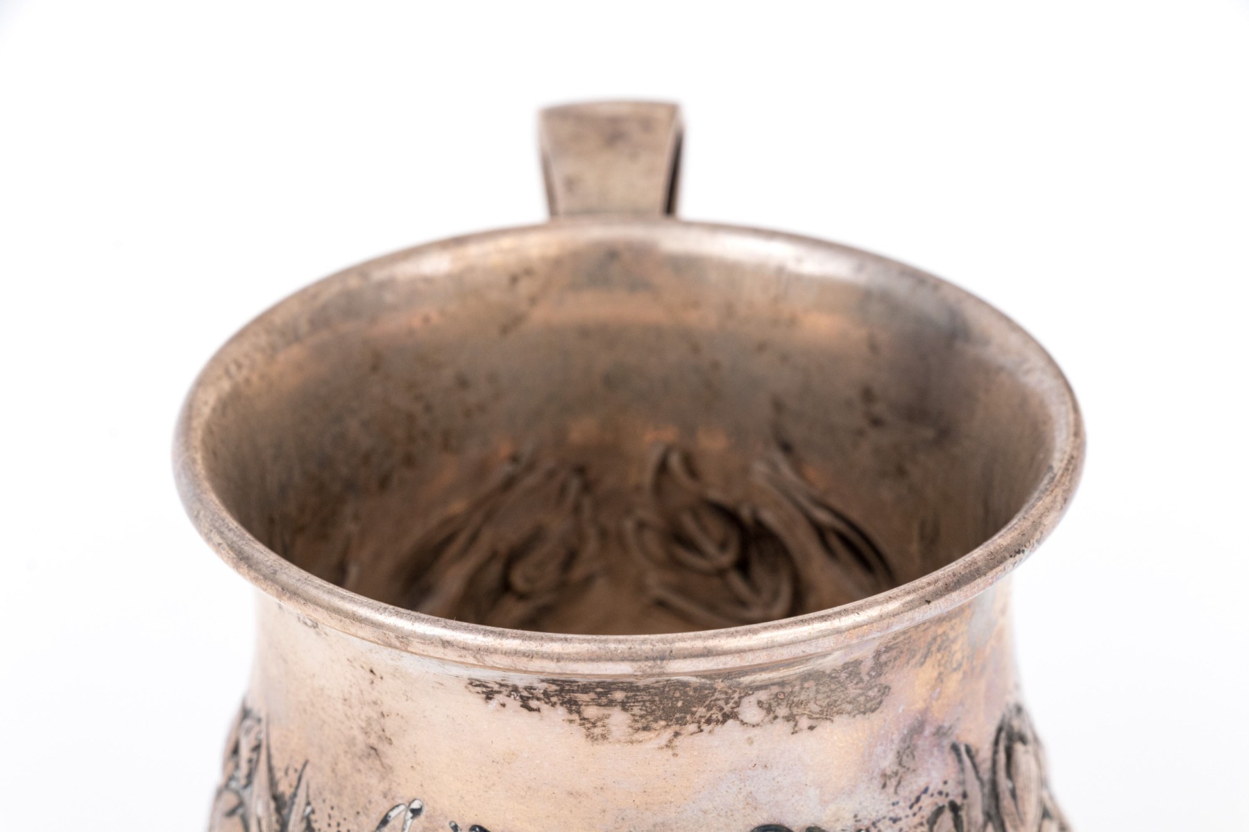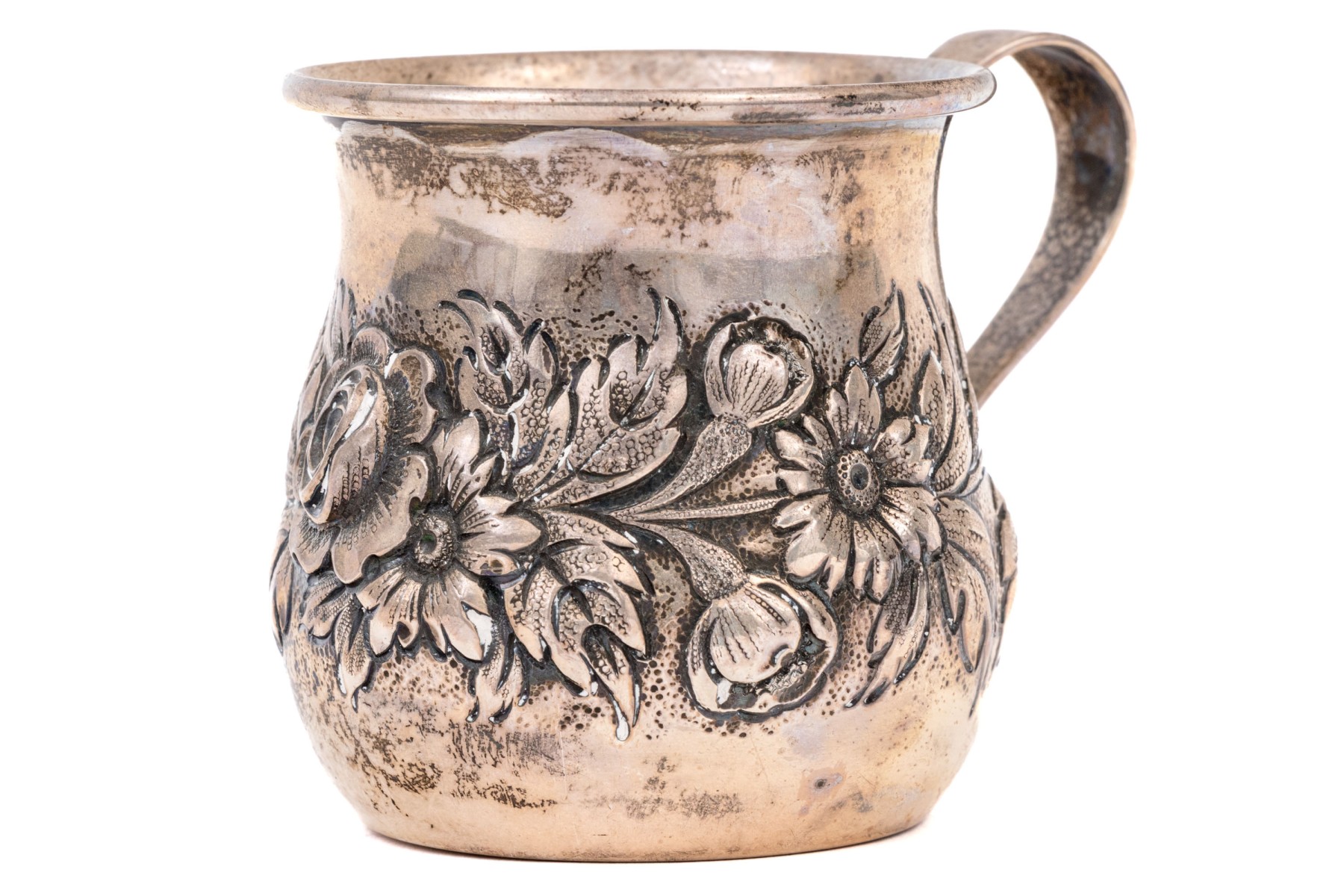 Hand decorated. A lovely cup with a fine wide repousse floral and leafy band, rolled rim and shaped handle.