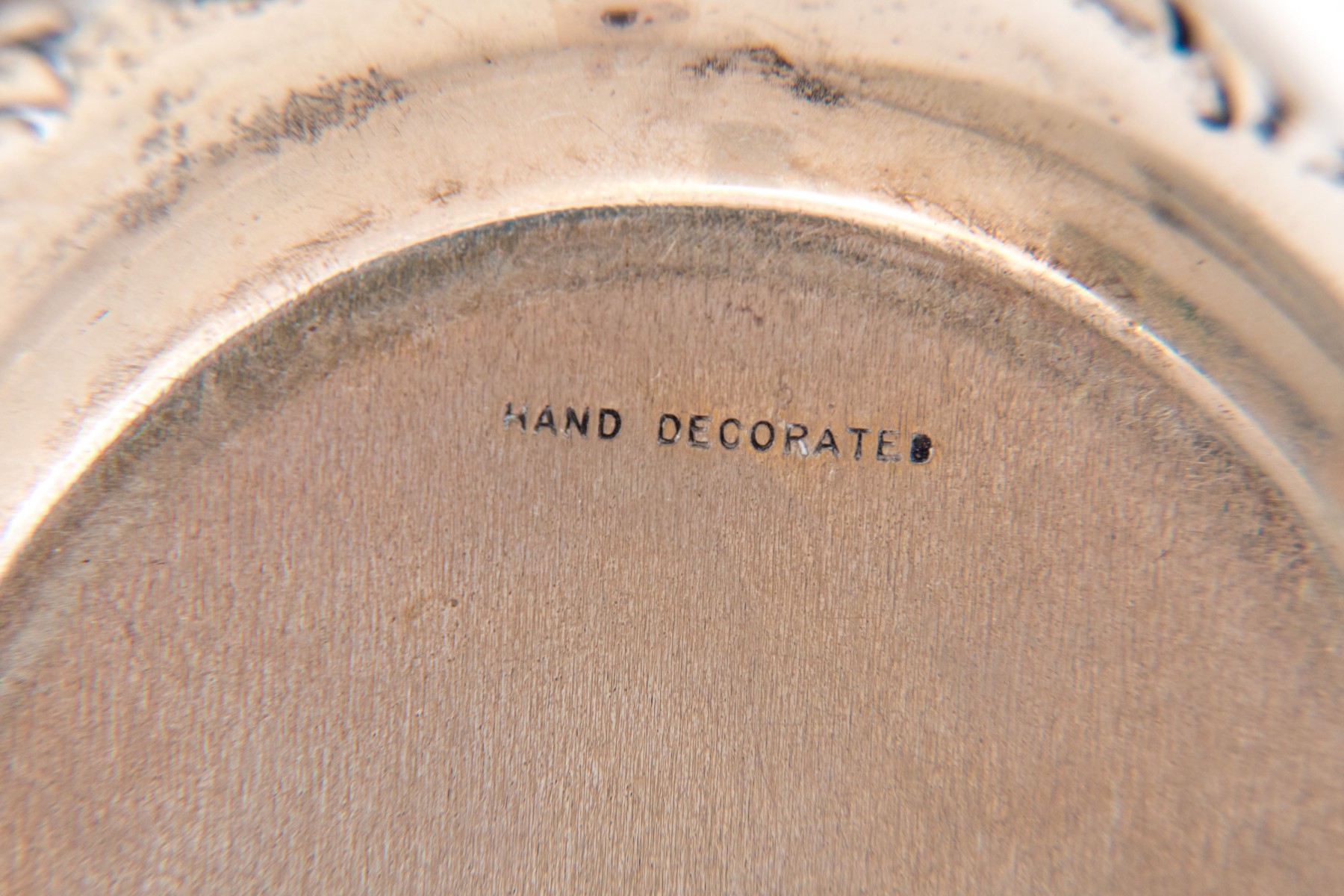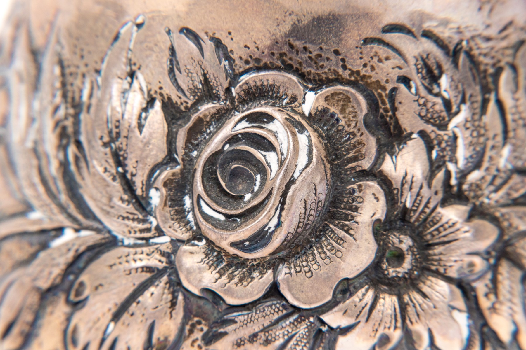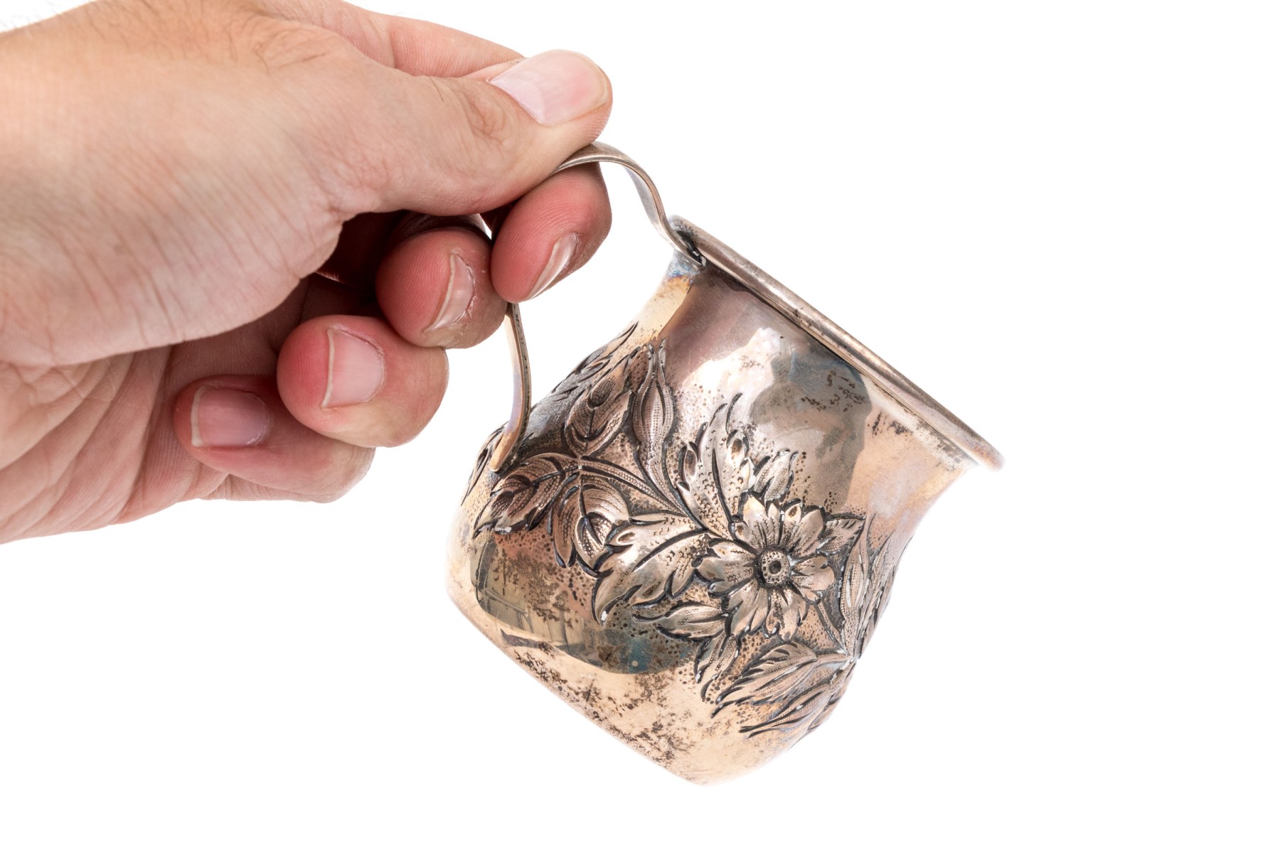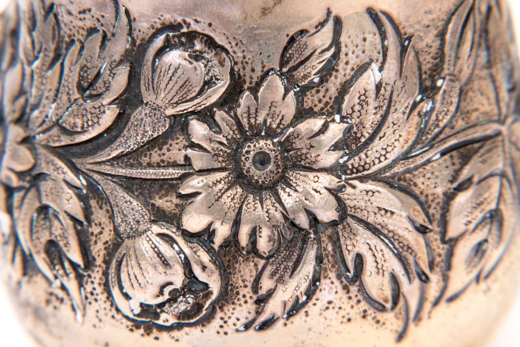 Hand decorated. A lovely cup with a fine wide repousse floral and leafy band, rolled rim and shaped handle.