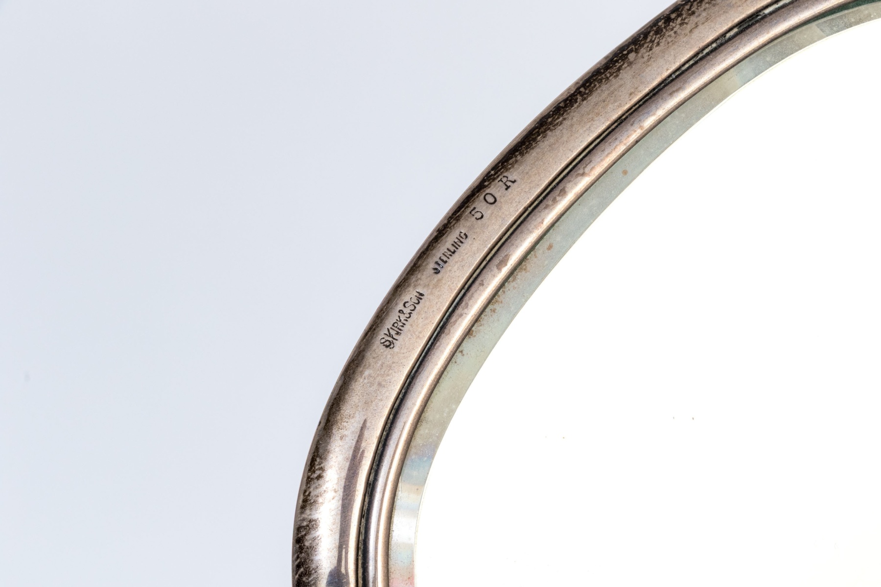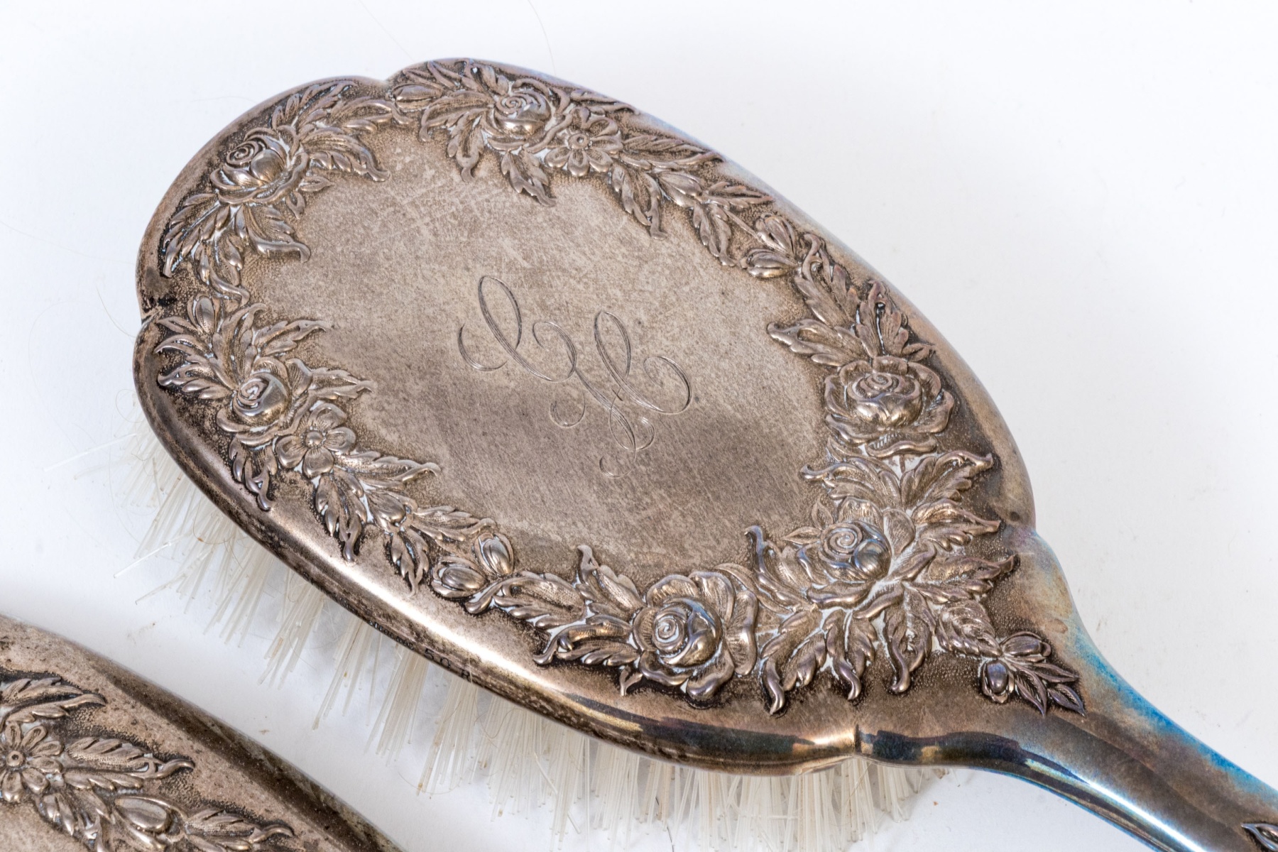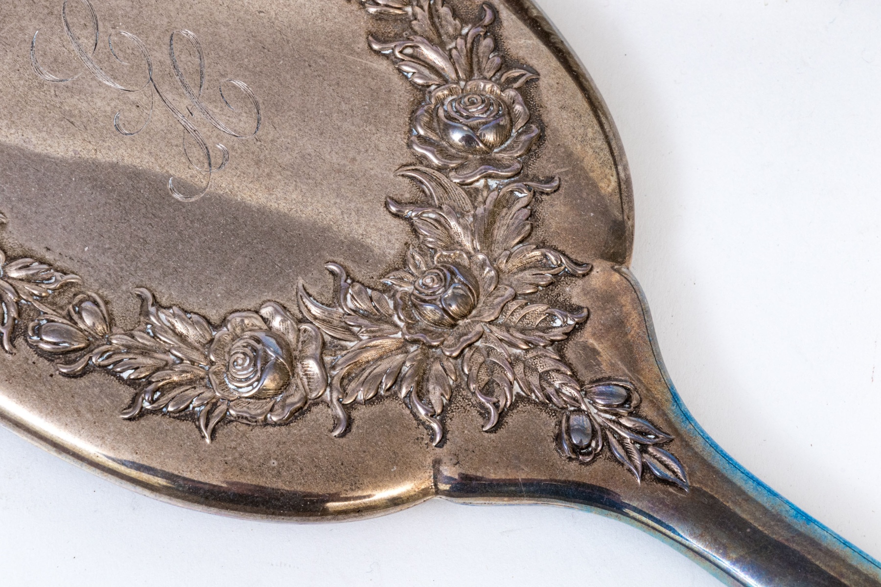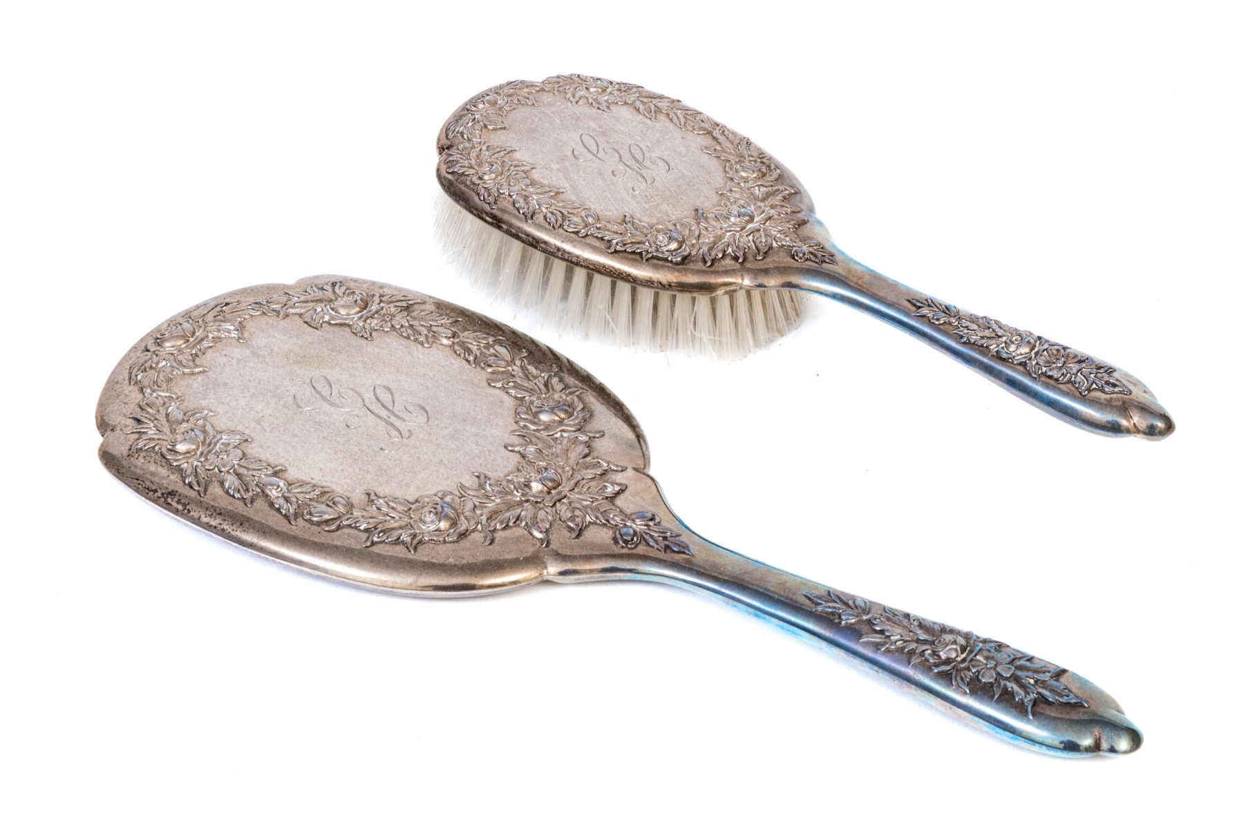 A charming duo of S. Kirk & Sons sterling silver vanity accessories including a hand mirror and a hand brush. Backs are beautifully decorated with floral wreaths surrounding central monograms and gently tapered and rounded handles with additional foliate relief.