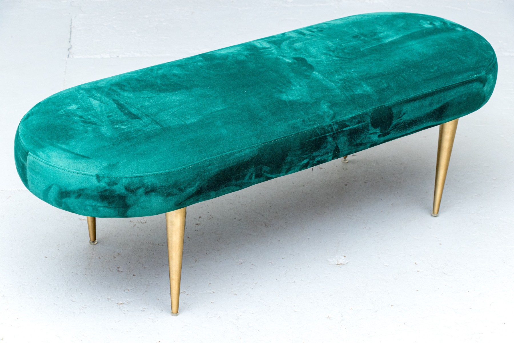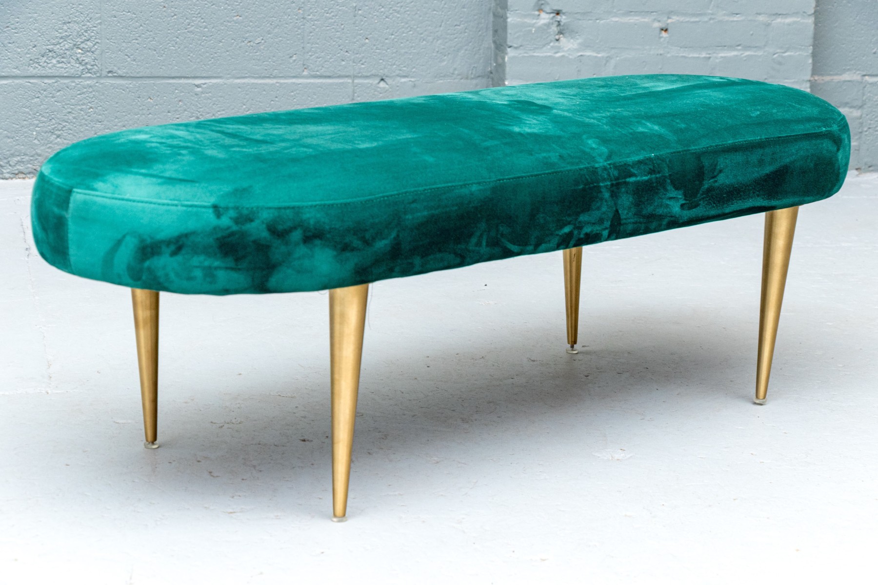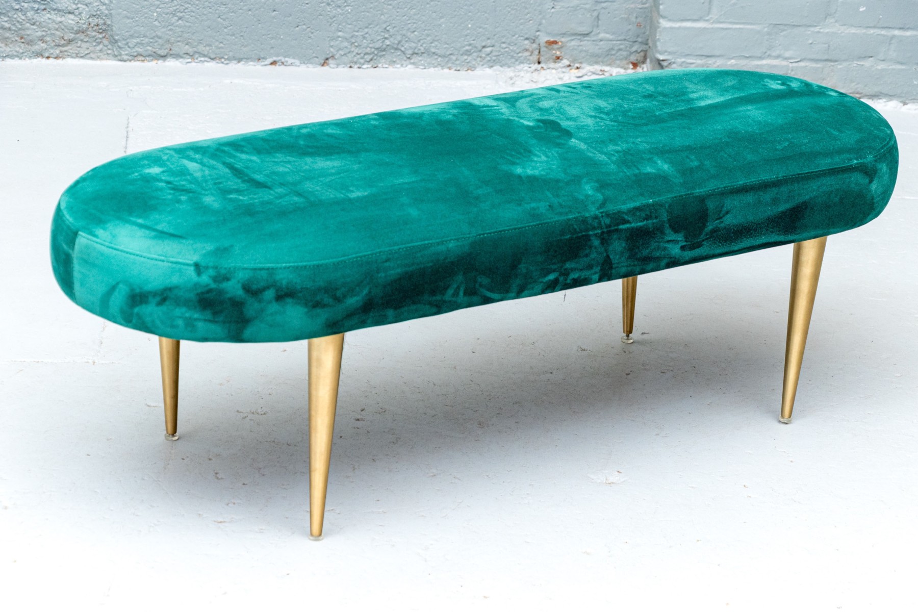 Perfect for placement in front of a large window, or at the end of a bed or elsewhere of your choosing. The oval bench stands on four cylindrical tapered legs with oval seat cushion with wonderful emerald green upholstery.