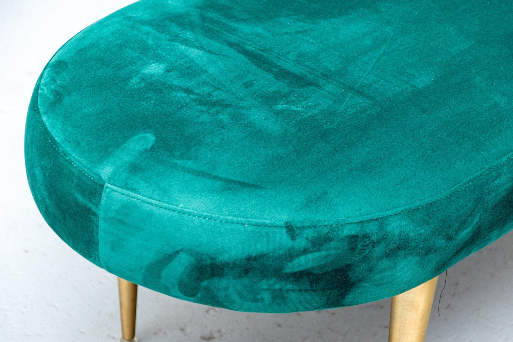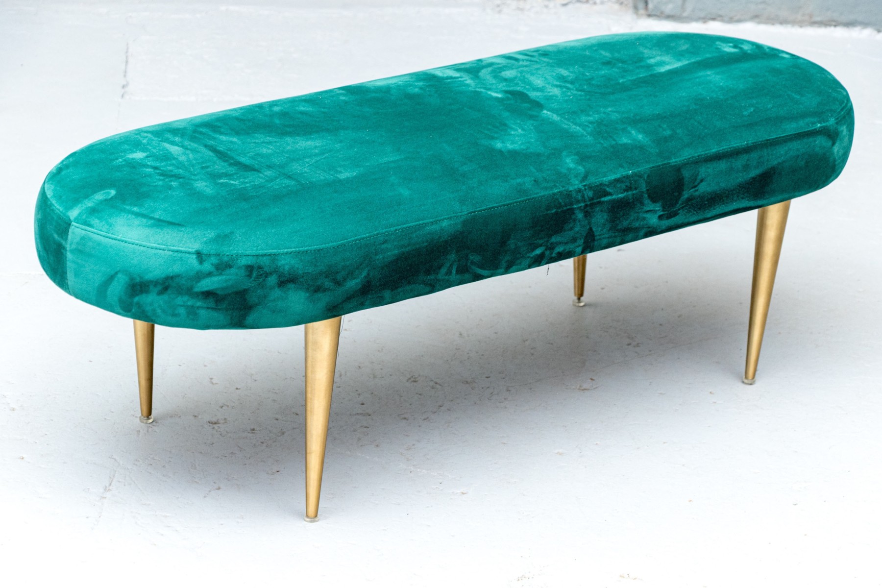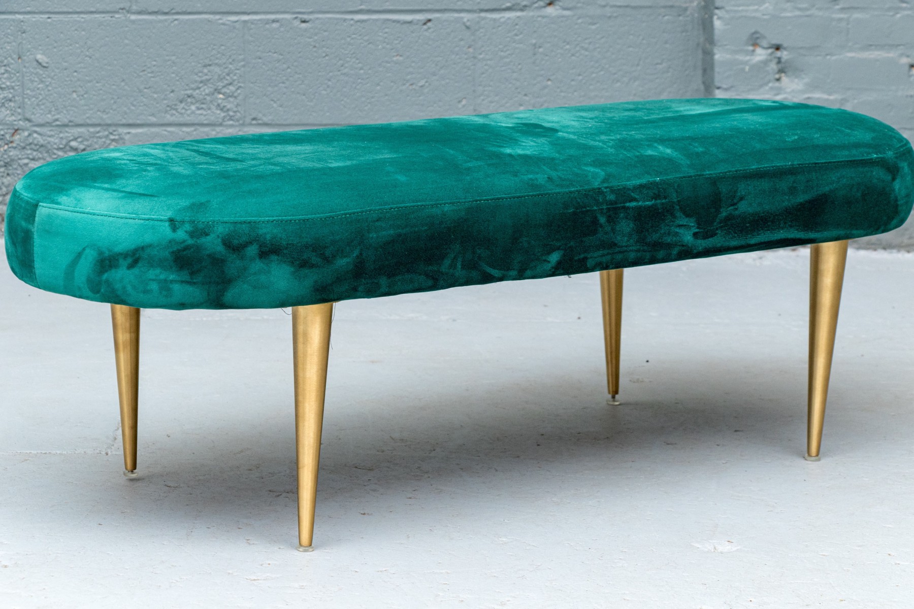 Perfect for placement in front of a large window, or at the end of a bed or elsewhere of your choosing. The oval bench stands on four cylindrical tapered legs with oval seat cushion with wonderful emerald green upholstery.