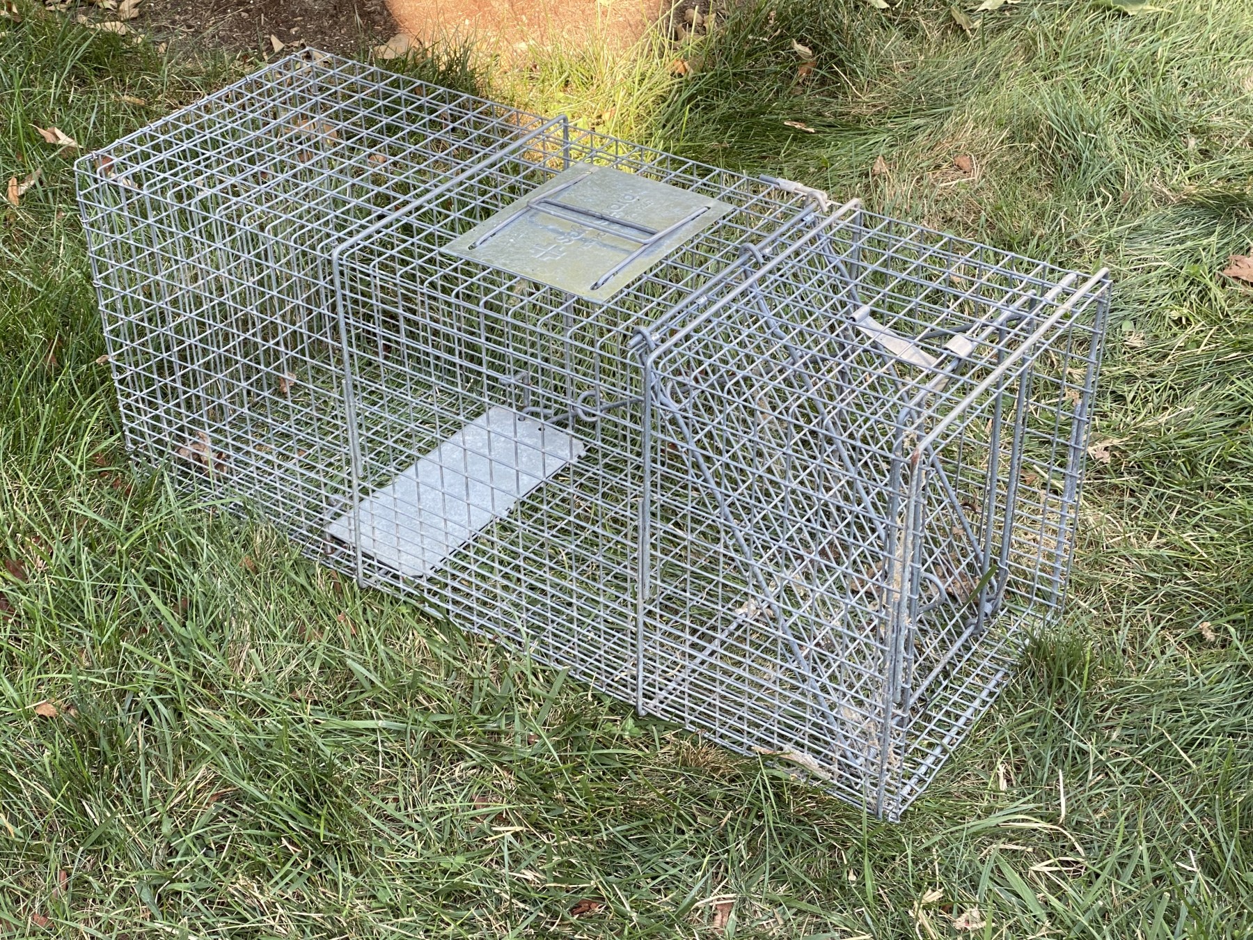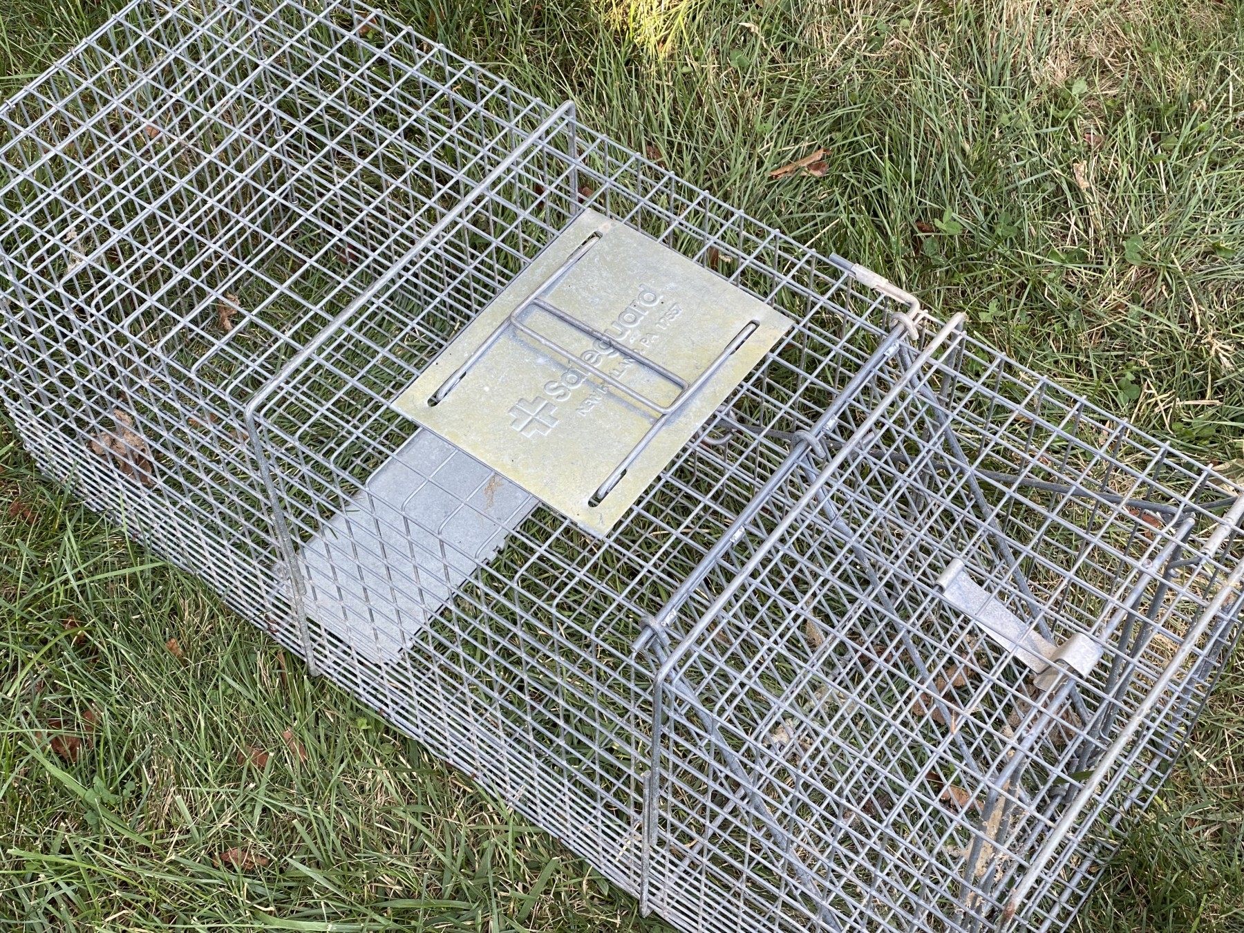 A rectangular Safeguard animal trap with two handles to the top and a trap door to one end.