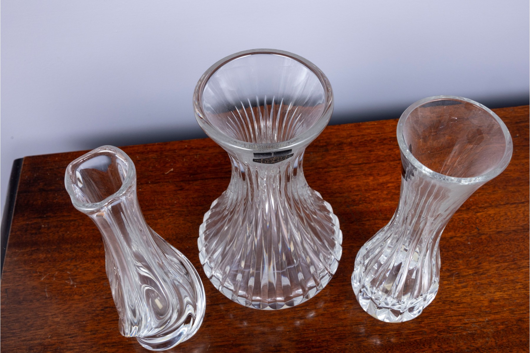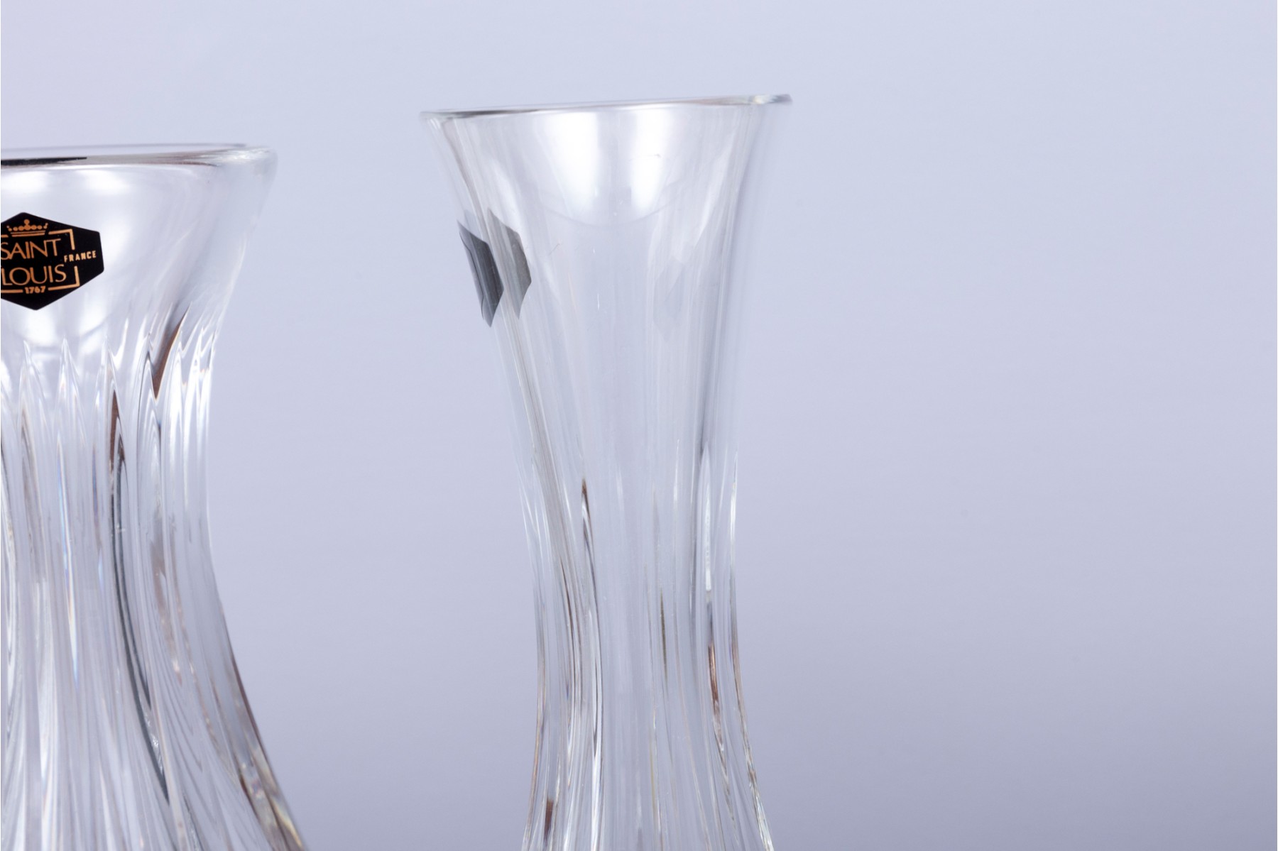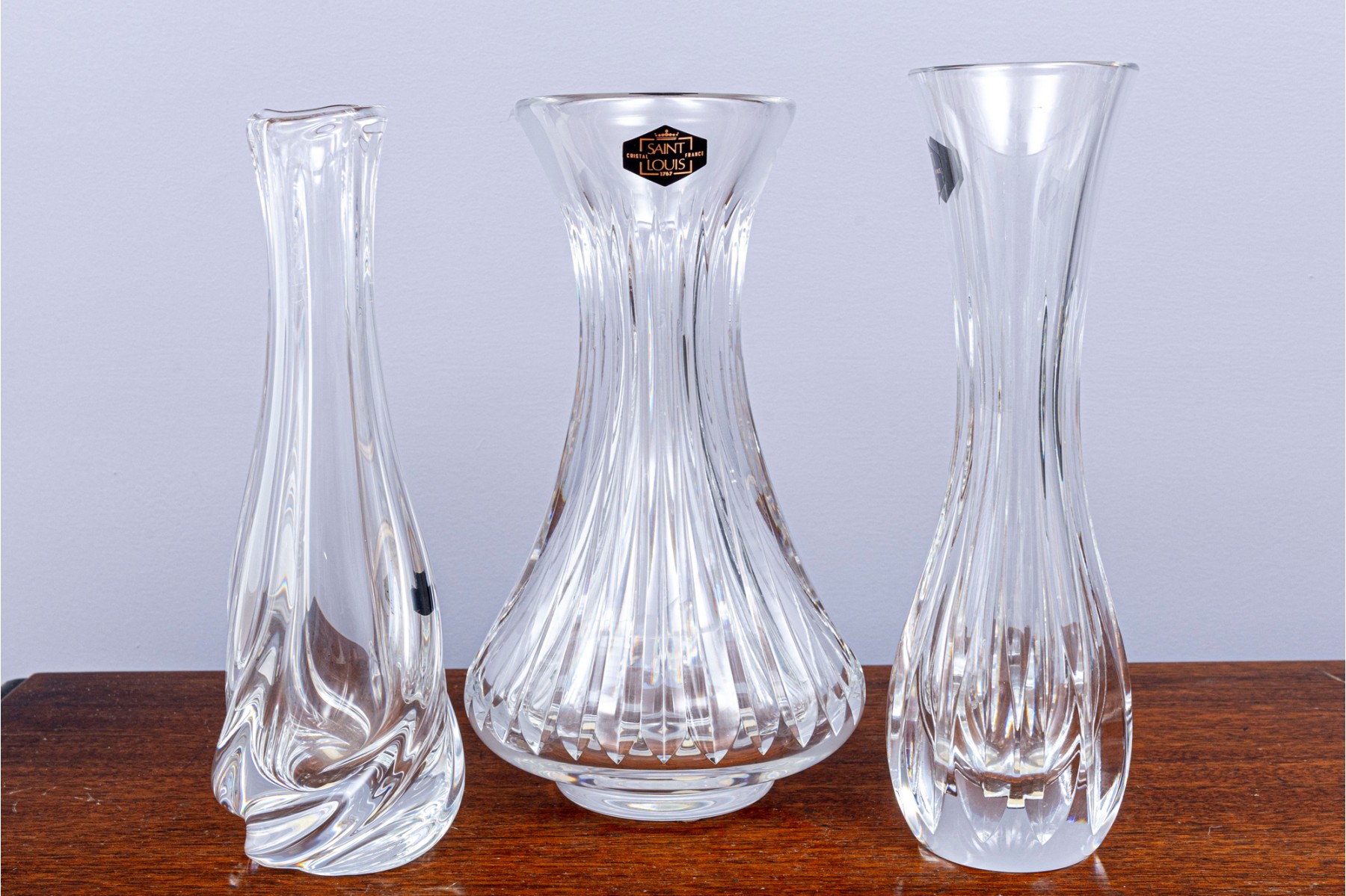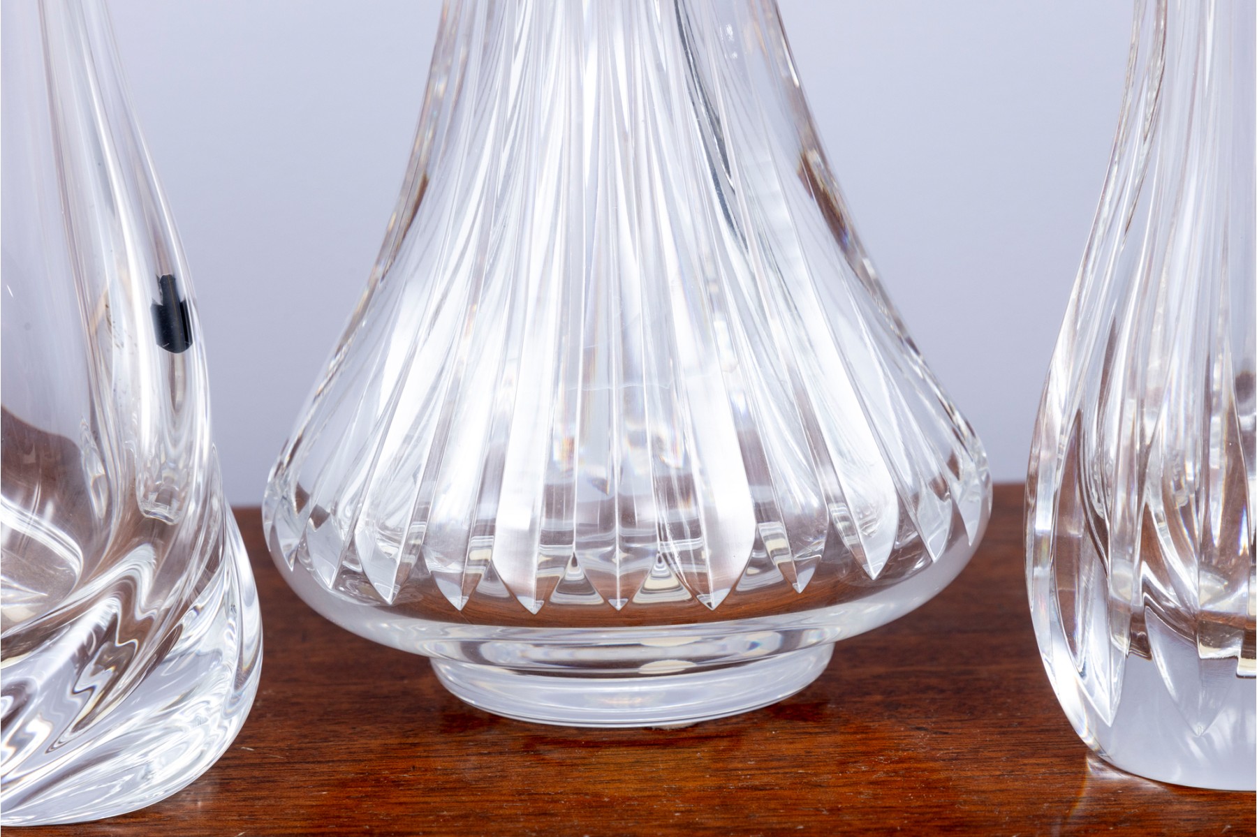 A wonderful trio of Saint Louis French crystal vases with similar hourglass figures. Two feature elegant cut designs, while the third sports a striking swirled form.