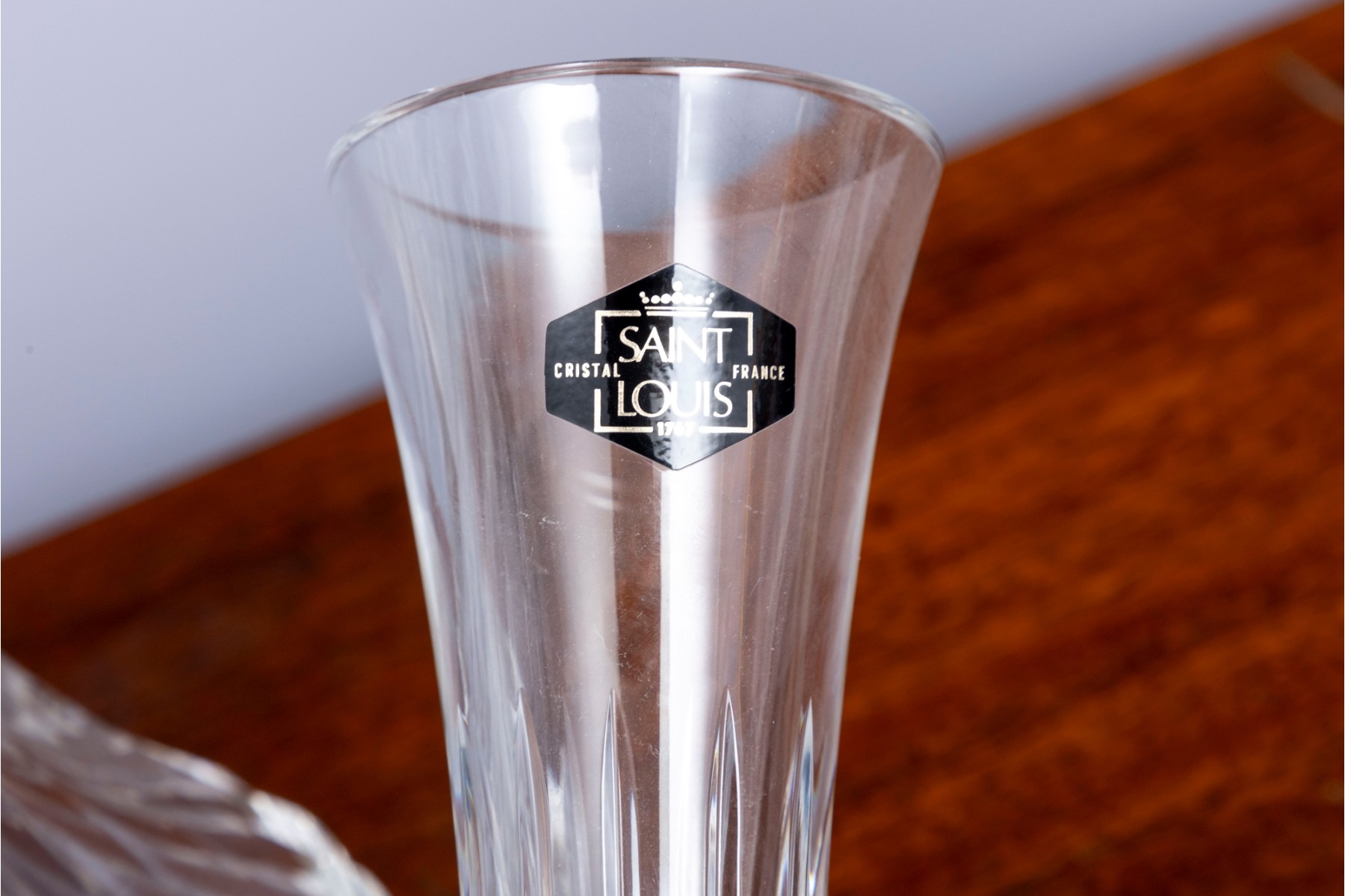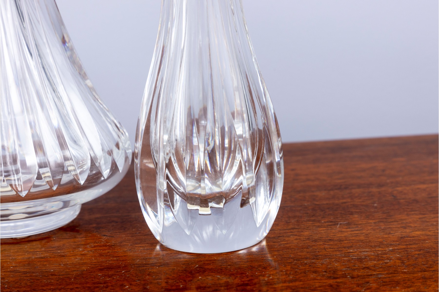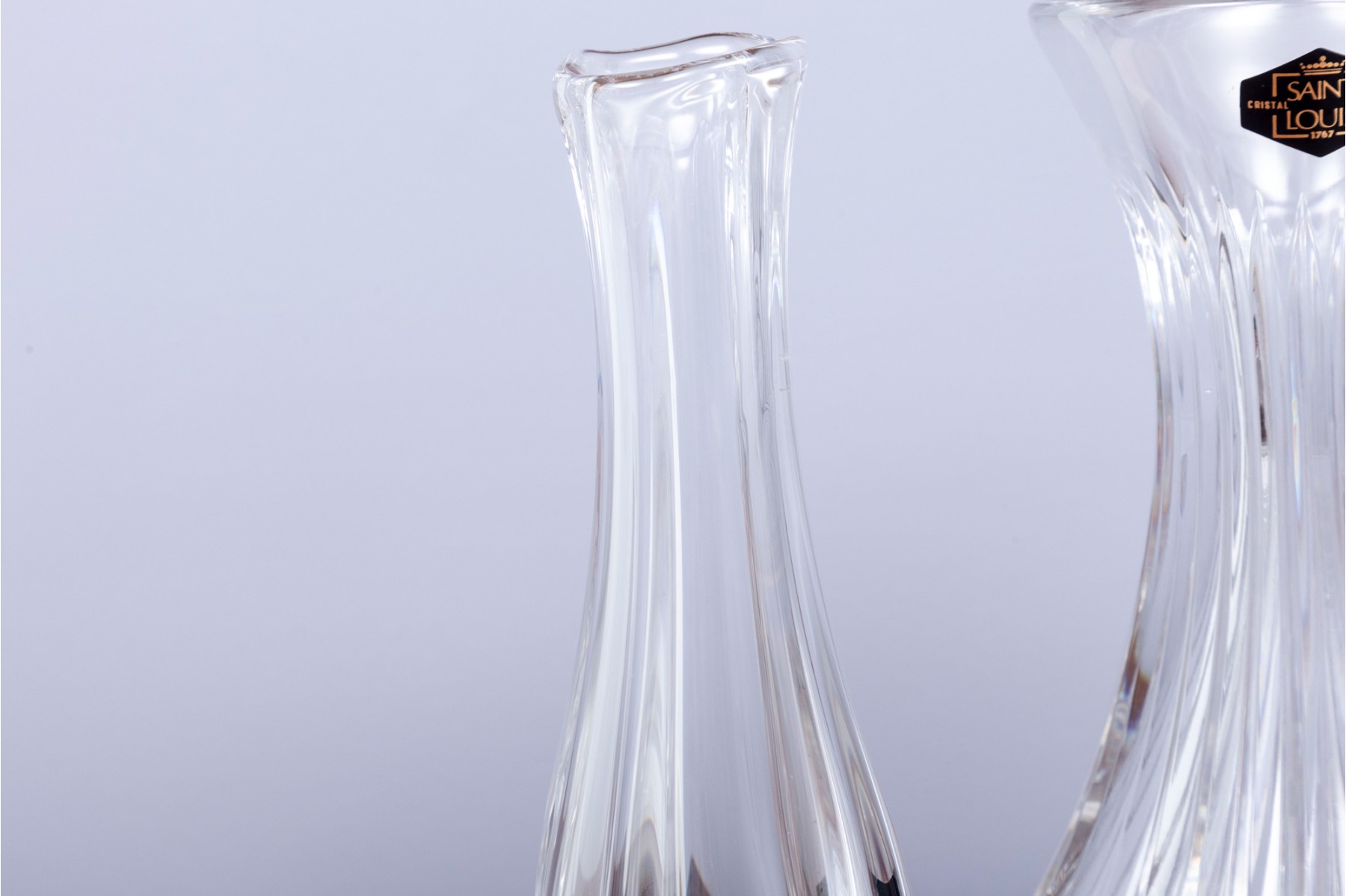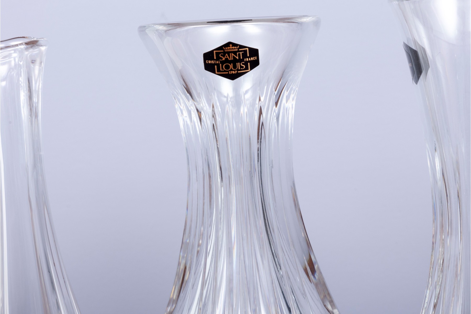 A wonderful trio of Saint Louis French crystal vases with similar hourglass figures. Two feature elegant cut designs, while the third sports a striking swirled form.
