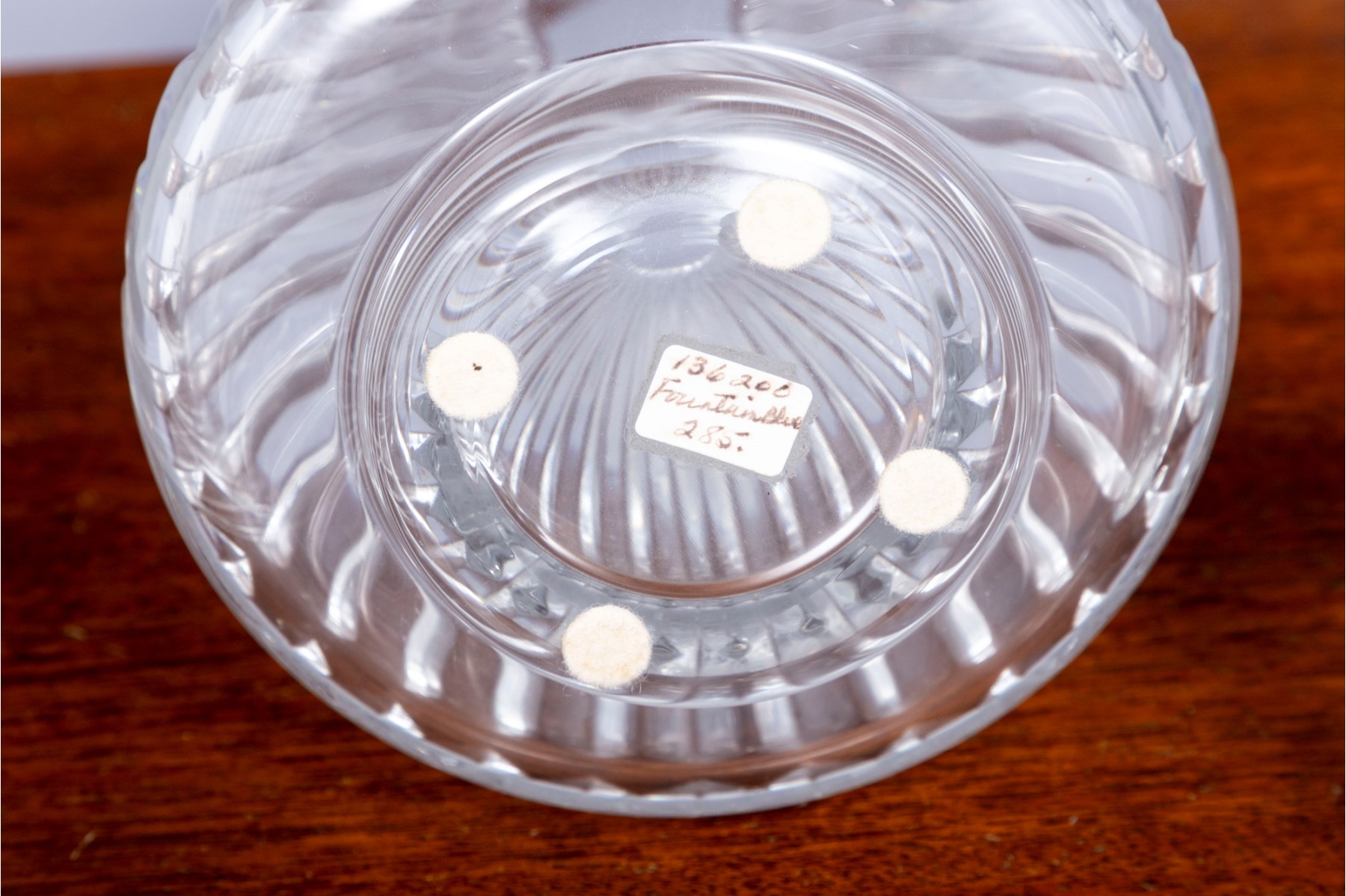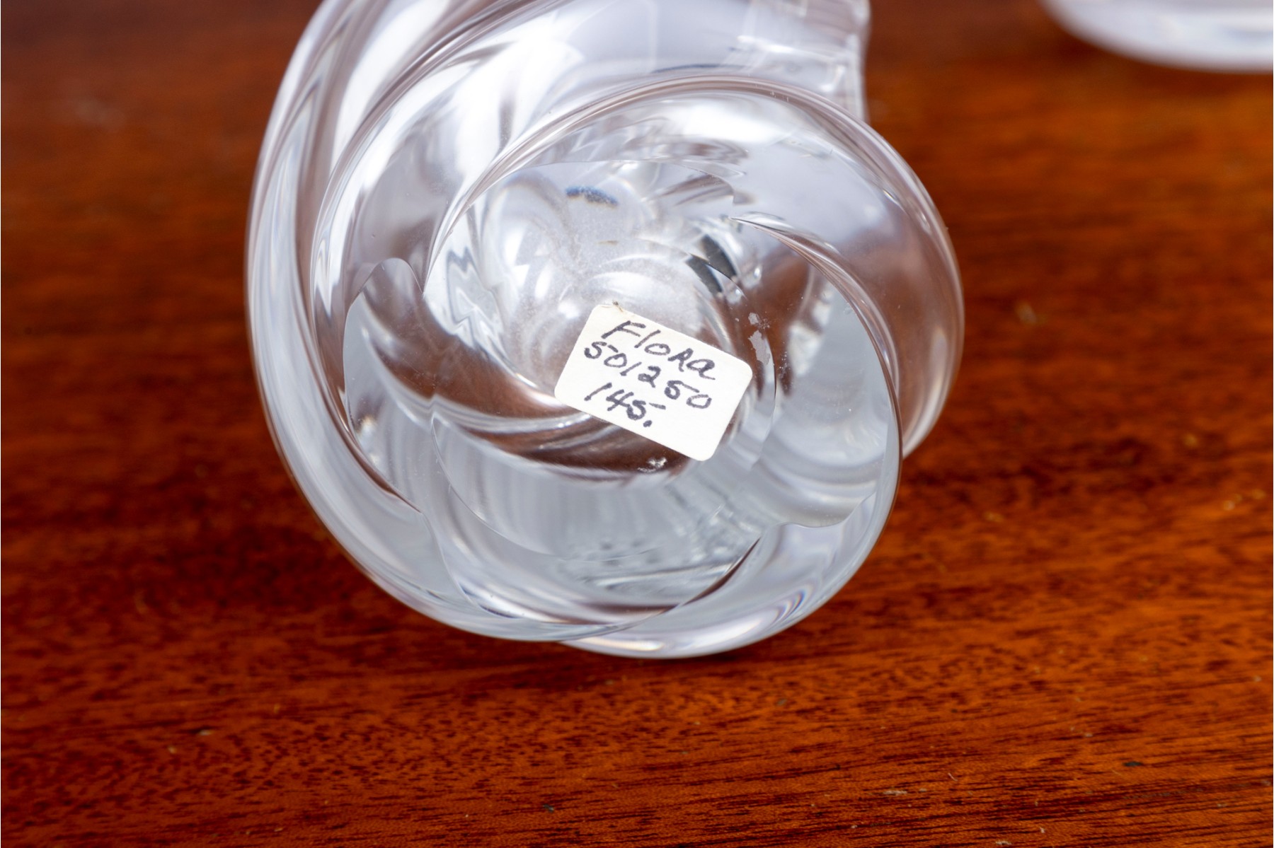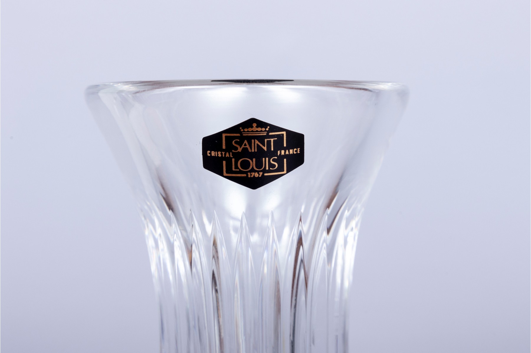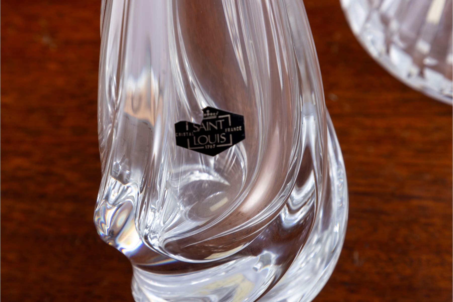 A wonderful trio of Saint Louis French crystal vases with similar hourglass figures. Two feature elegant cut designs, while the third sports a striking swirled form.