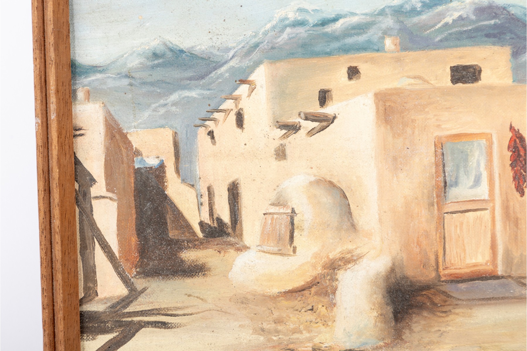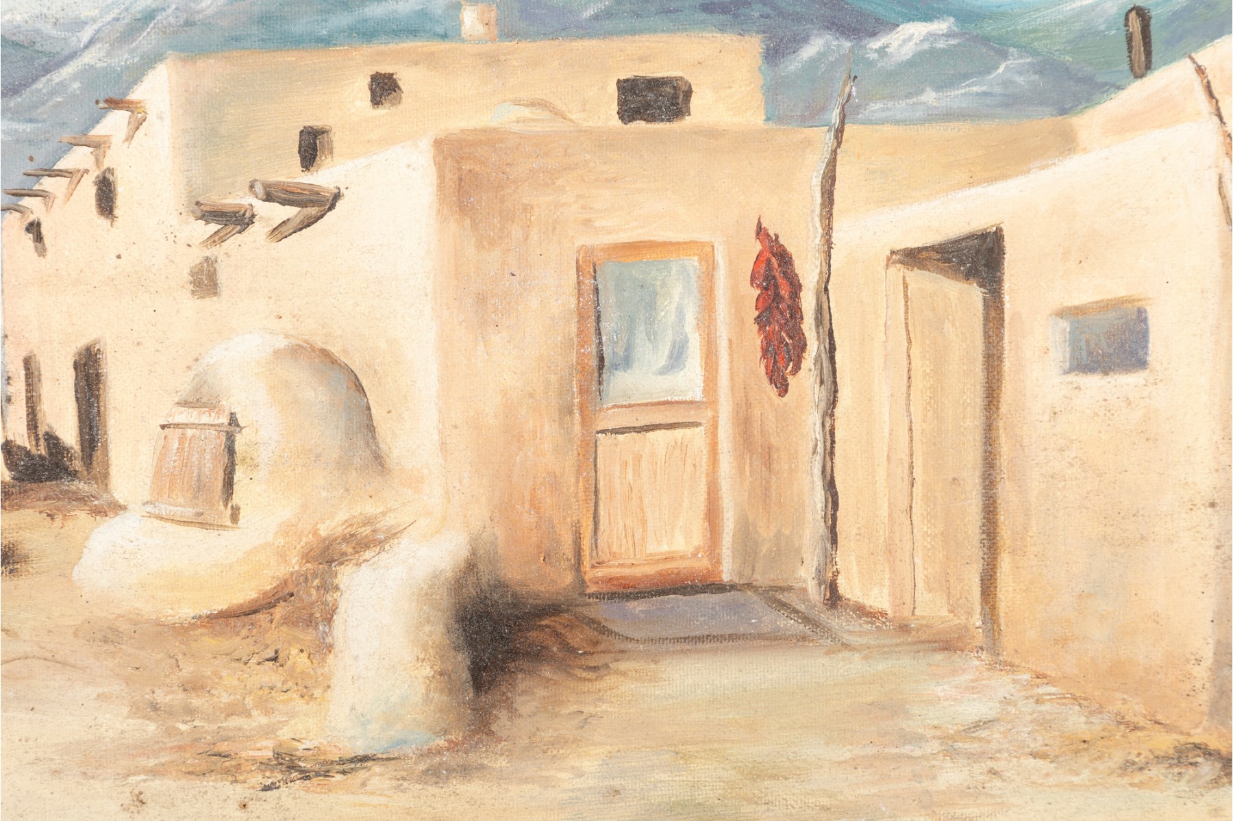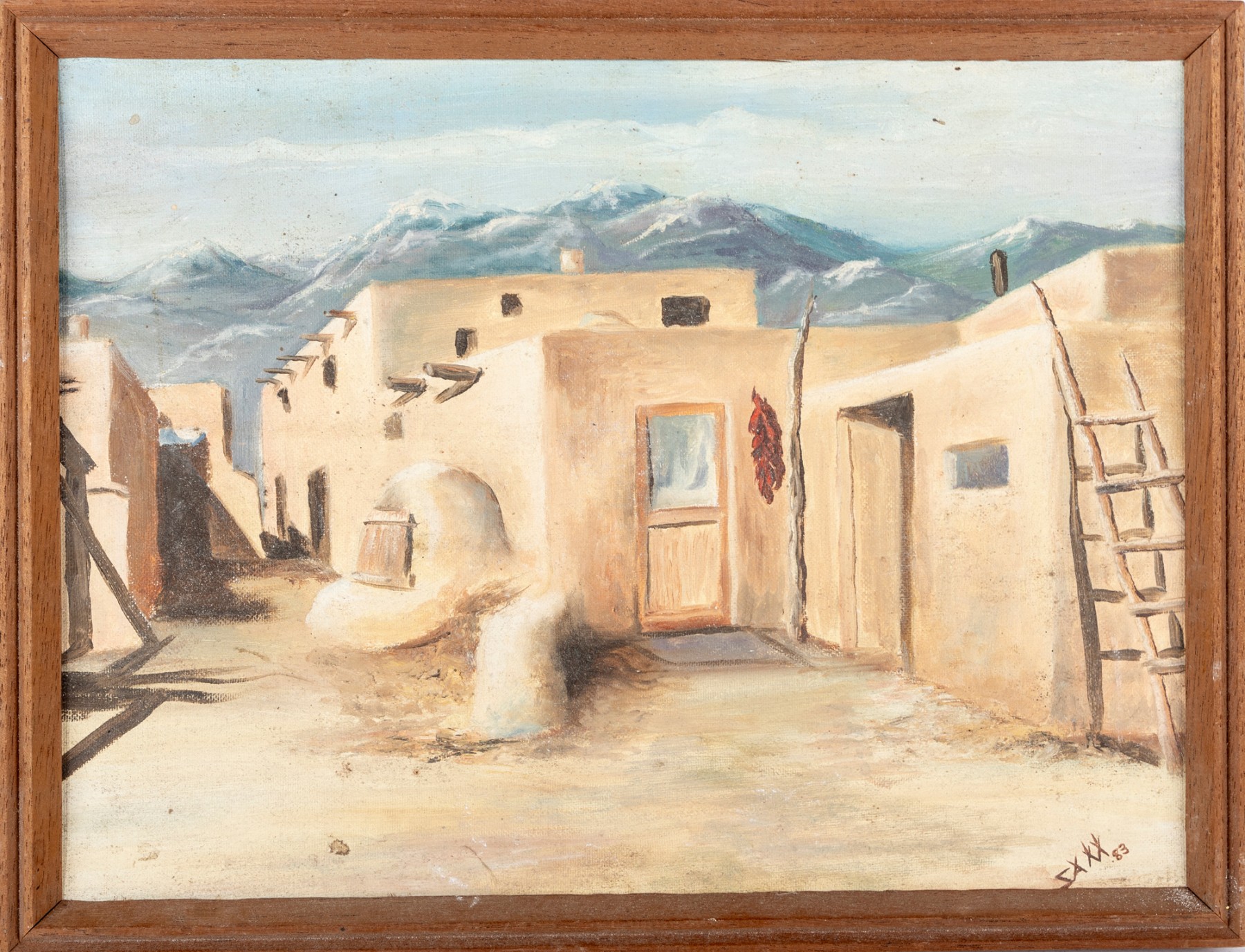 Sally Ann Moredich (American, 20th Century) "Taos NM Hopi Reservation" oil on board depicting a pueblo with pale orange-beige blocky buildings along a bacdrop of blue and purple mountains. Signed and dated '83 lower right, with additional information pen-written on the verso. Displayed without glass in a brown frame.