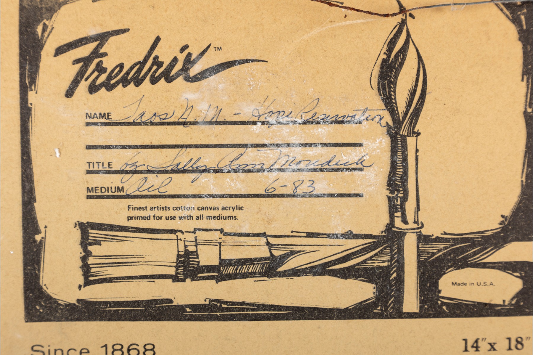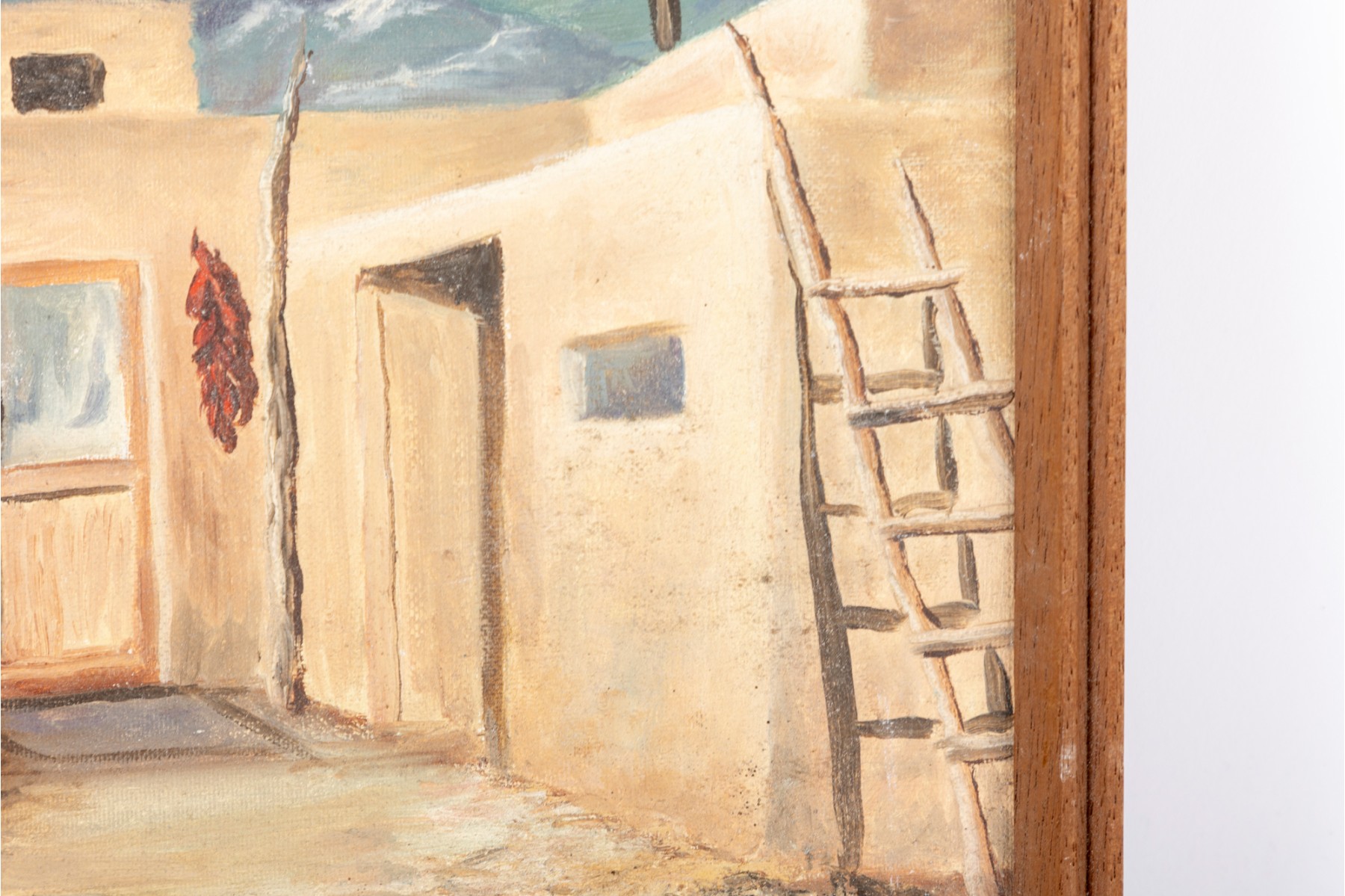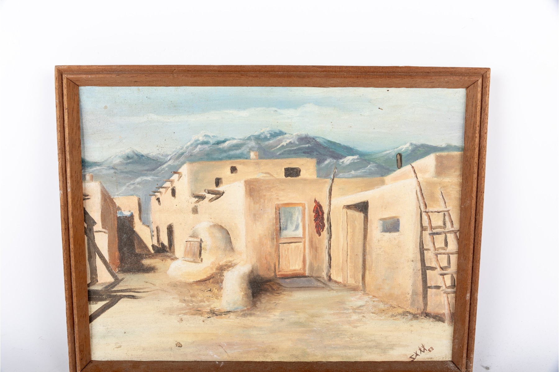 Sally Ann Moredich (American, 20th Century) "Taos NM Hopi Reservation" oil on board depicting a pueblo with pale orange-beige blocky buildings along a bacdrop of blue and purple mountains. Signed and dated '83 lower right, with additional information pen-written on the verso. Displayed without glass in a brown frame.
