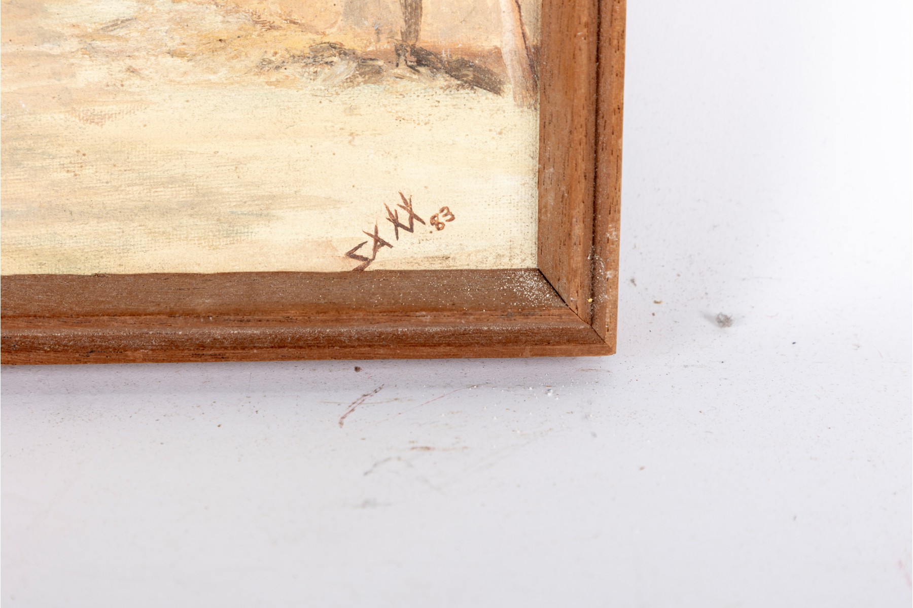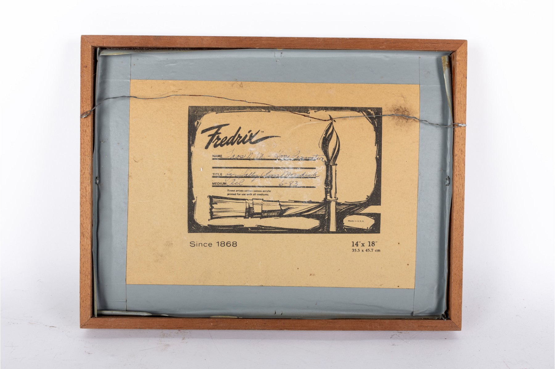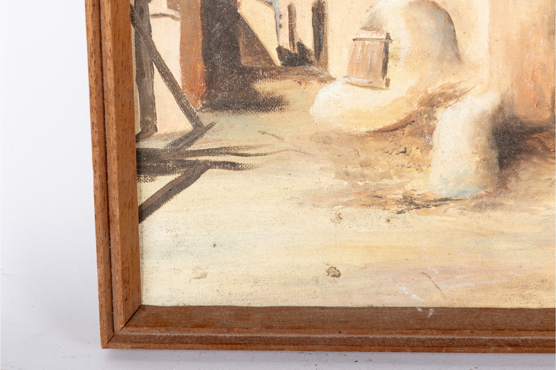 Discoloration, bowing/warping, and lifting to the canvas around the edges. Minor wear to the frame.