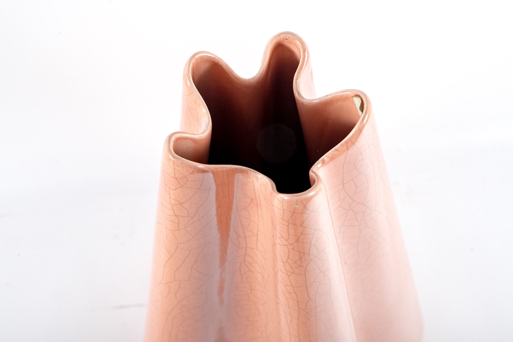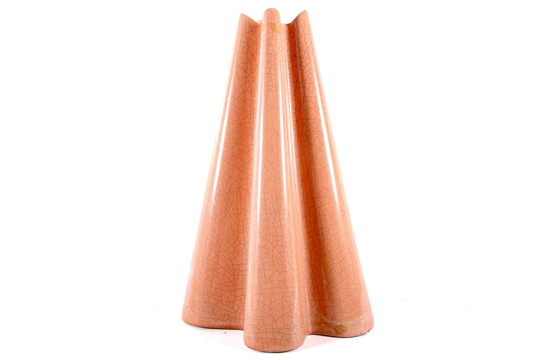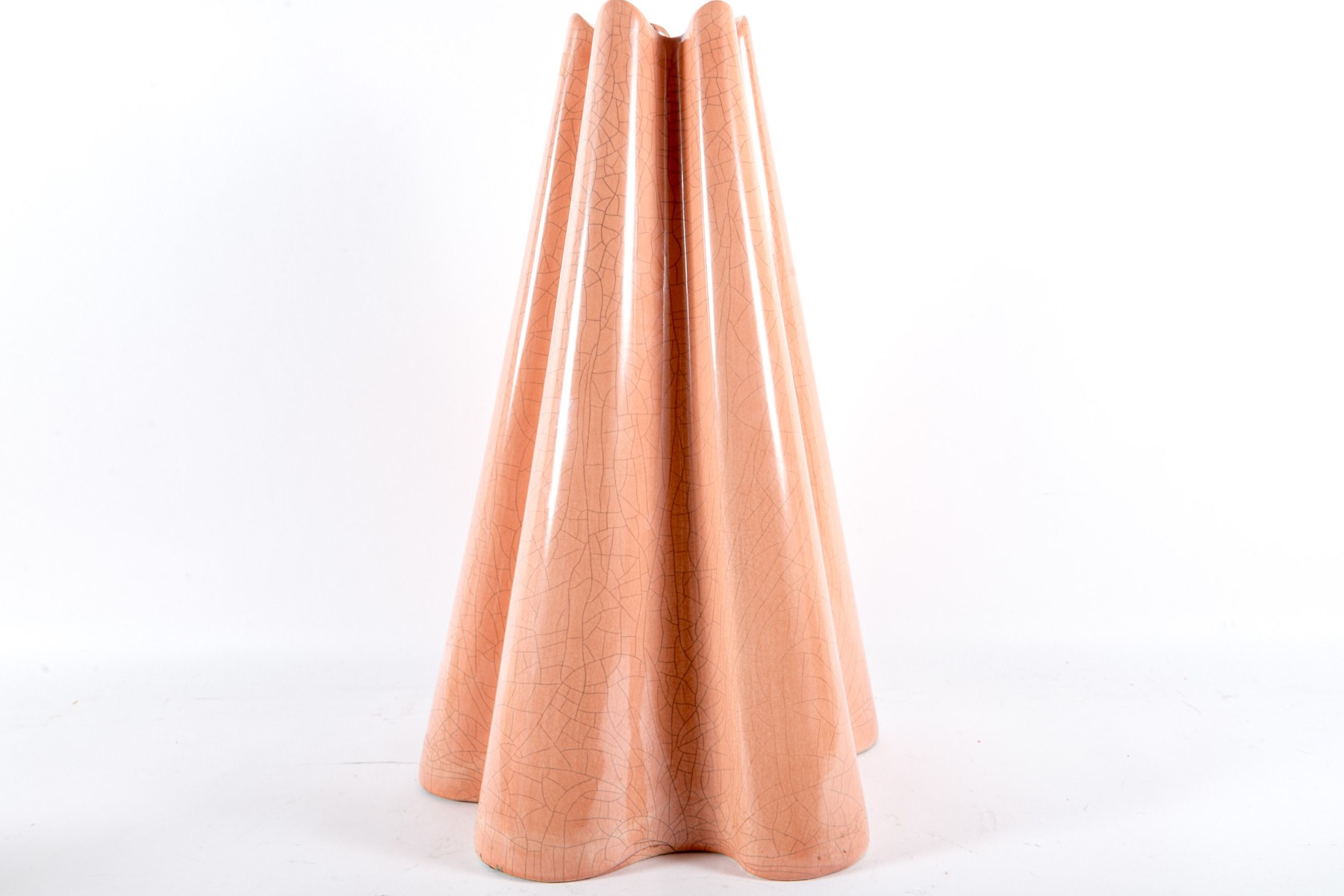 A chic ceramic floor vase in salmon pink displaying a ruffled conical form with a crazed/crackle finish.