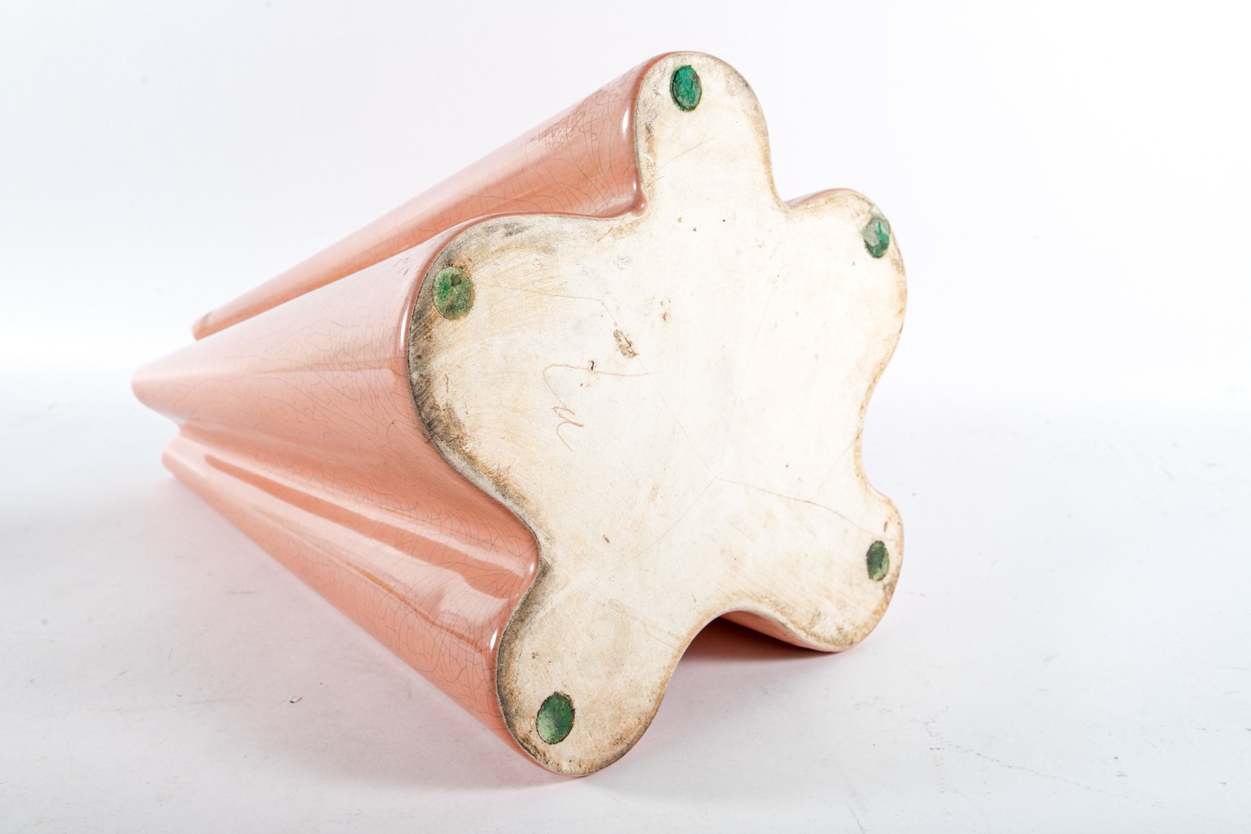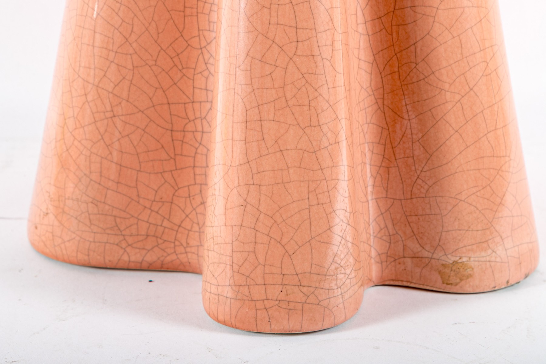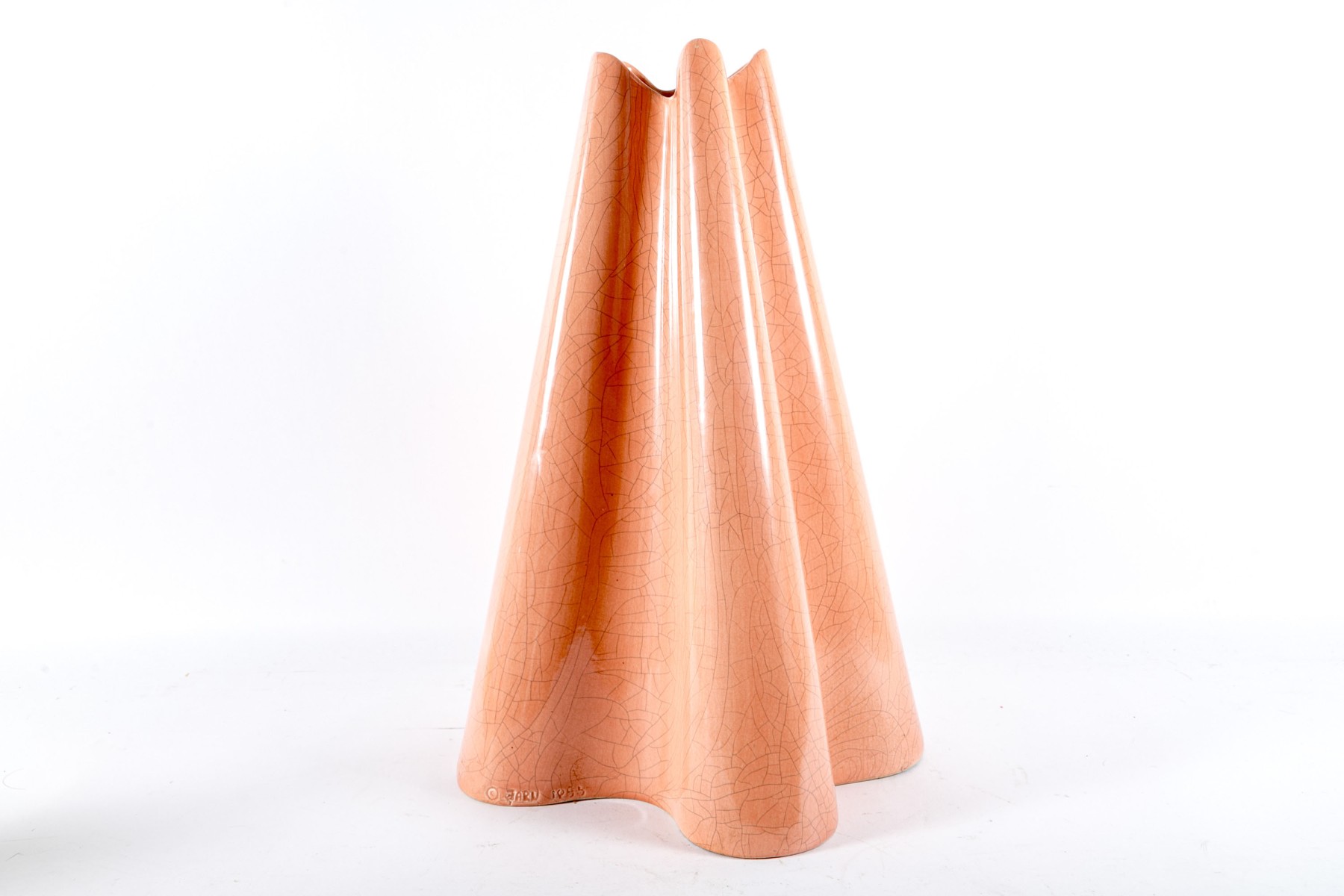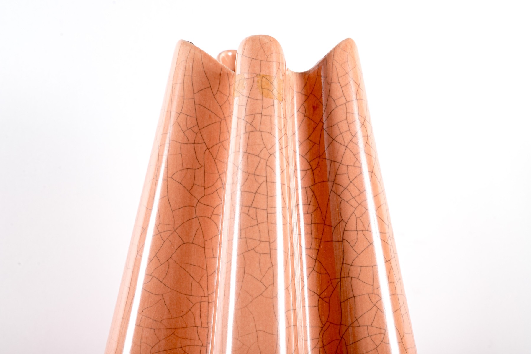 A chic ceramic floor vase in salmon pink displaying a ruffled conical form with a crazed/crackle finish.