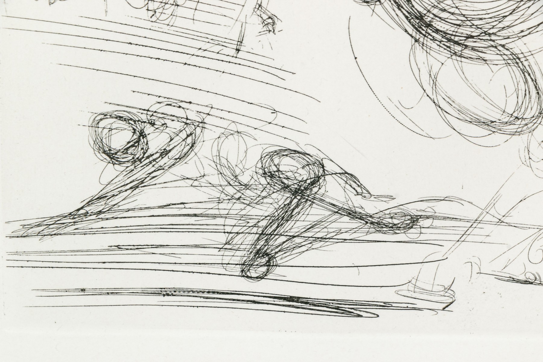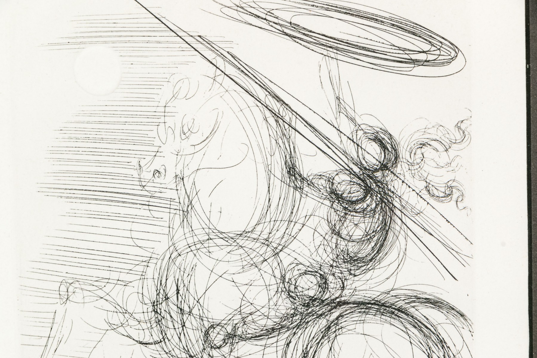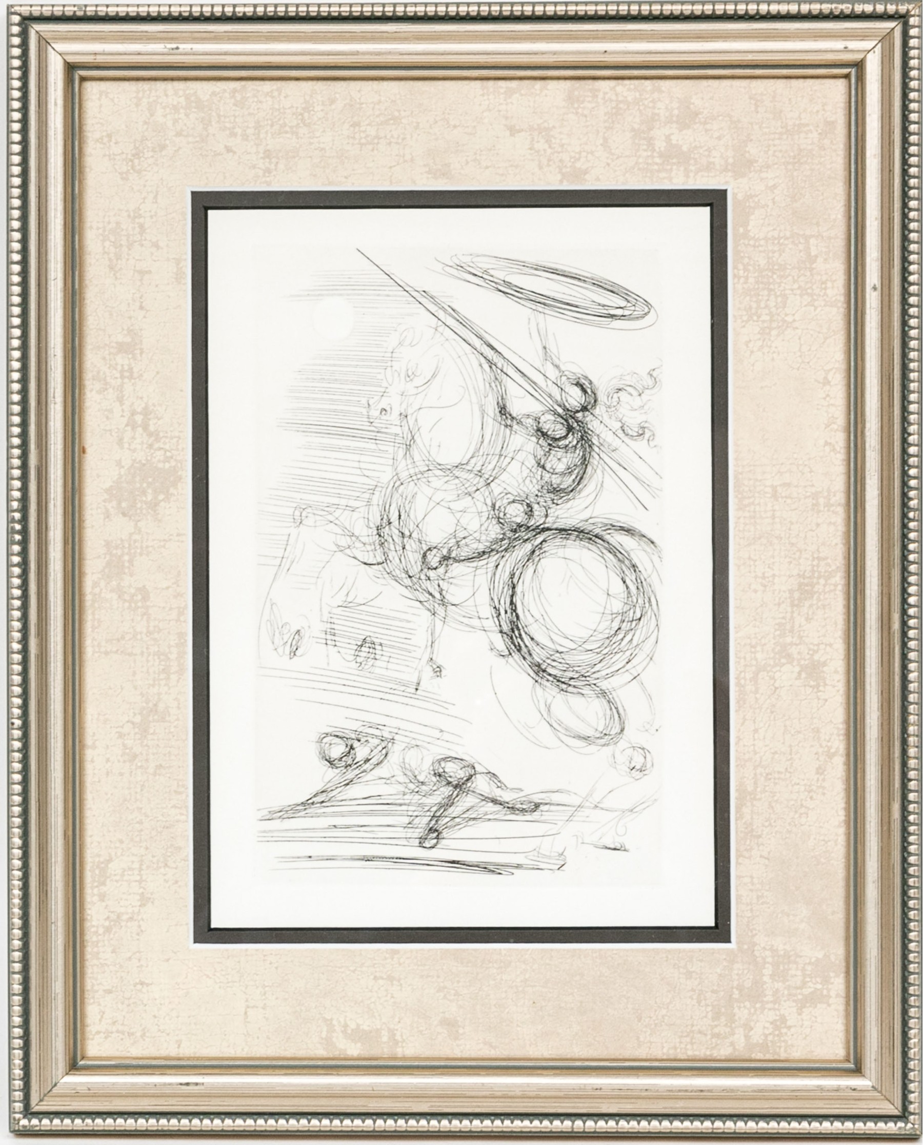 Vintage Salvador Dali etching depicting Don Quixote on horseback with embossed sun in the upper left. Unsigned work and more than likely Collector's Guild issue.