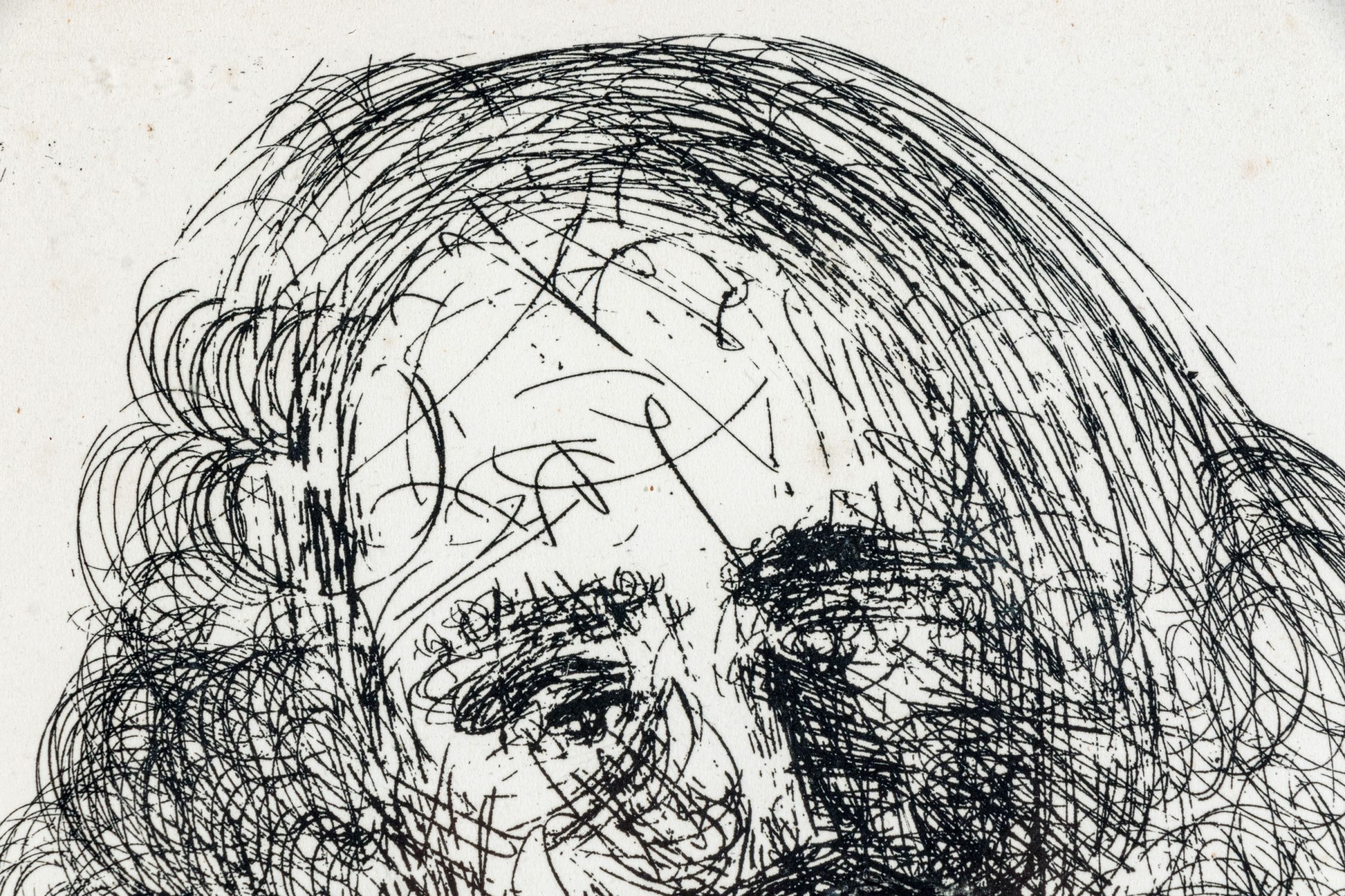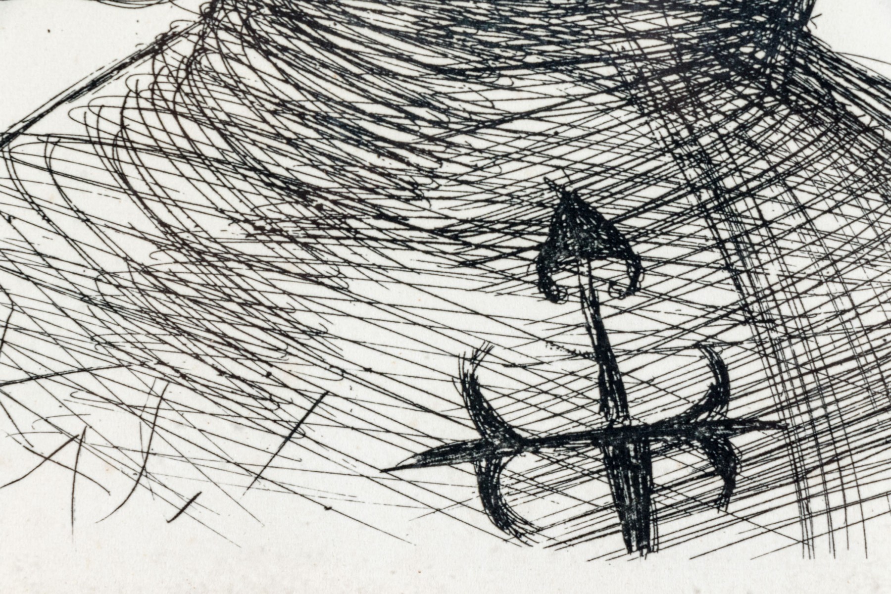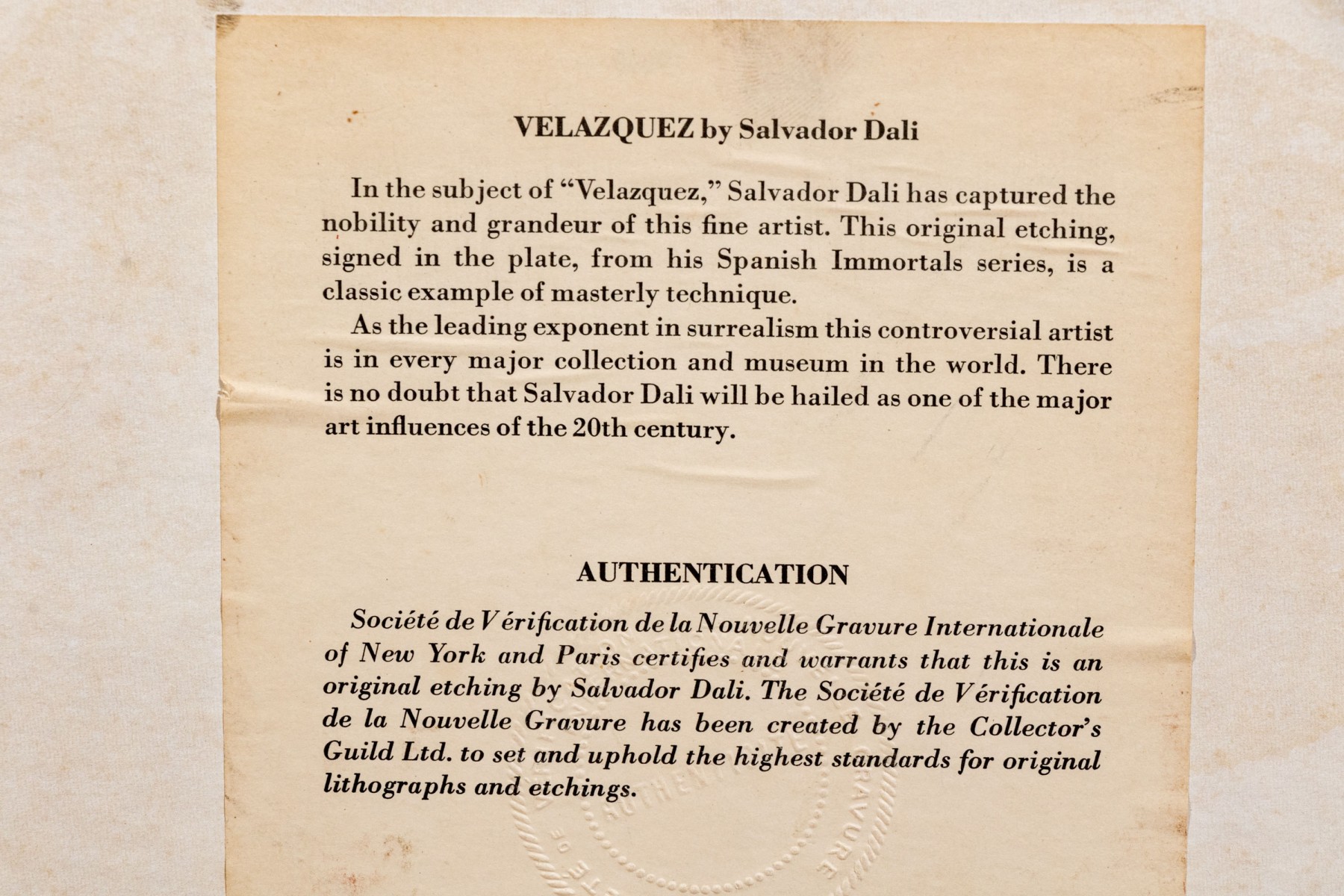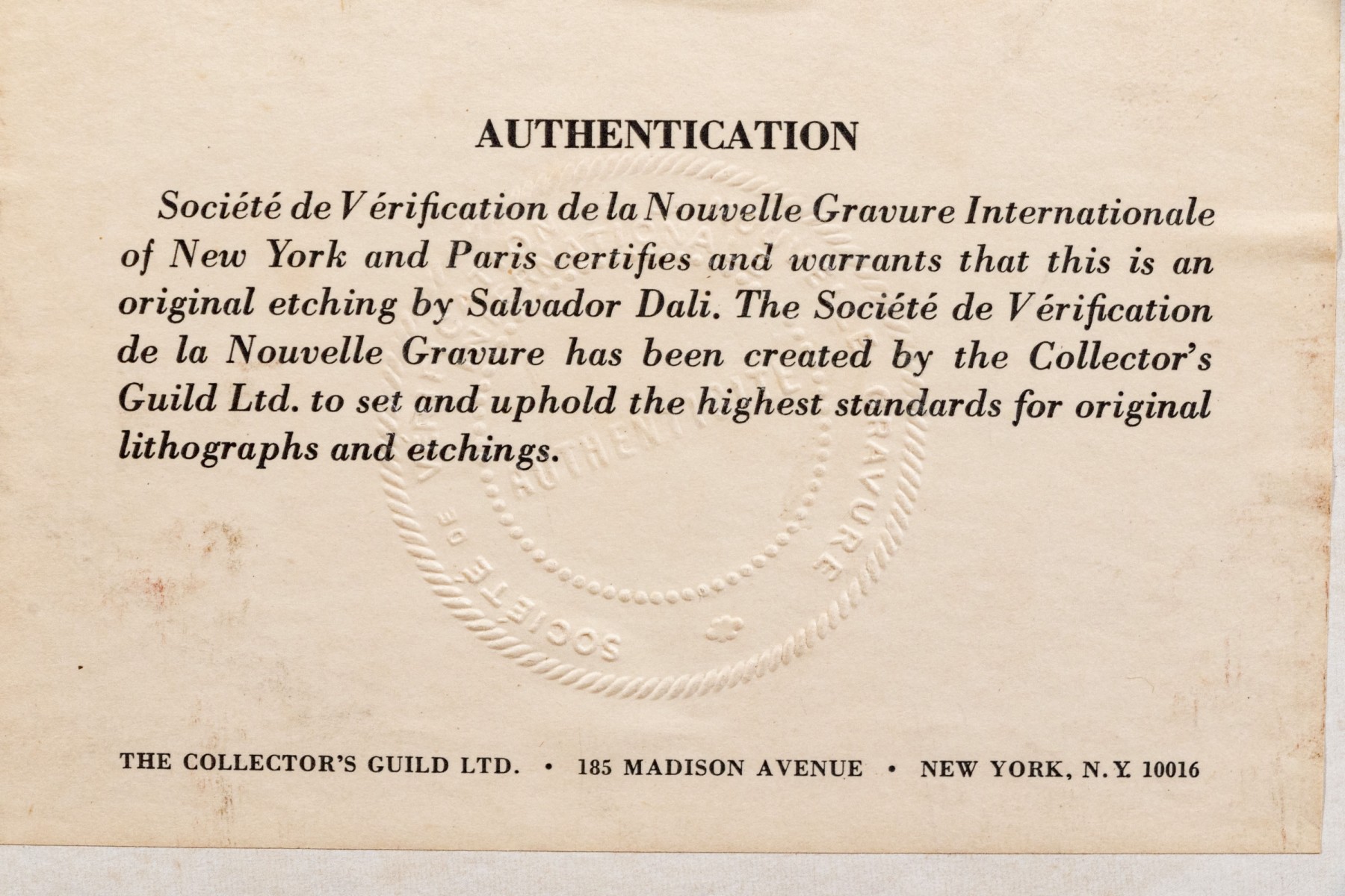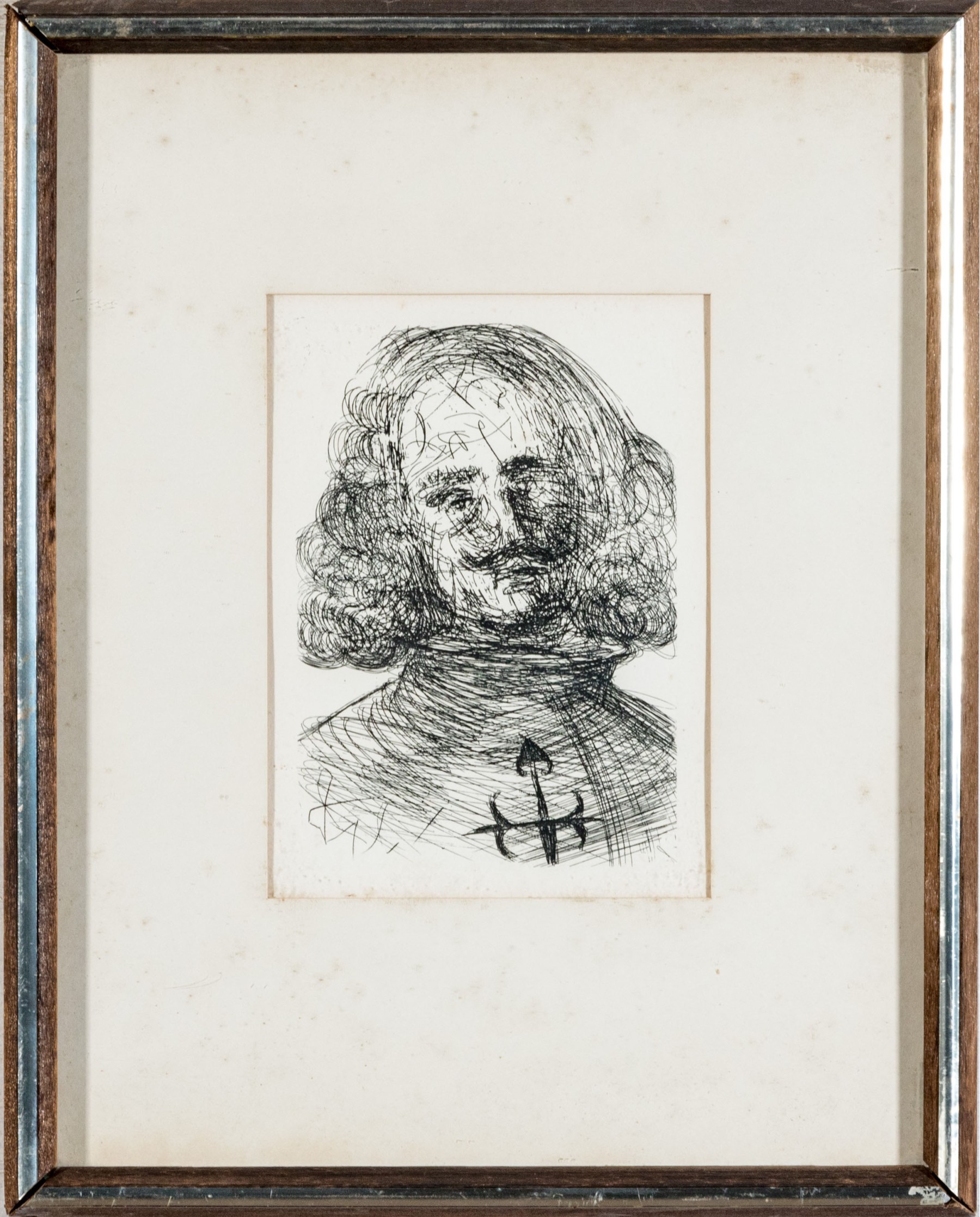 Signed in plate lower left. COA on verso, with The Collectors Guild New York label. A fine portrait bust of the noted Spanish artist, the etching from Dali's "Spanish Immortals" series. Presented in a wood and silvery frame with glass.