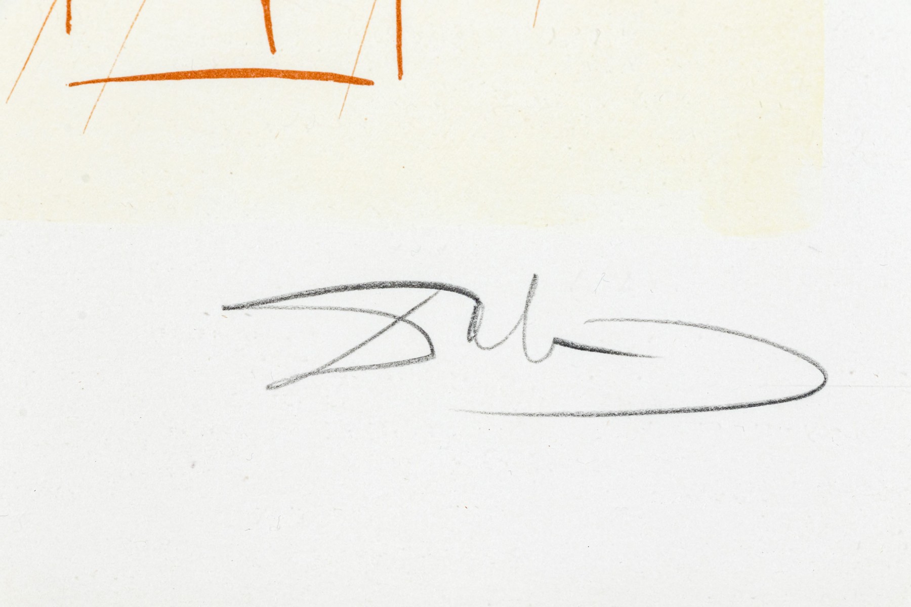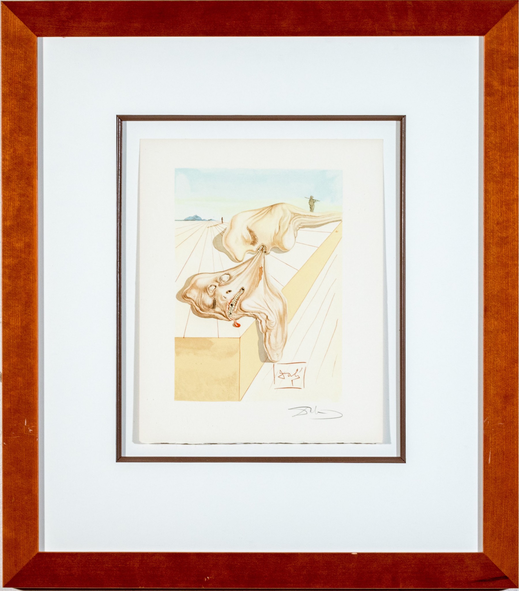 1960. Surreal image from "The Divine Comedy, Inferno Canto 30". One of the artist's illustrations for the famous book. Pencil signed lower right, signed in plate lower right. Tacked to a white backing and presented in a brown frame with glass.