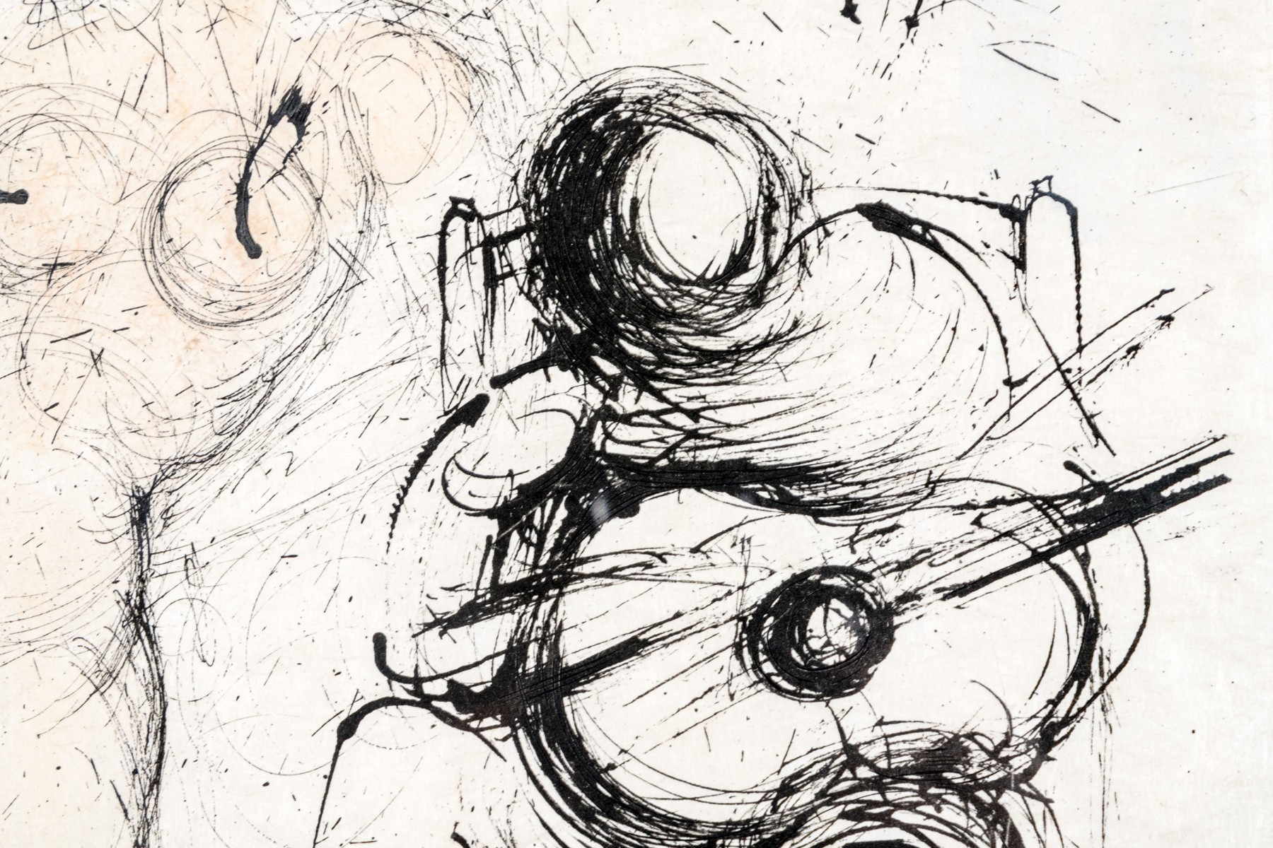 Pencil signed and dated 67 lower right, embossed signature in plate lower right margin. One of several images from "Poemes Secrets D'Apollinaire". Here a nude guitar player is watched by figures and a female nude at the left, with color details. Presented in a gilt frame with glass.