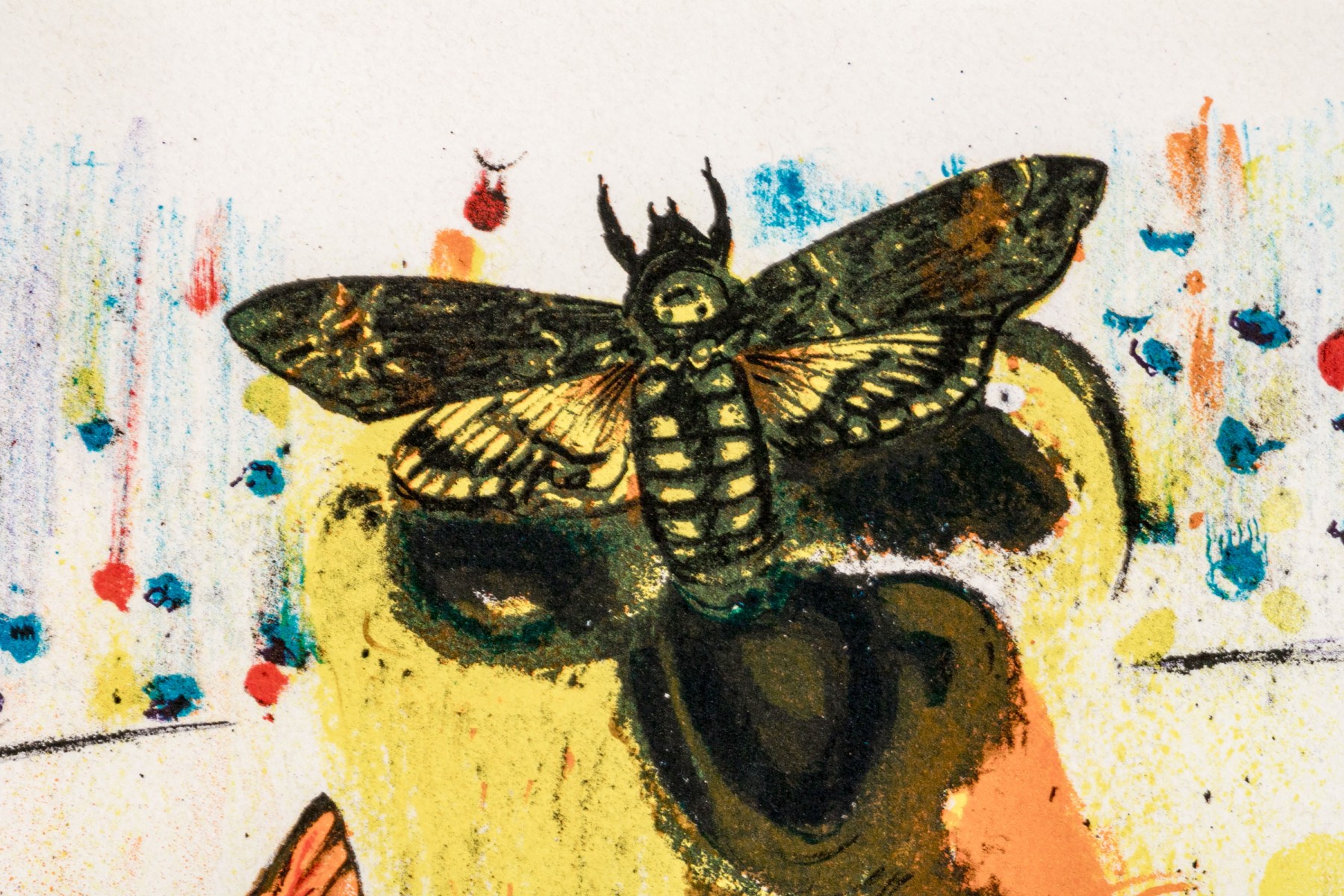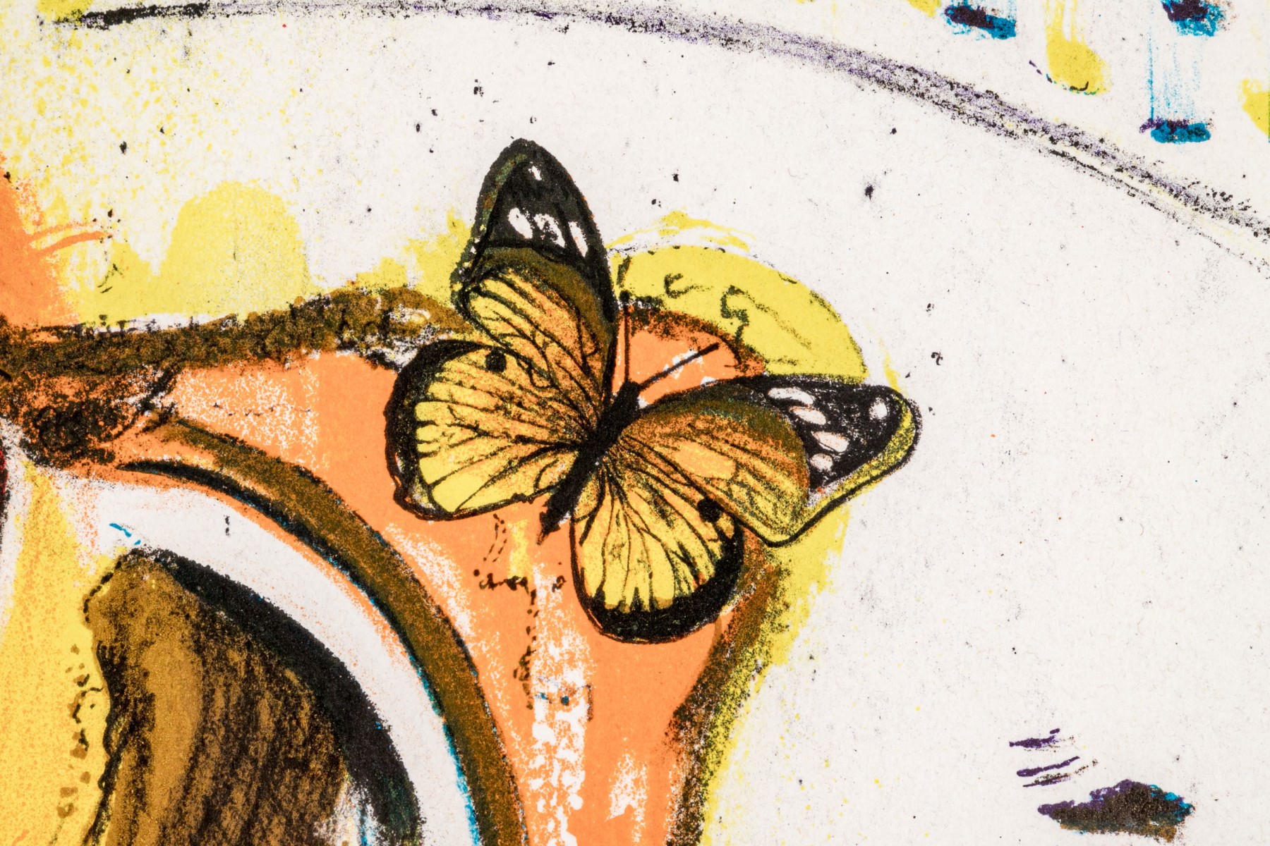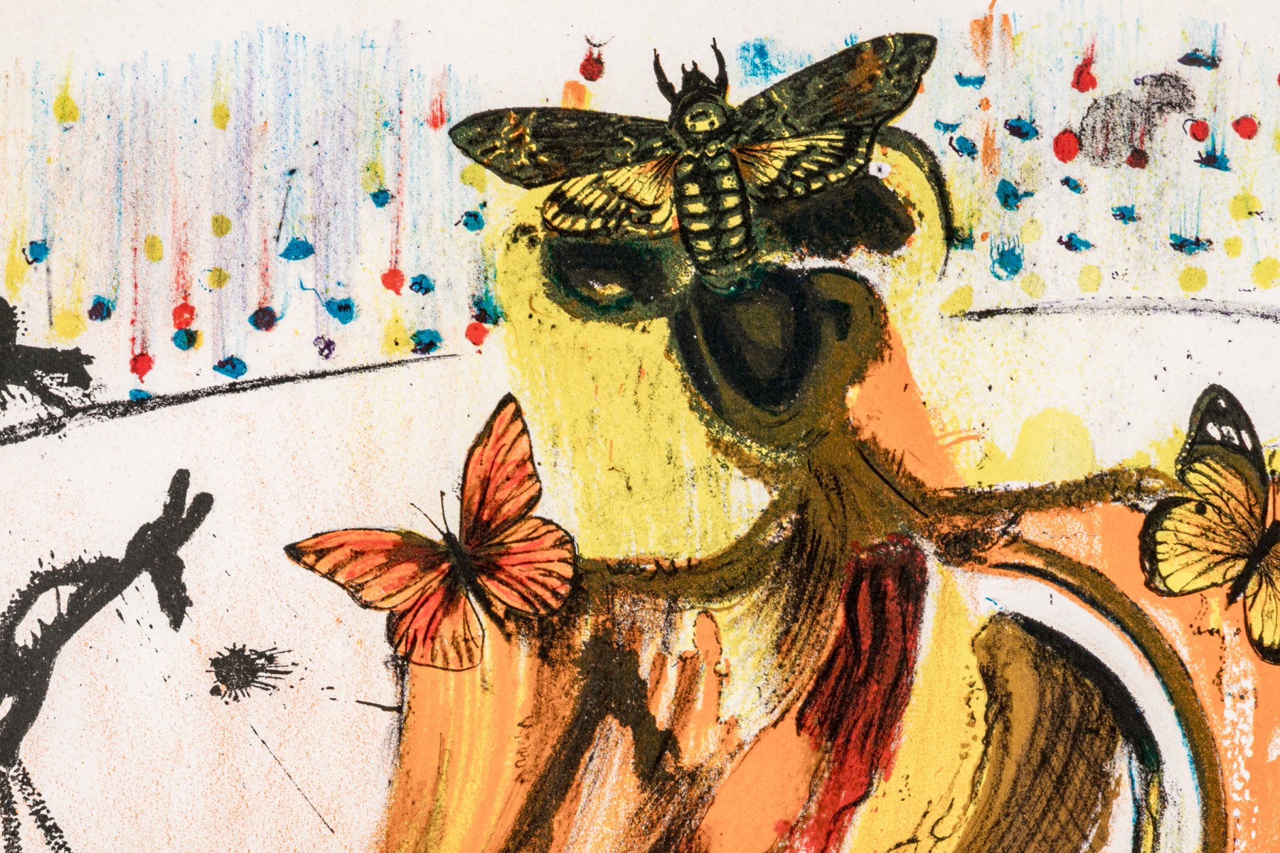 Lithograph depicting a bull fighter with butterflies at his head and shoulders, an image of a lanced bull in the foreground.