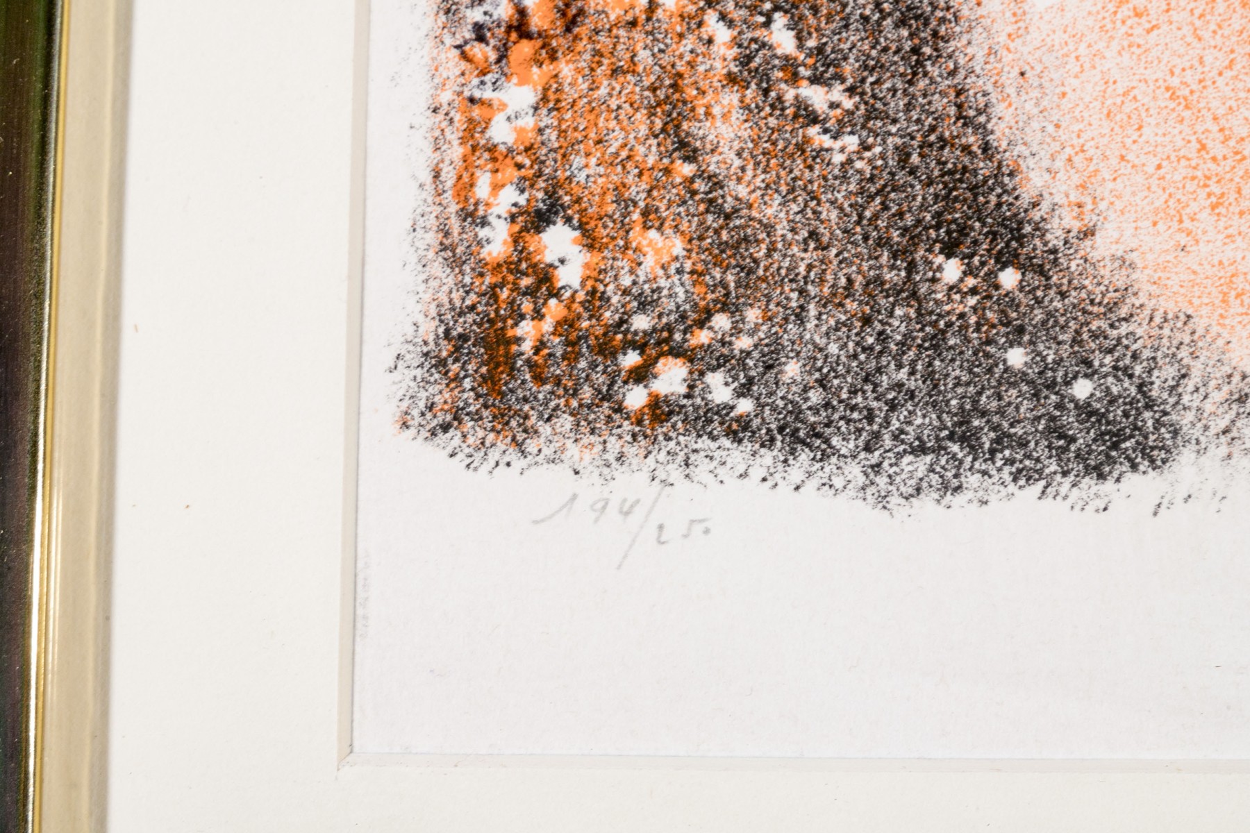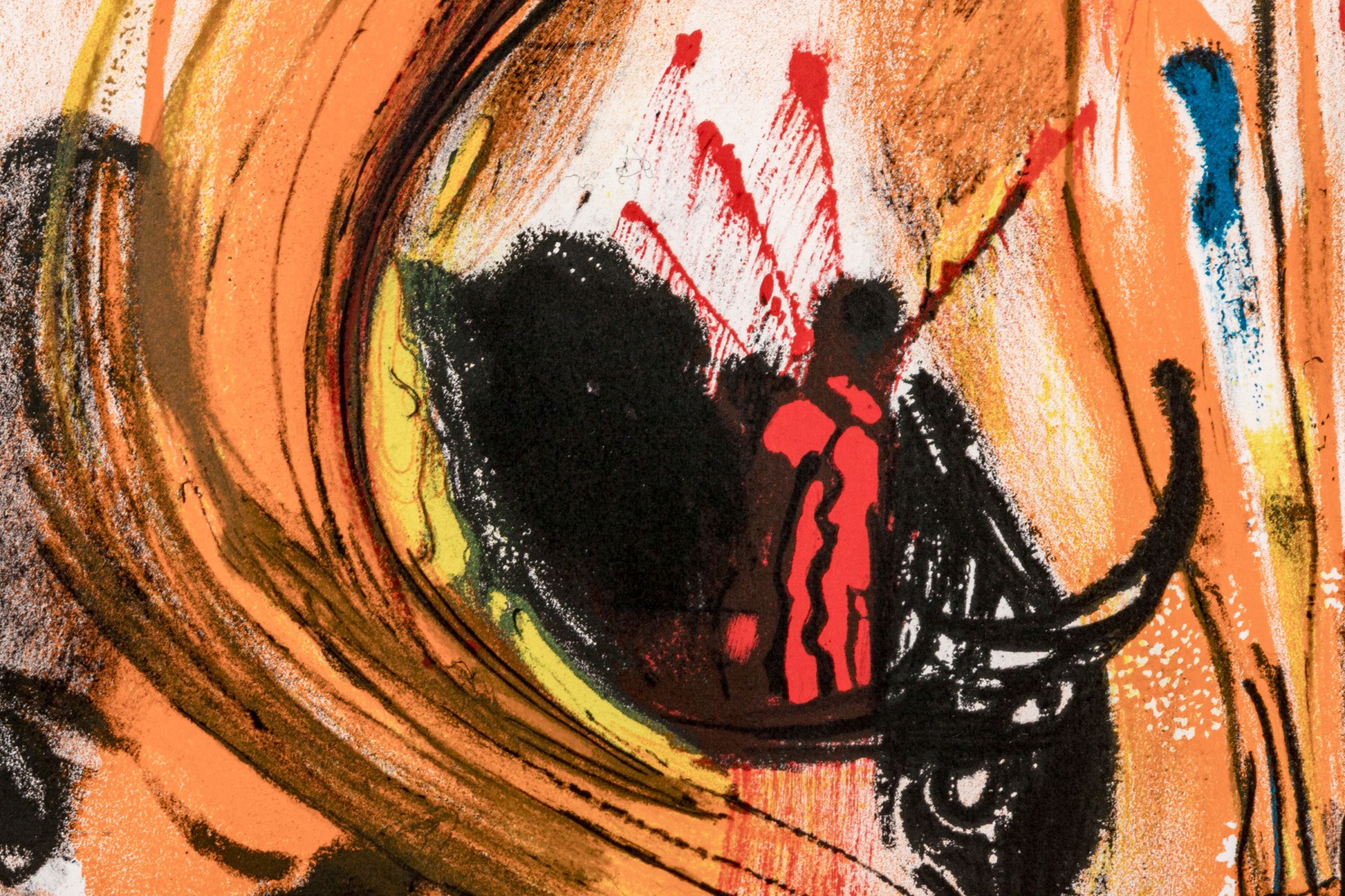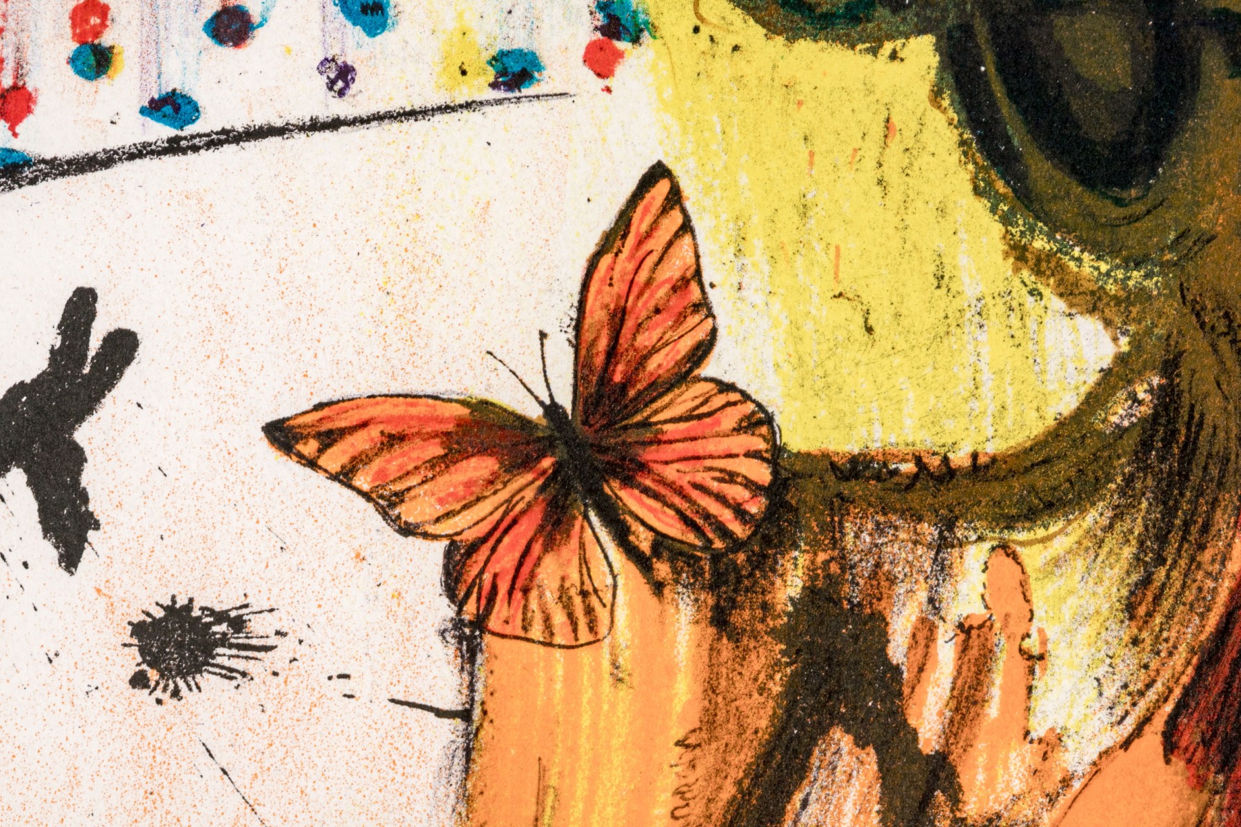 Lithograph depicting a bull fighter with butterflies at his head and shoulders, an image of a lanced bull in the foreground.