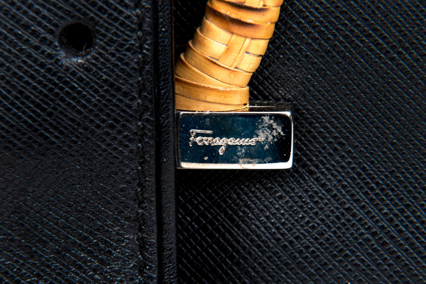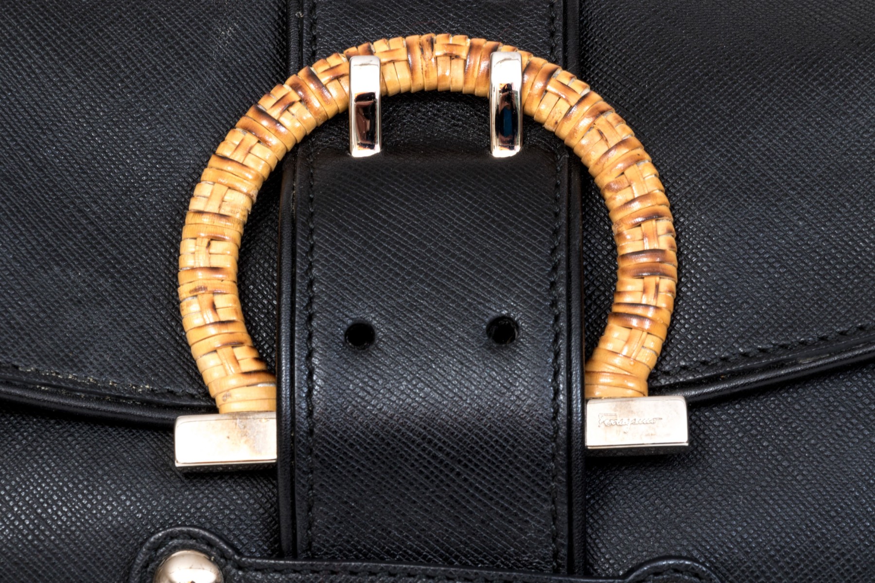 A fabulous Salvatore Ferragamo shoulder bag in black Saffiano leather, featuring a Gancini Thalia wicker woven horseshoe motif buckle.