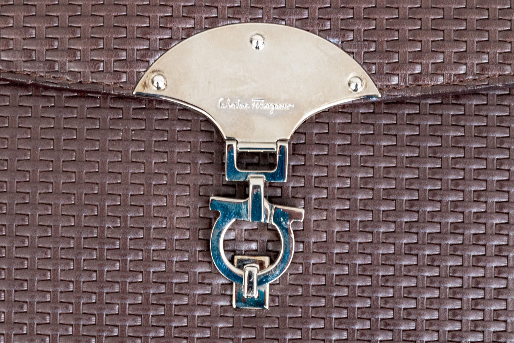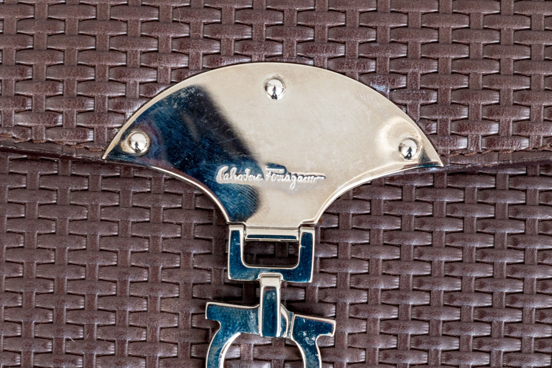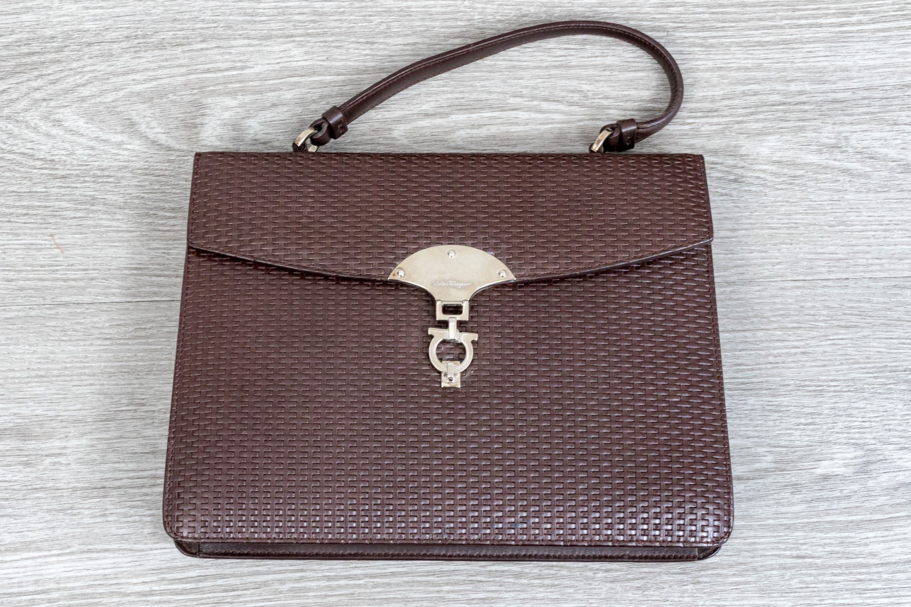 A stylish Salvatore Ferragamo handbag in dark brown leather, showcasing an eye-catching basketweave design. Features a fold over closure with a chrome clasp. The interior opens to two internal pockets flanking a central coin purse. The bag includes a removable shoulder strap.