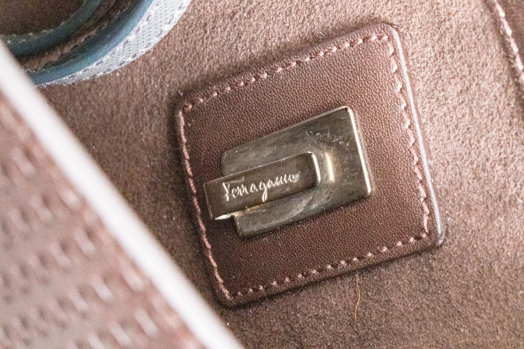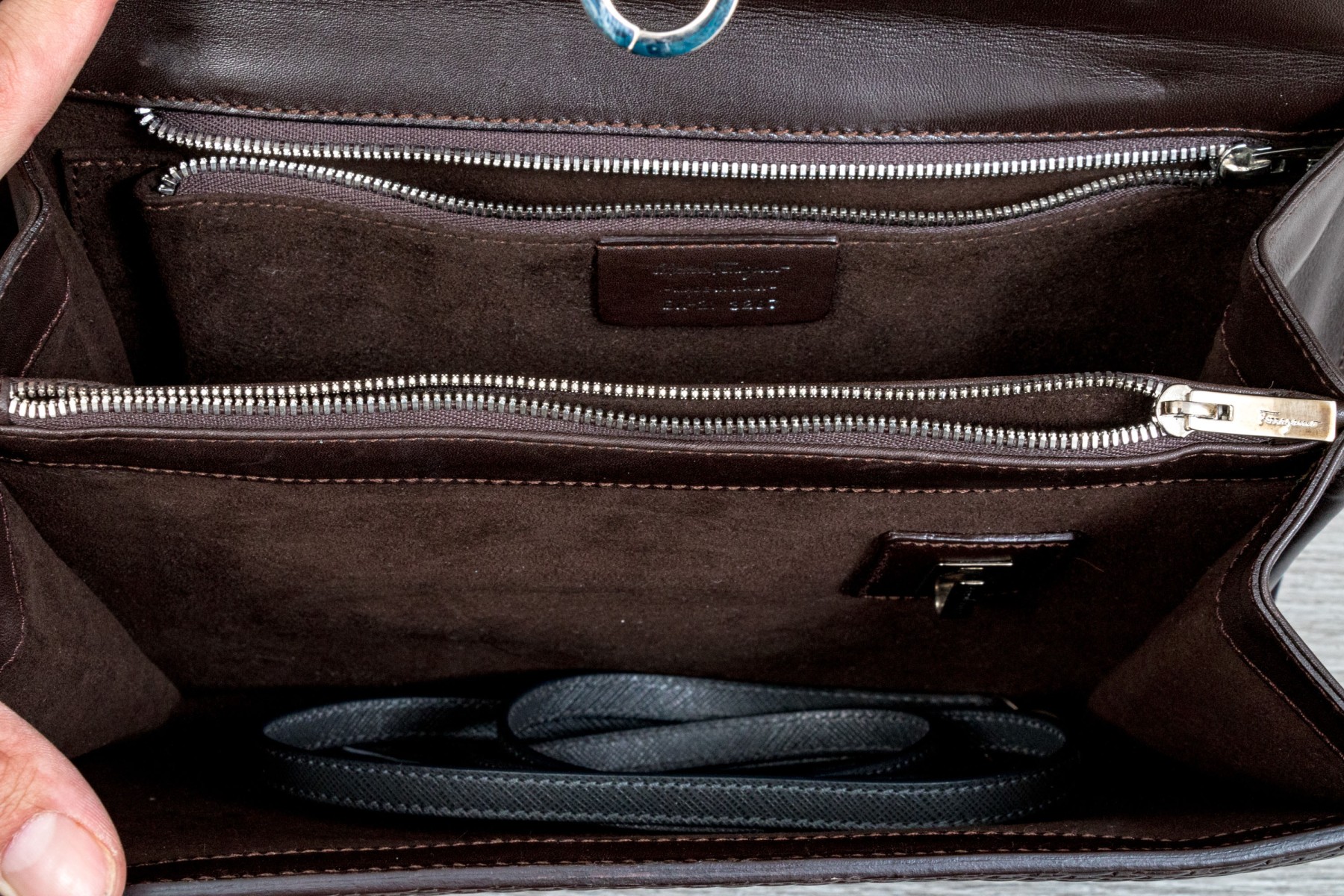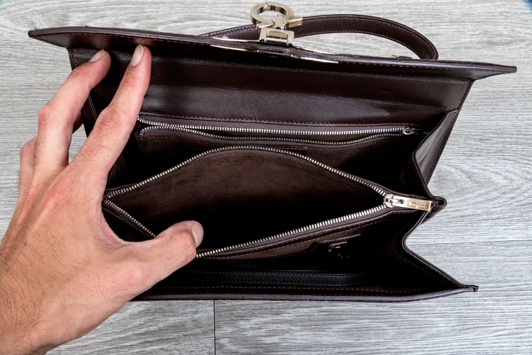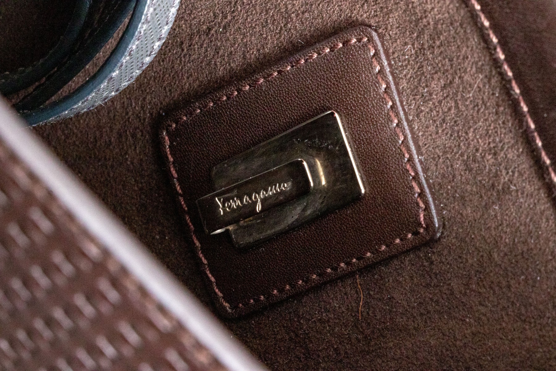 A stylish Salvatore Ferragamo handbag in dark brown leather, showcasing an eye-catching basketweave design. Features a fold over closure with a chrome clasp. The interior opens to two internal pockets flanking a central coin purse. The bag includes a removable shoulder strap.