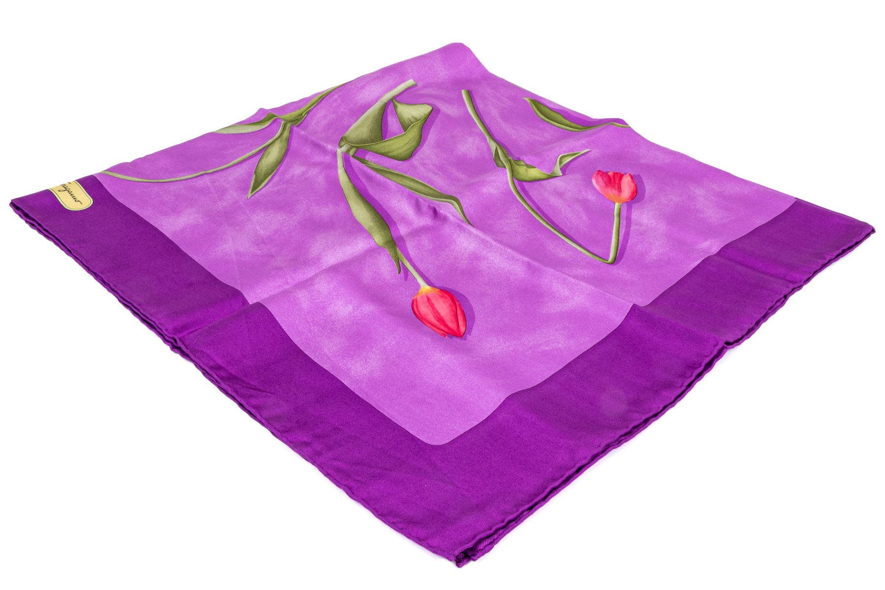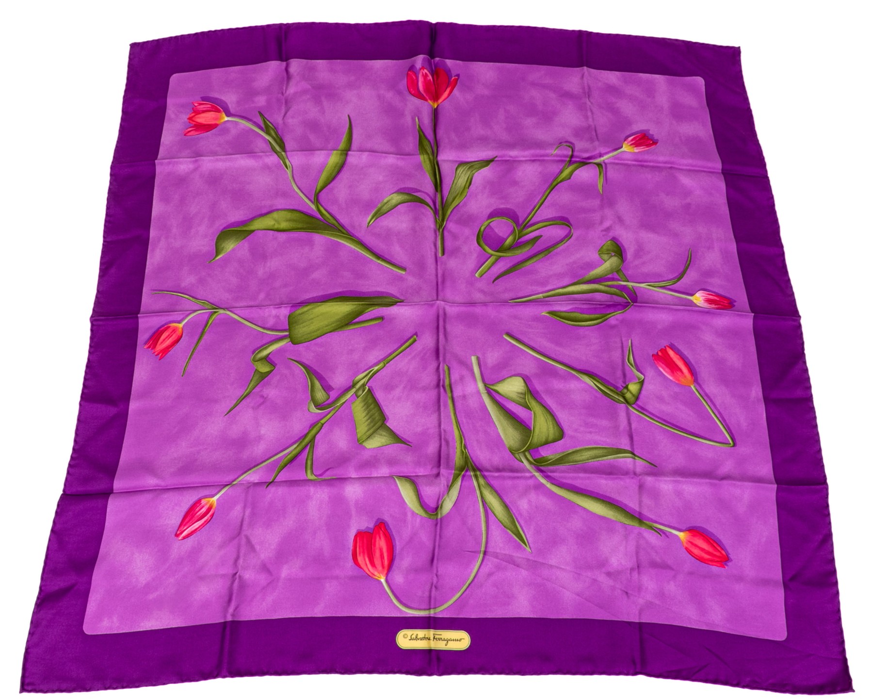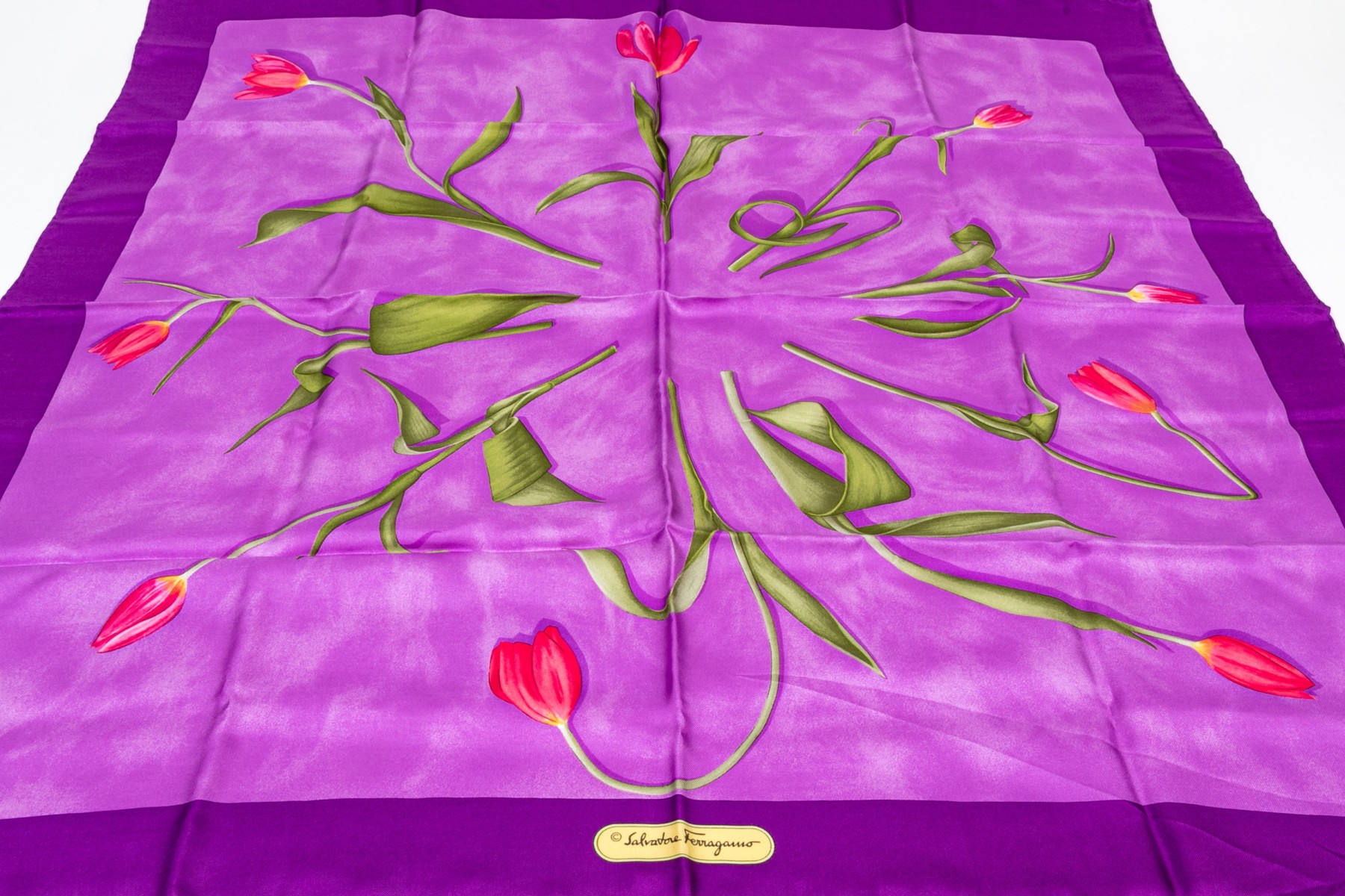 Salvatore Ferragamo lovely purple and green vintage silk tulip motif scarf