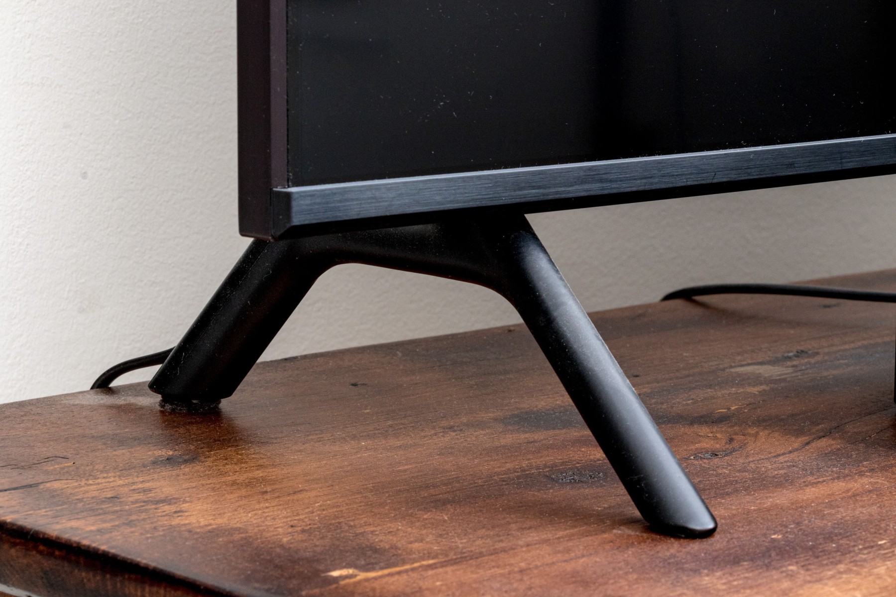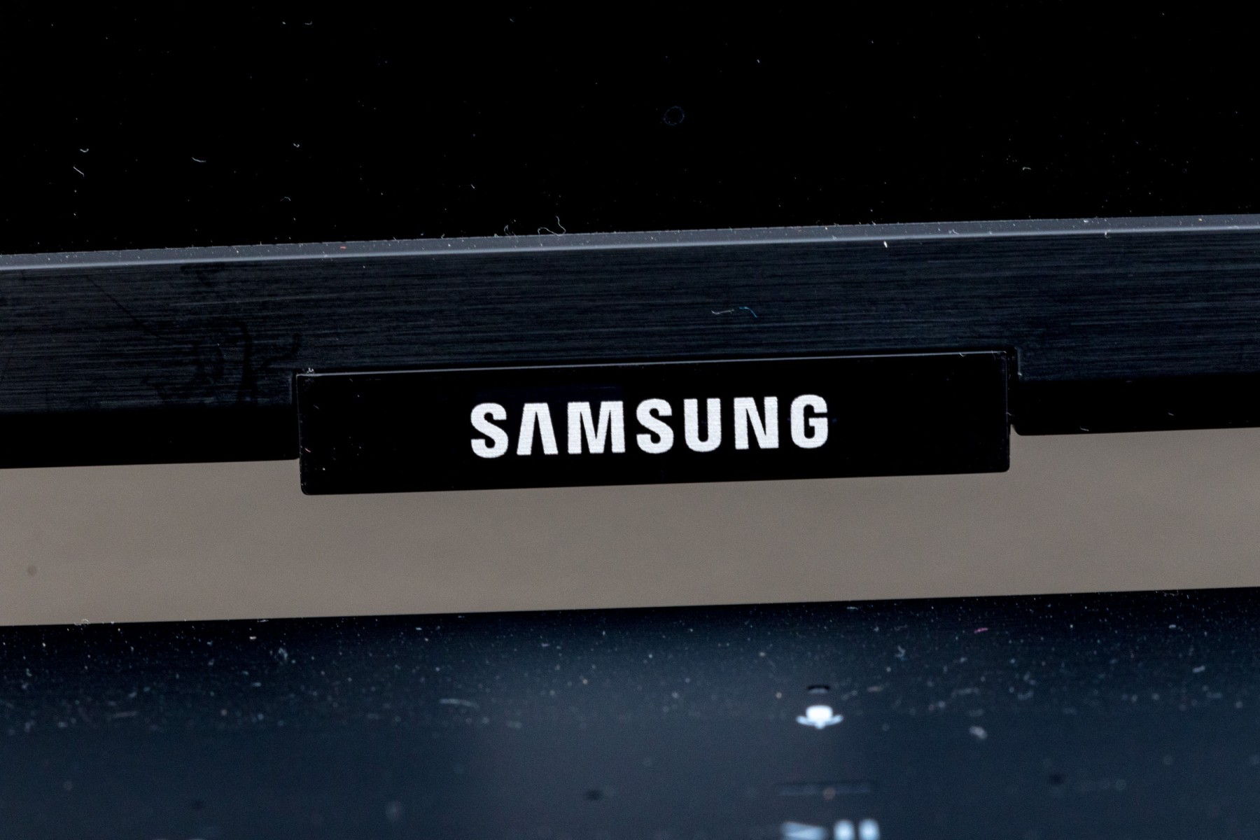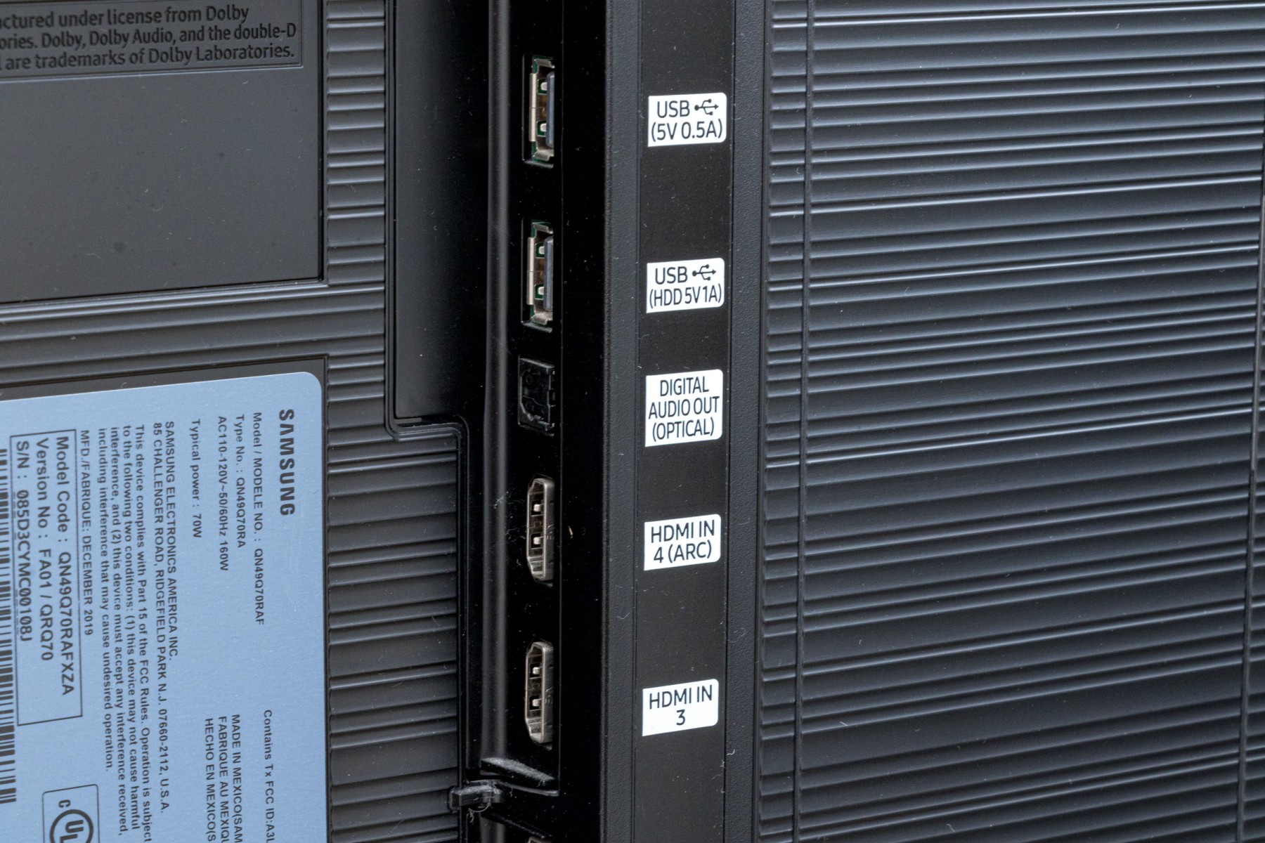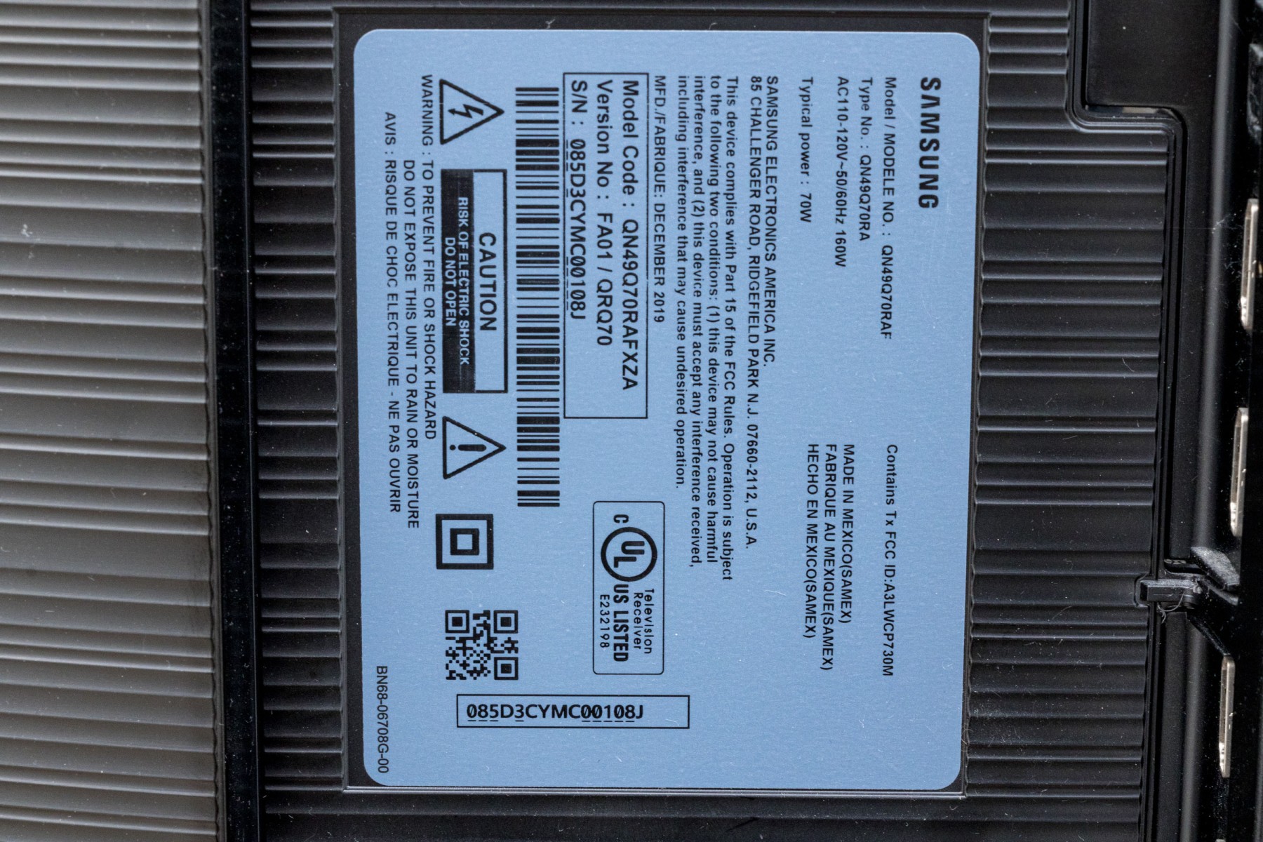 A sleek Samsung model QN49Q70RAF television in classic black, raised on stylish angled legs.