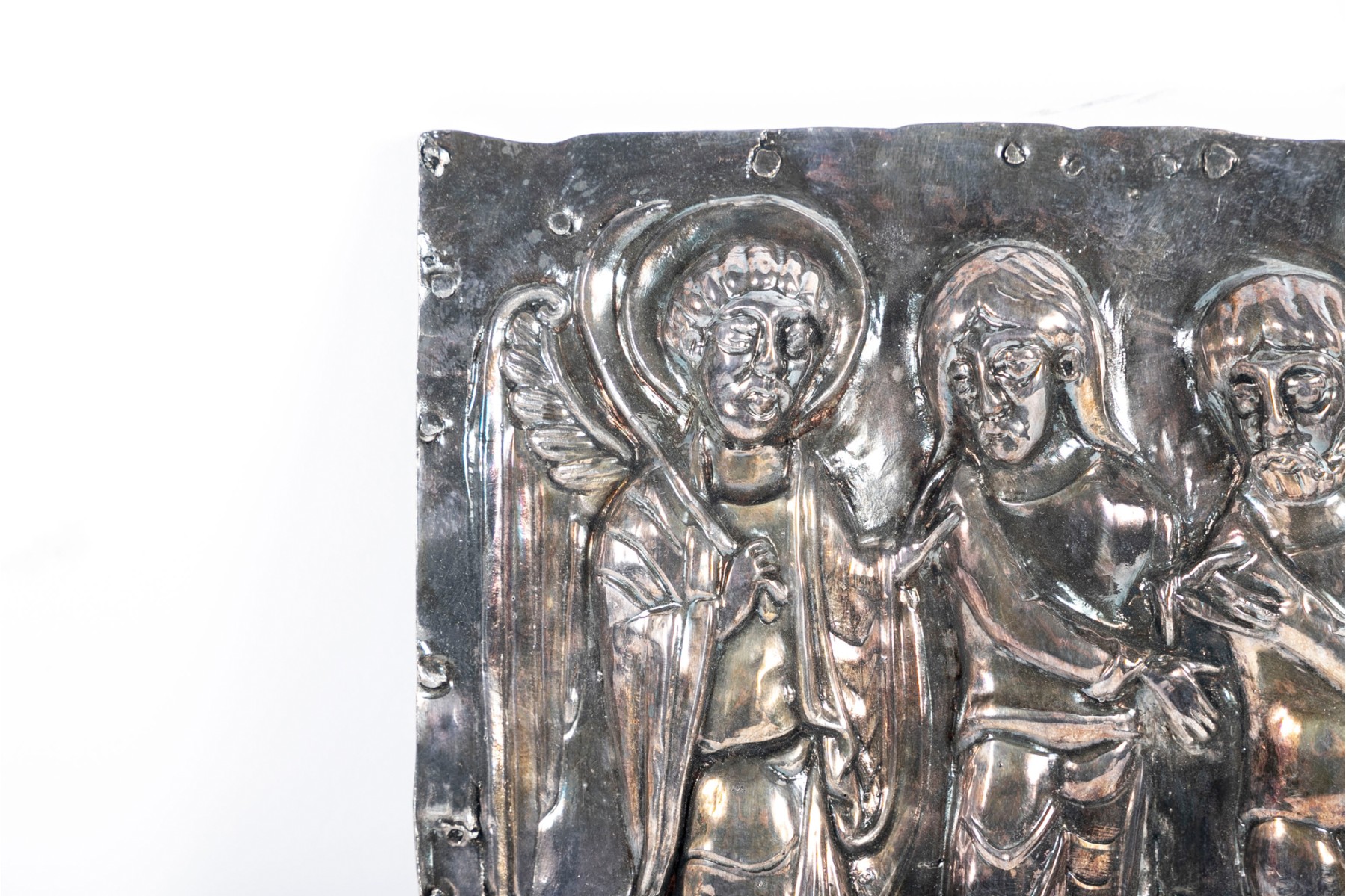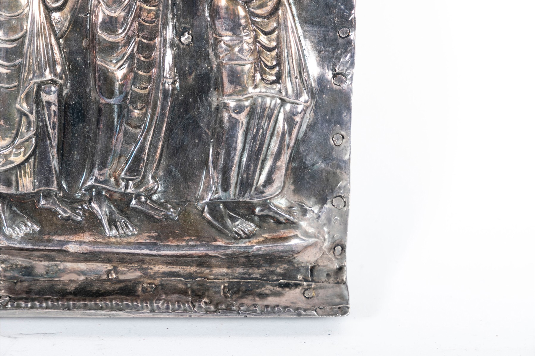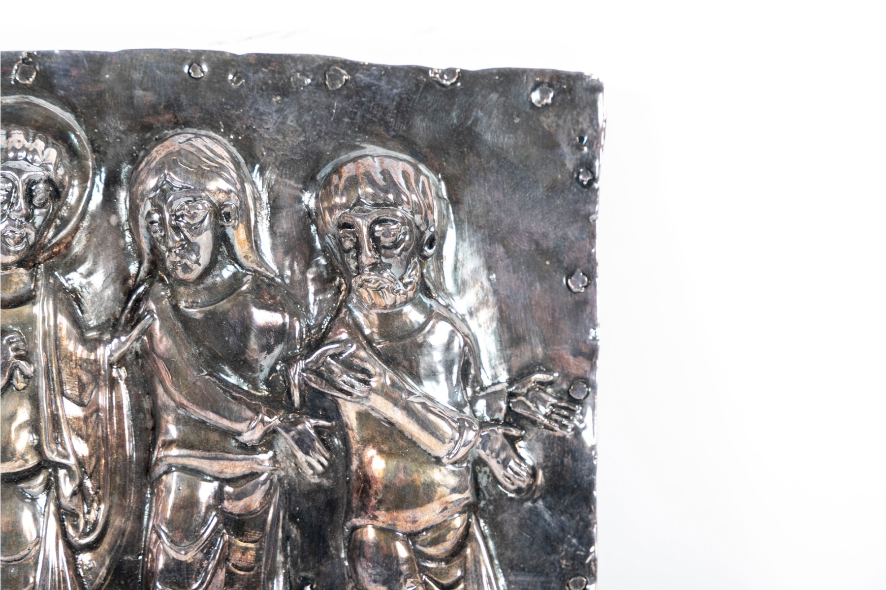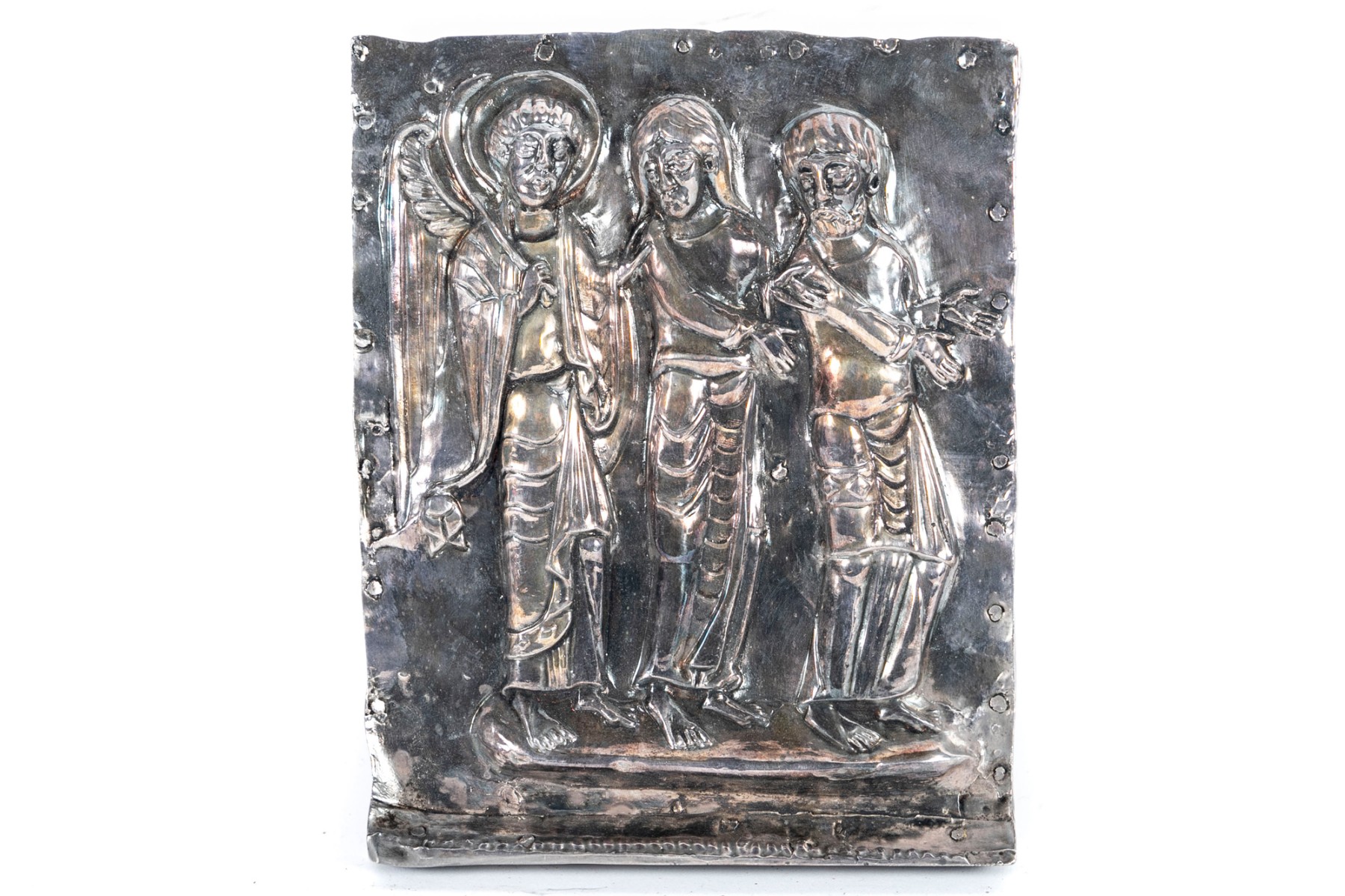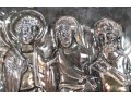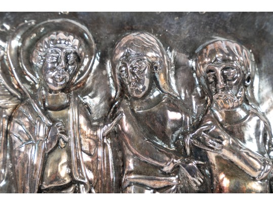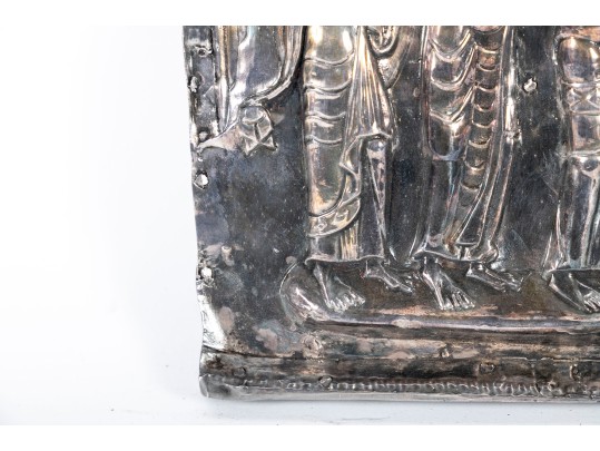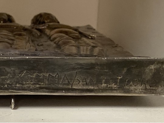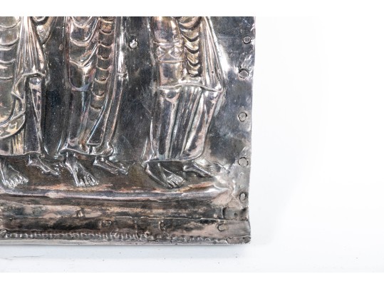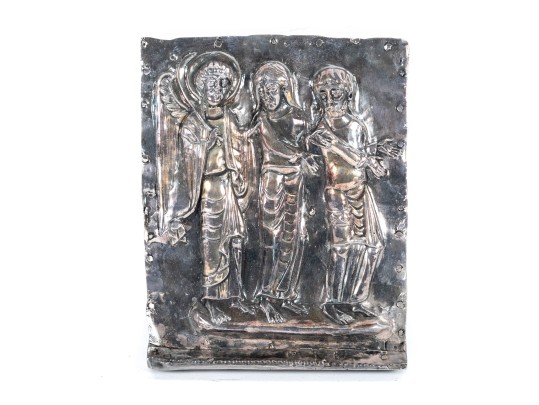 A wonderful Metropolitan Museum of Art souvenir "San Isidoro" silvertone wall-mounting plaque with a Santos-styled depiction of three figures in profile, including an angel. Marked along the underside.