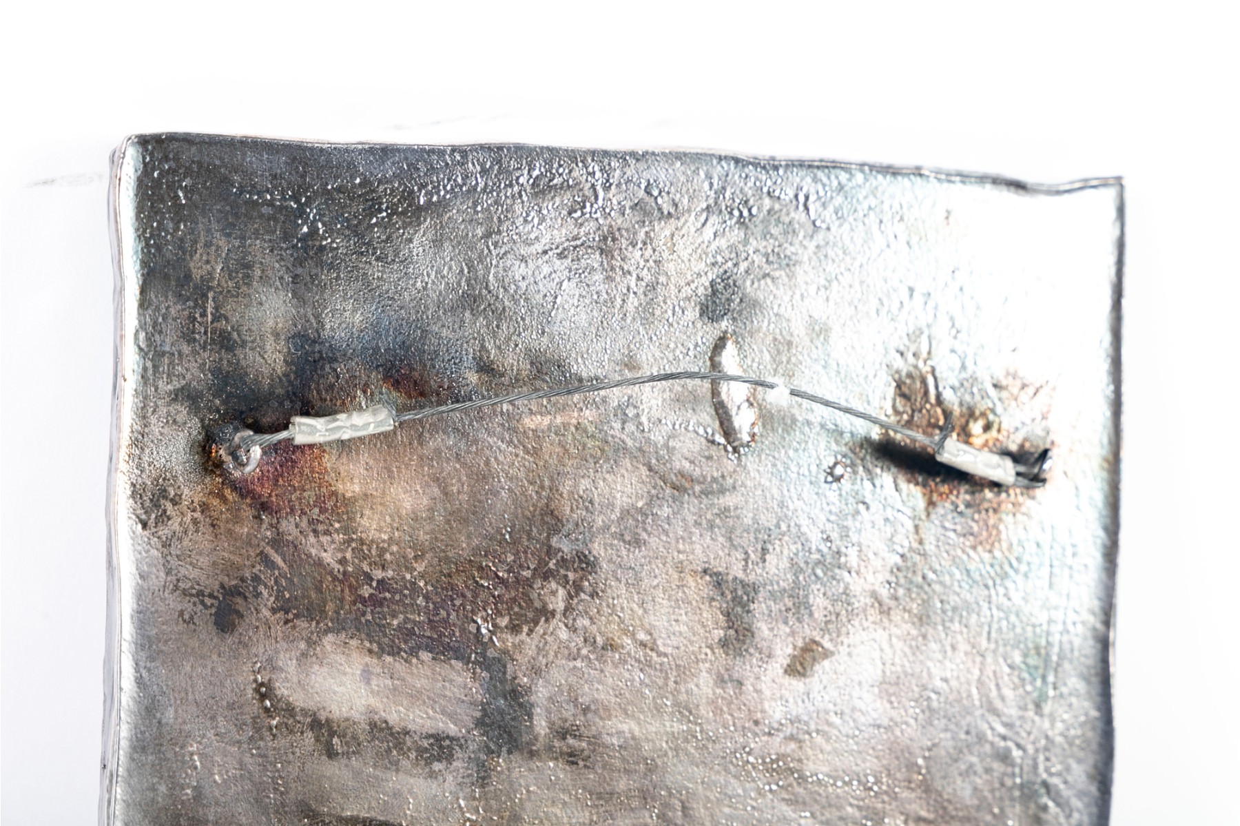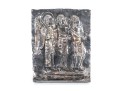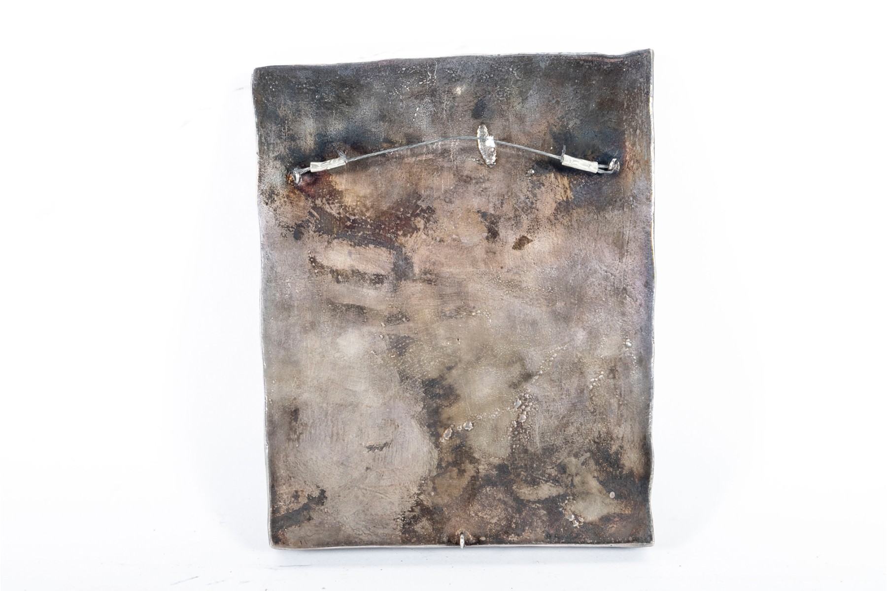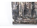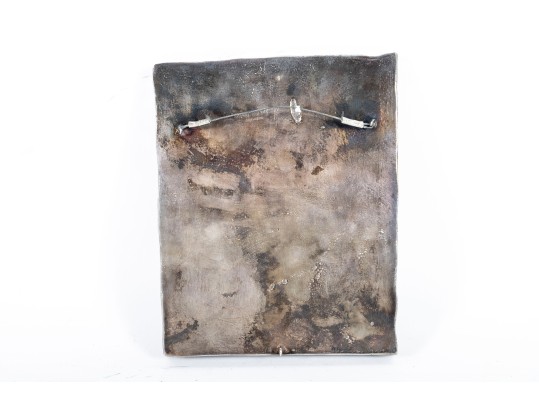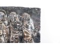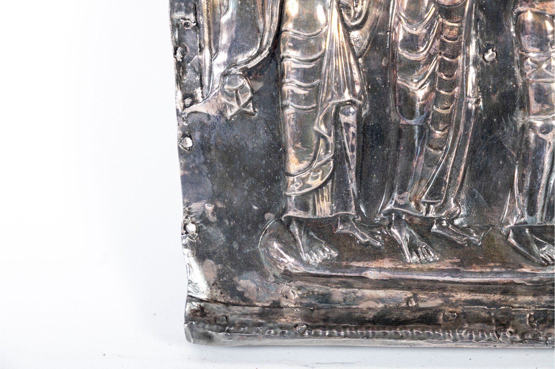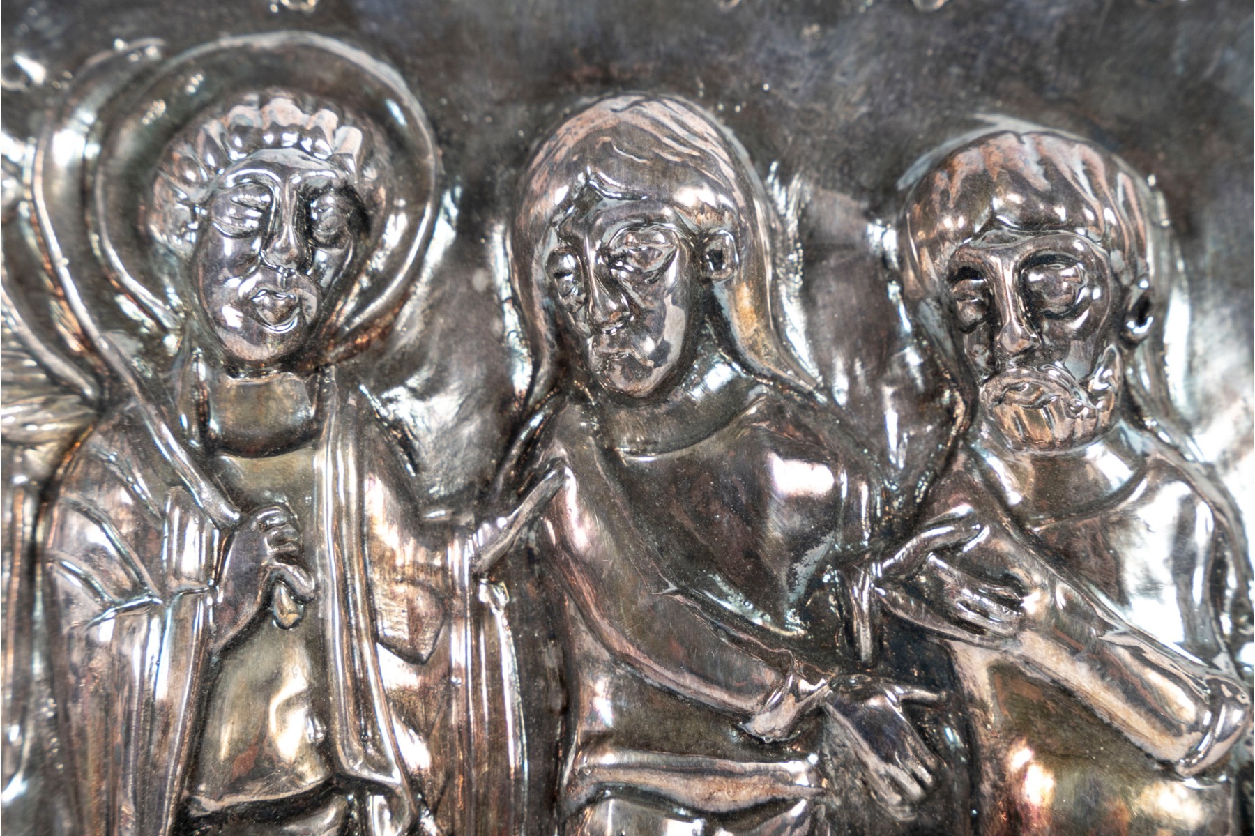 A wonderful Metropolitan Museum of Art souvenir "San Isidoro" silvertone wall-mounting plaque with a Santos-styled depiction of three figures in profile, including an angel. Marked along the underside.