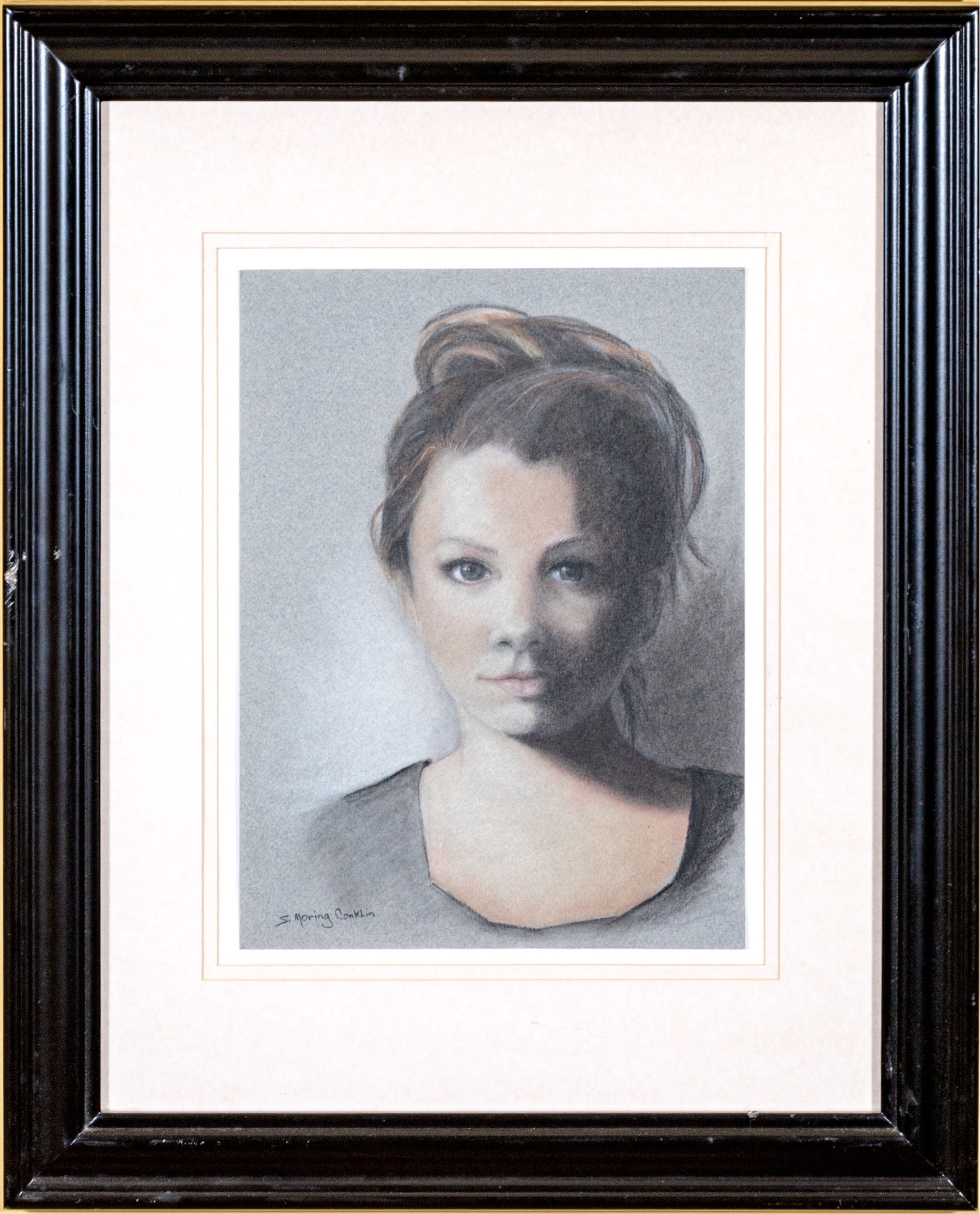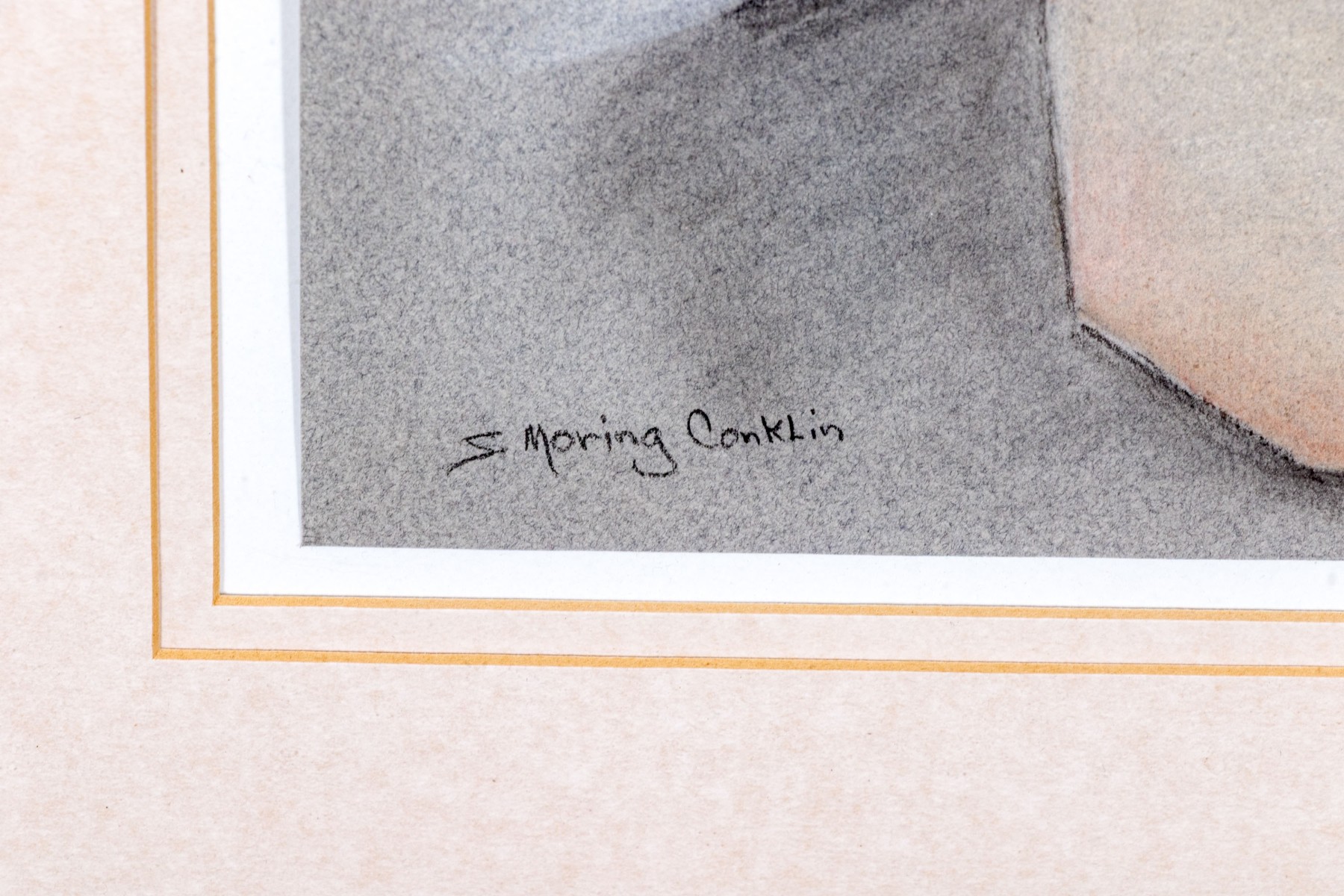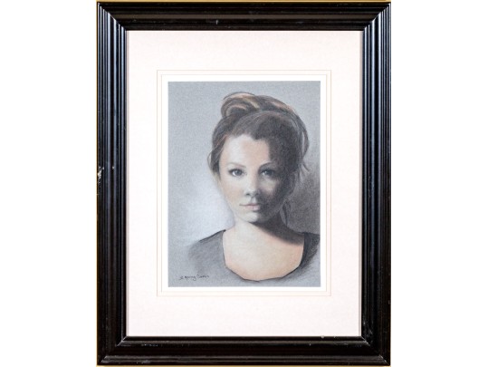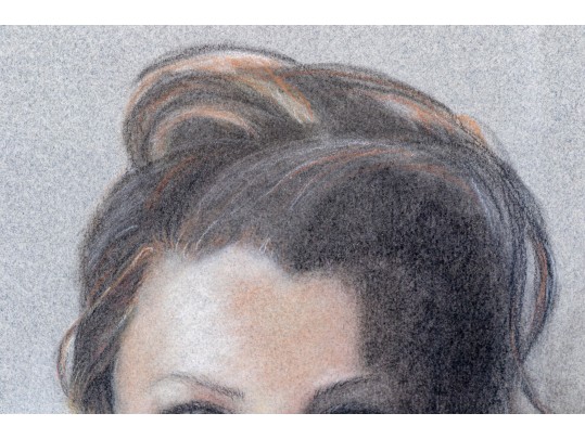 Sandra Moring Conklin (American, 20th C.) pastel on paper depicting a portrait bust of a young woman with brunette hair pulled into an updo, wearing a dark shirt against a gray background. Signed lower left.