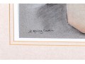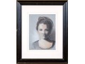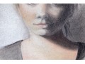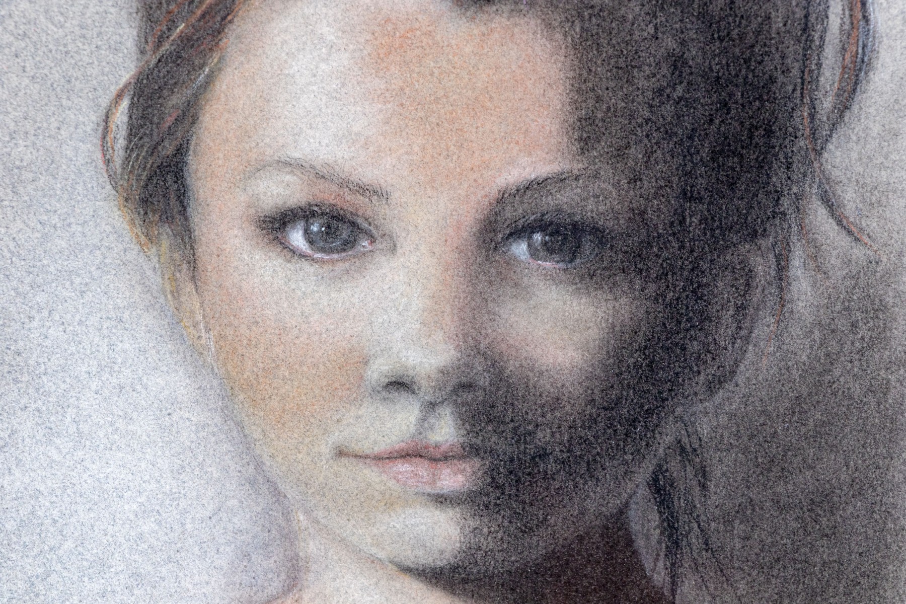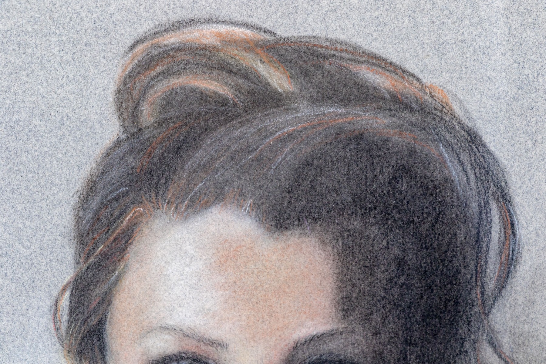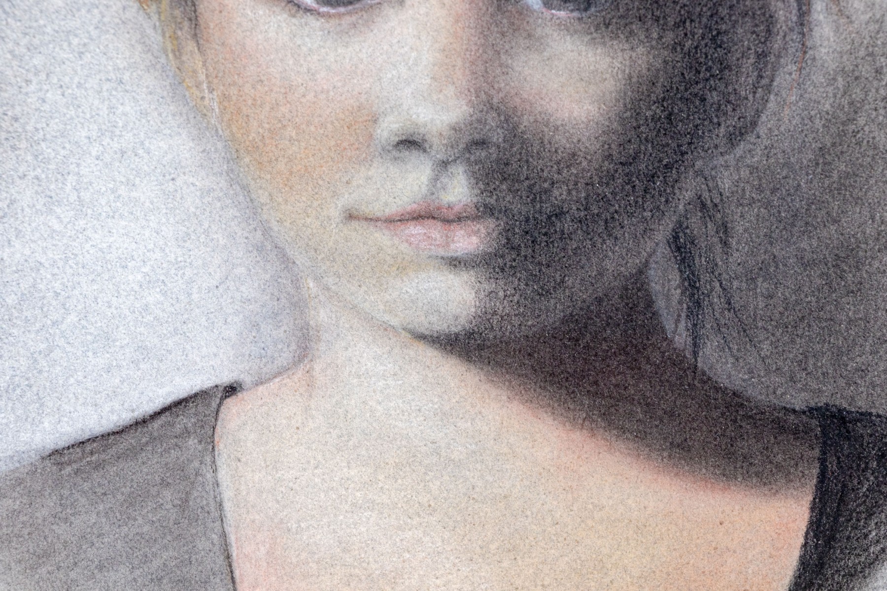 Sandra Moring Conklin (American, 20th C.) pastel on paper depicting a portrait bust of a young woman with brunette hair pulled into an updo, wearing a dark shirt against a gray background. Signed lower left.