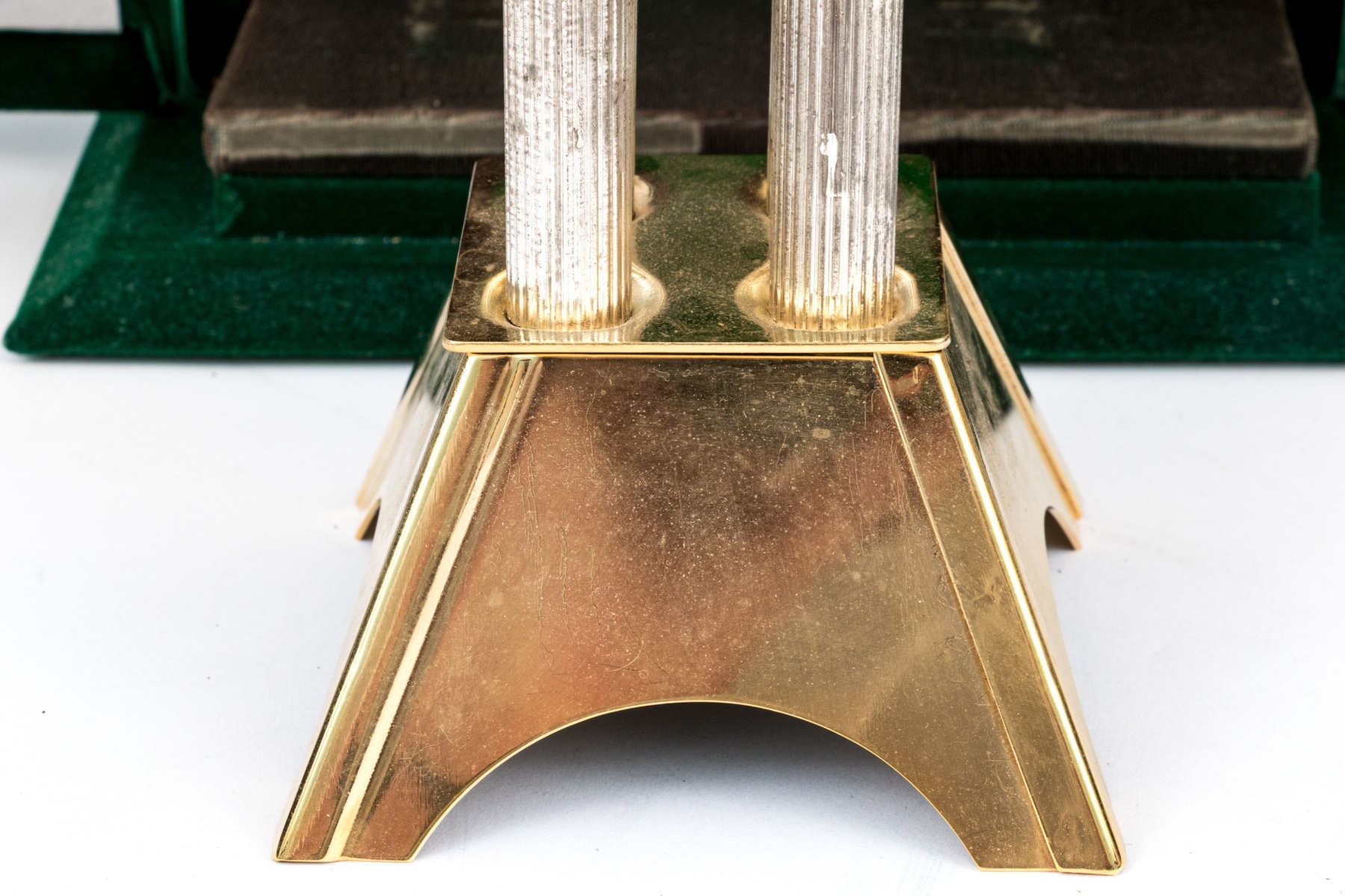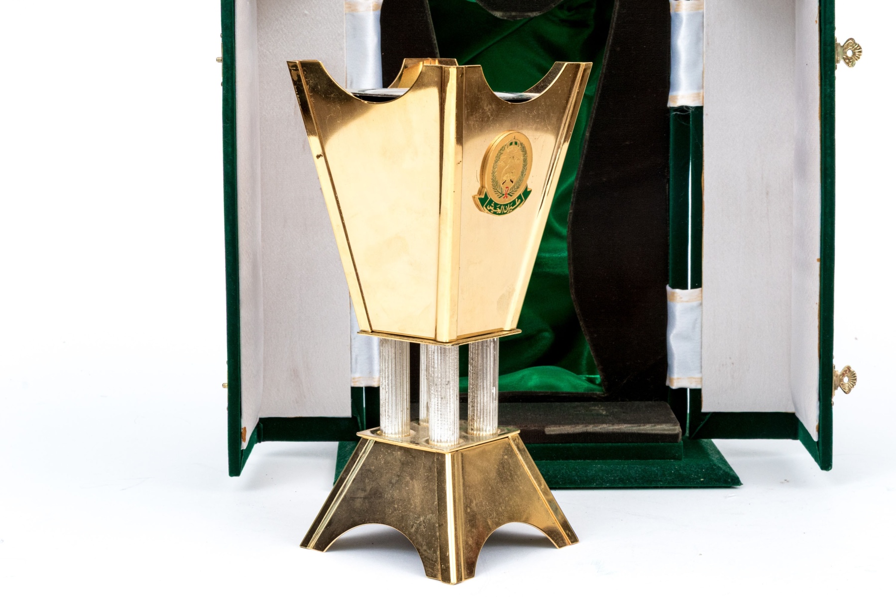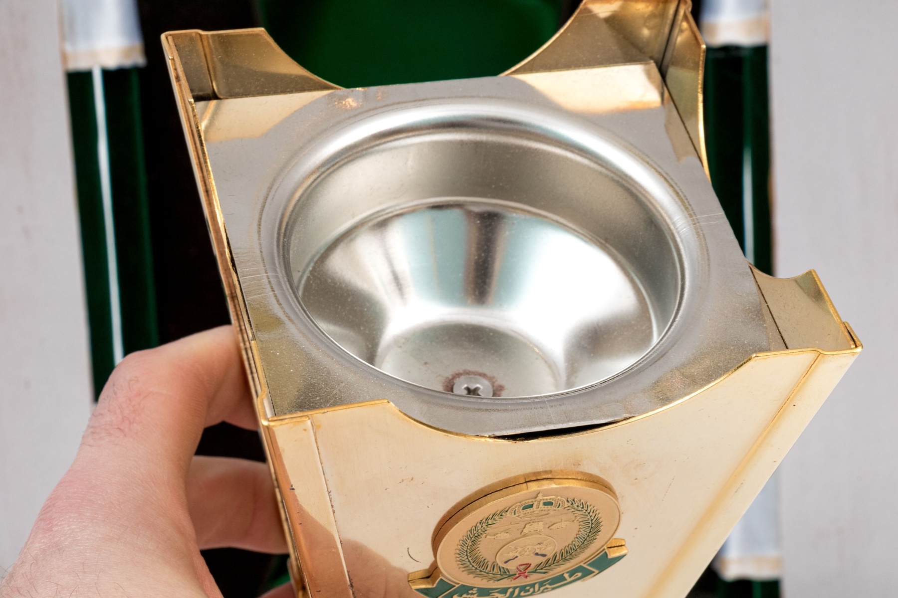 A beautifully designed Saudi Arabian Aviation Army mabkhara incense burner in traditional form, showcasing a brass tone metal trapezoidal body with a gray metal bowl center and arched notches around the rim, decorated with an emblem labeled طيران الجيش ("Army Aviation"). The upper body is supported by four finely ridged gray metal columns leading down to a trapezoidal footed base. Includes a handsome green felt presentation box.