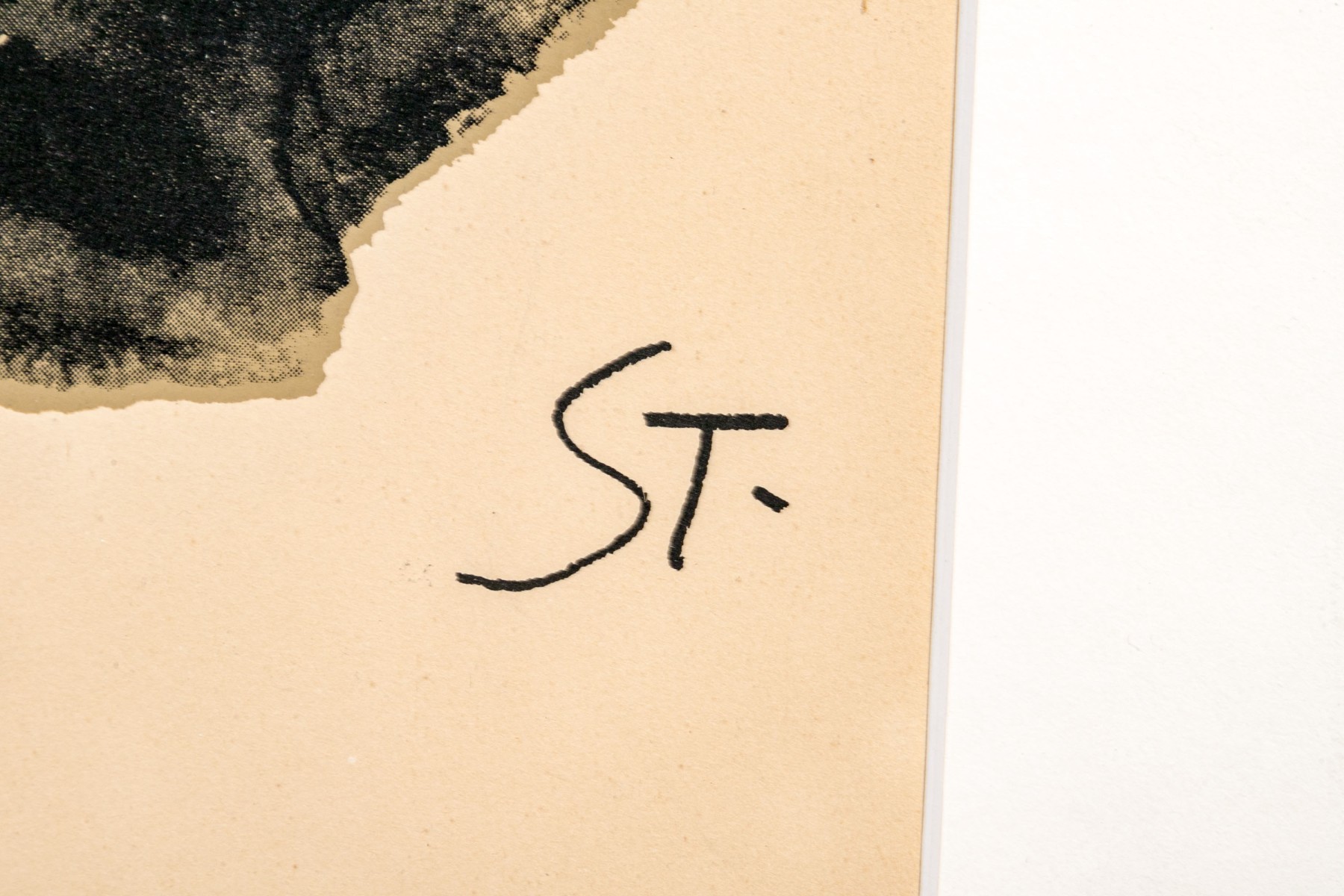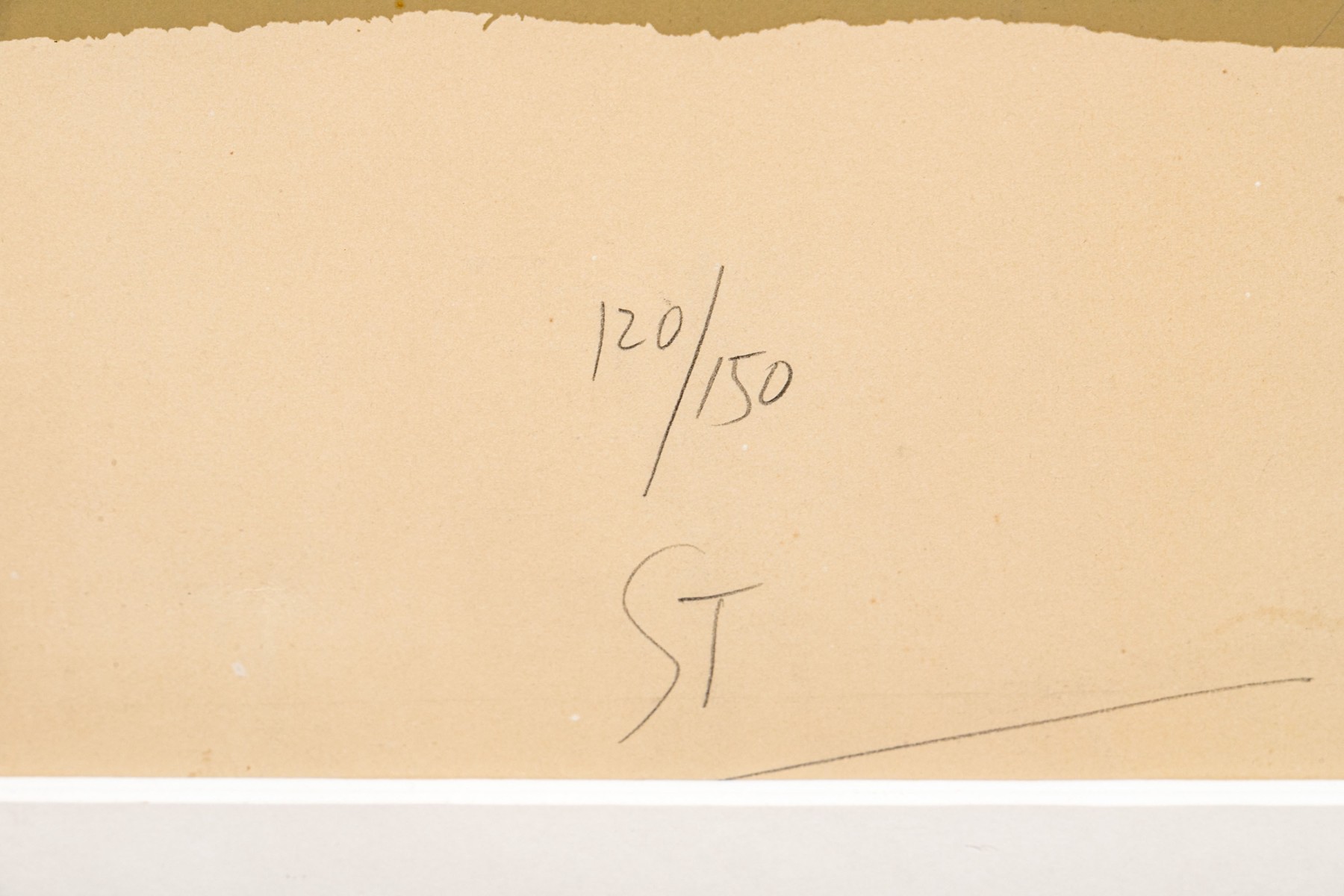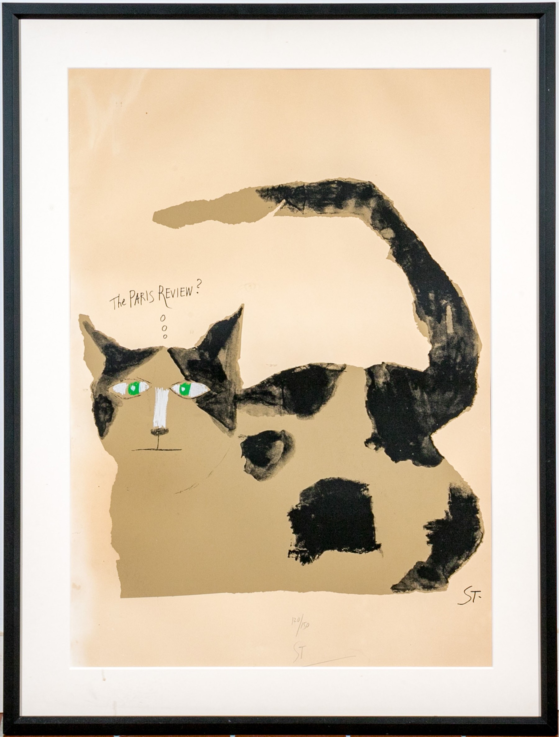 A lovely lithograph depicting a cat with a thought bubble that says "The Paris Review?" Nicely matted and framed. Numbered lower center "120/150" and signed lower right "ST" in pencil. Also signed "ST" in plate.