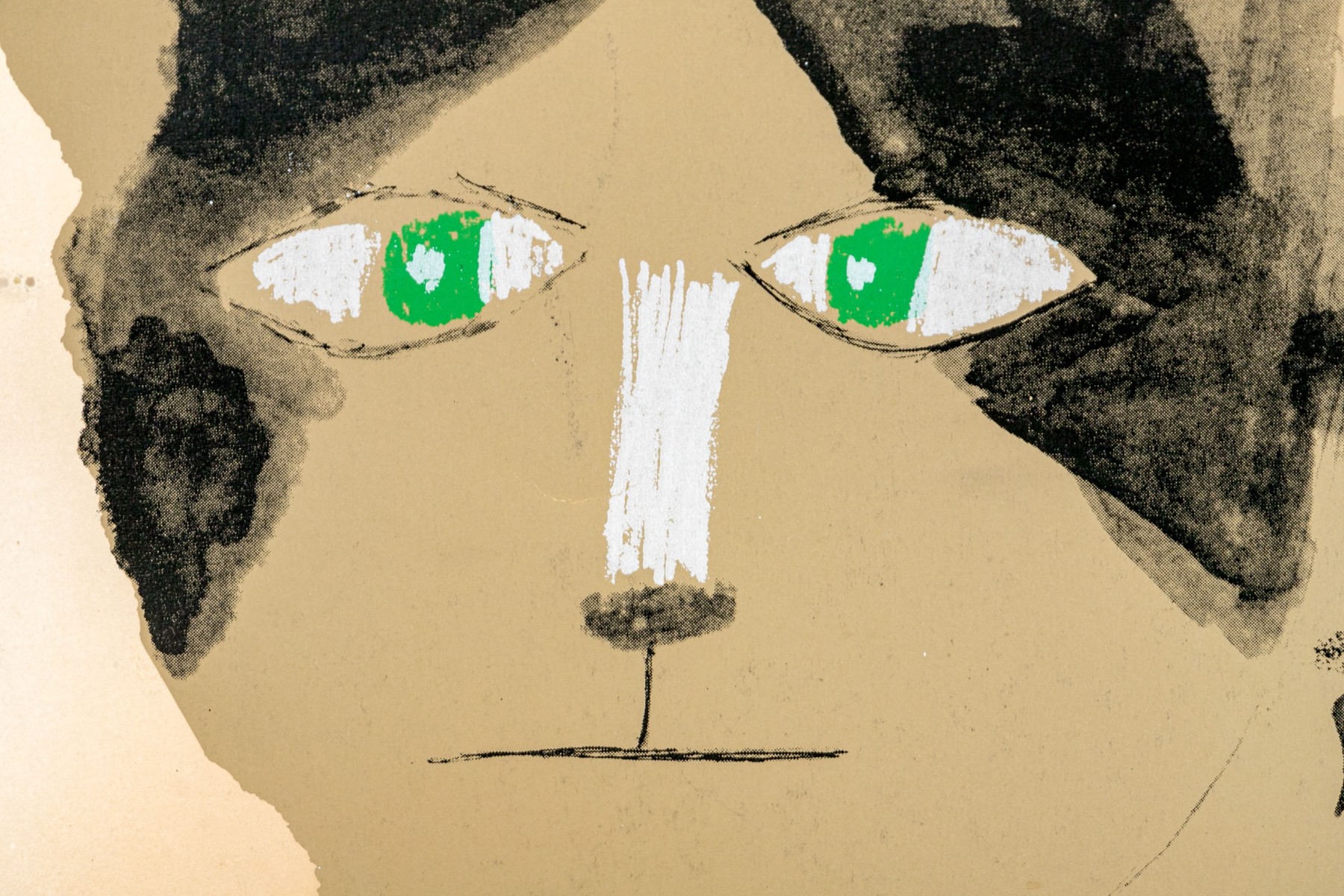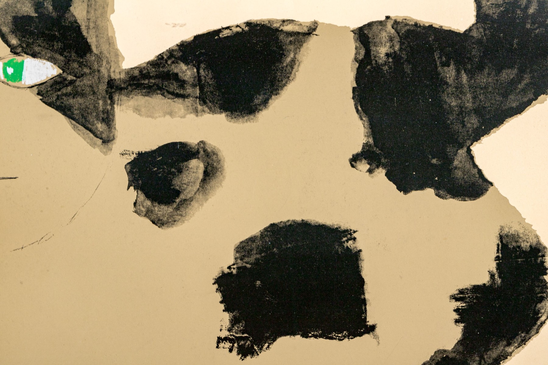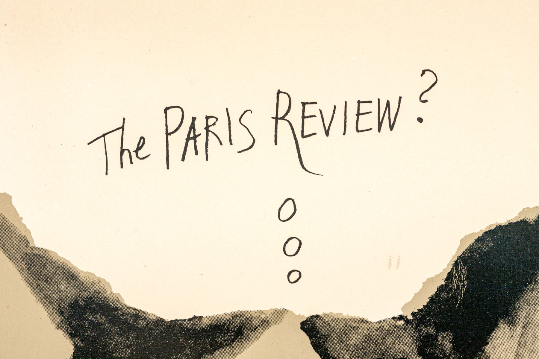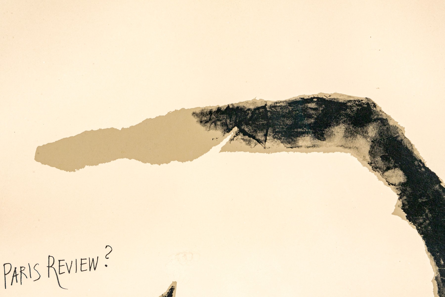 A lovely lithograph depicting a cat with a thought bubble that says "The Paris Review?" Nicely matted and framed. Numbered lower center "120/150" and signed lower right "ST" in pencil. Also signed "ST" in plate.