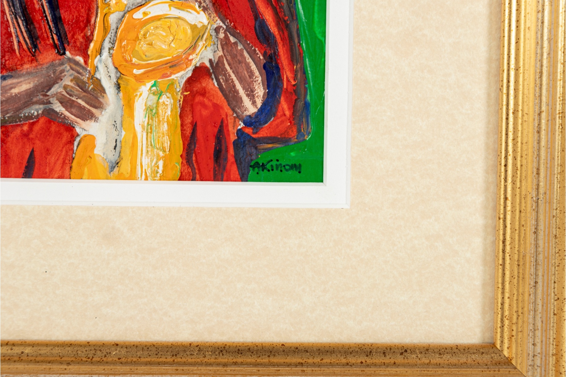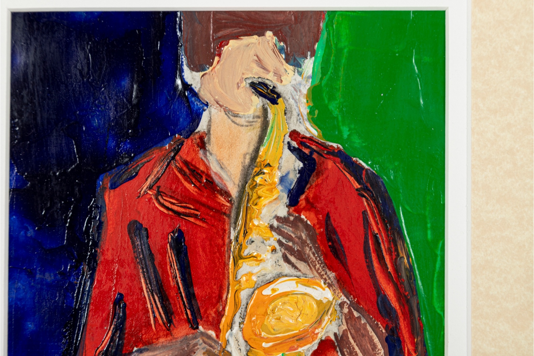 Bold and expressive oil painting depicting a jazz musician playing the saxophone, rendered in vivid tones of red, green, and indigo. Signed “Akinom” lower left and presented in a gilt frame with linen matting.
