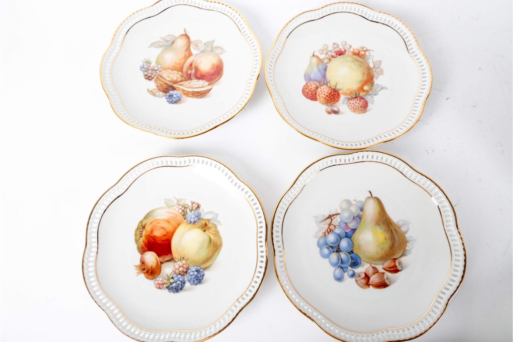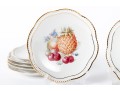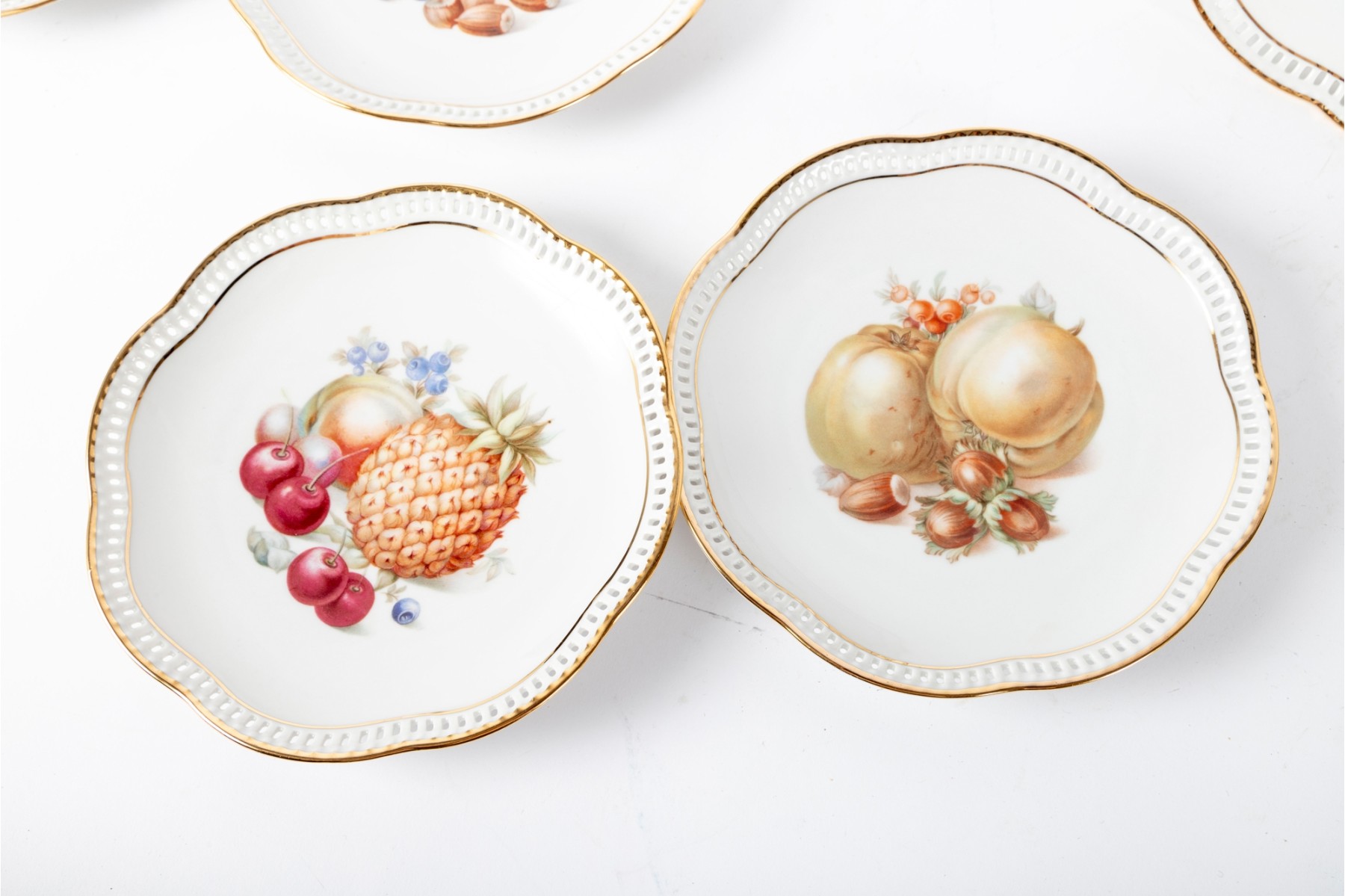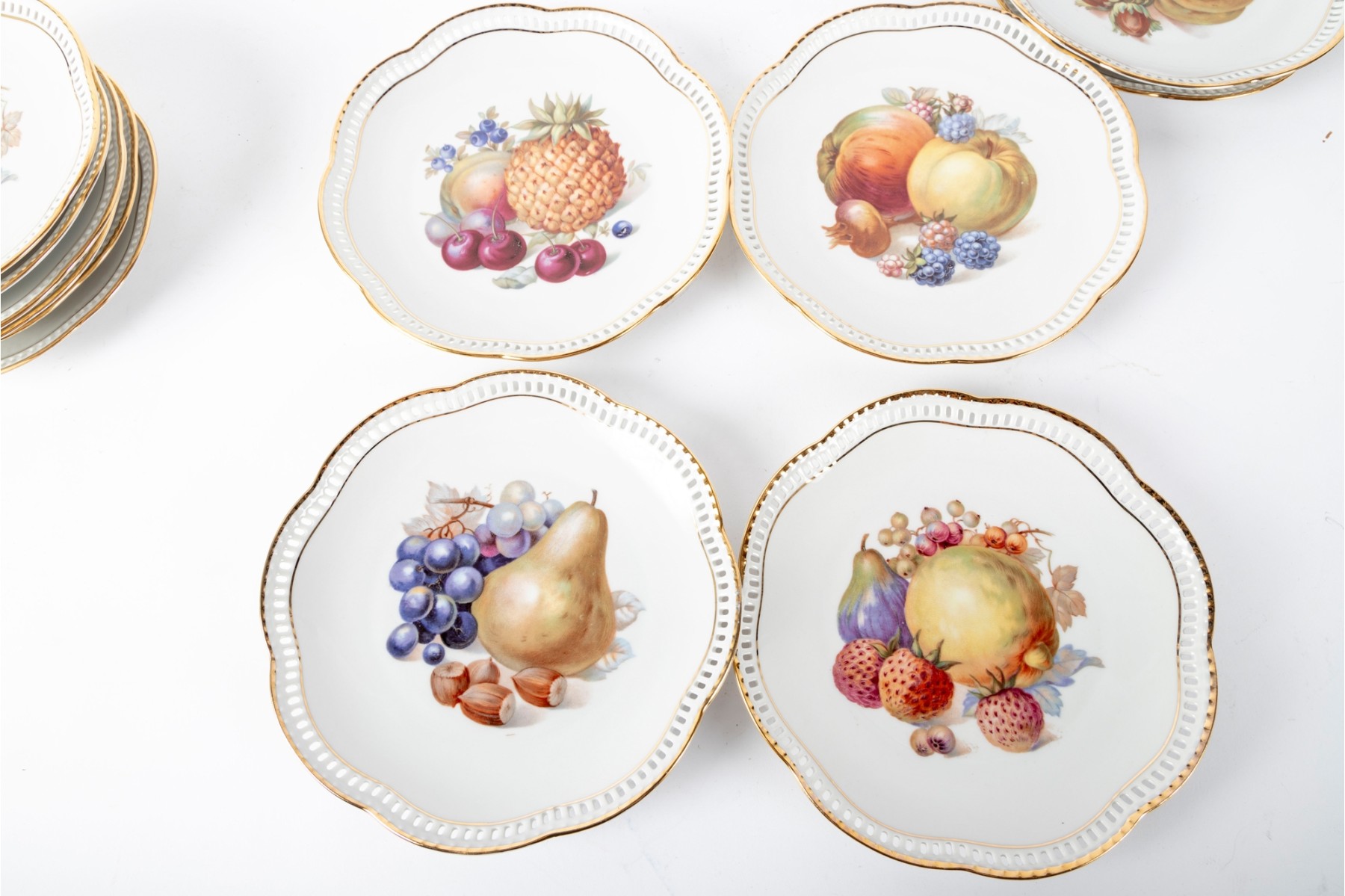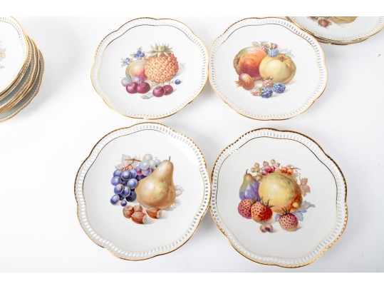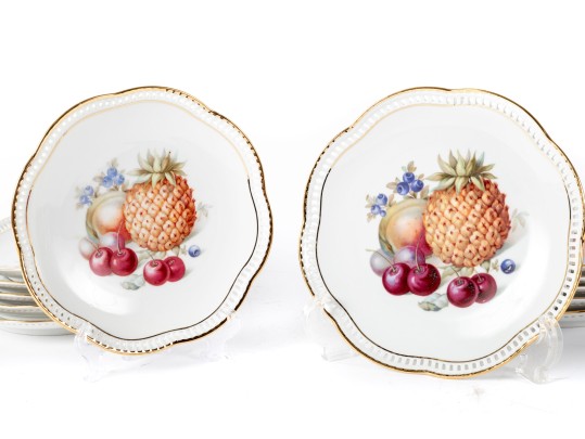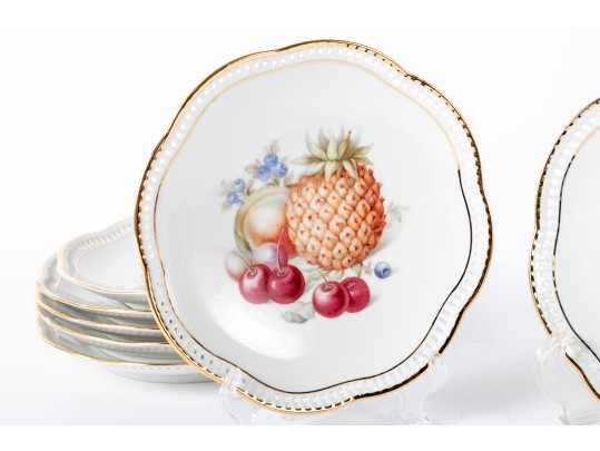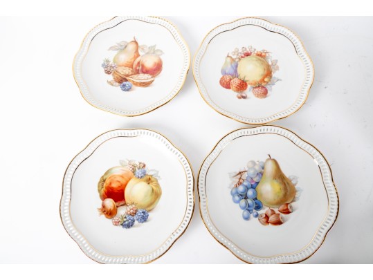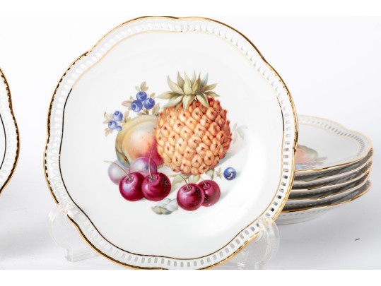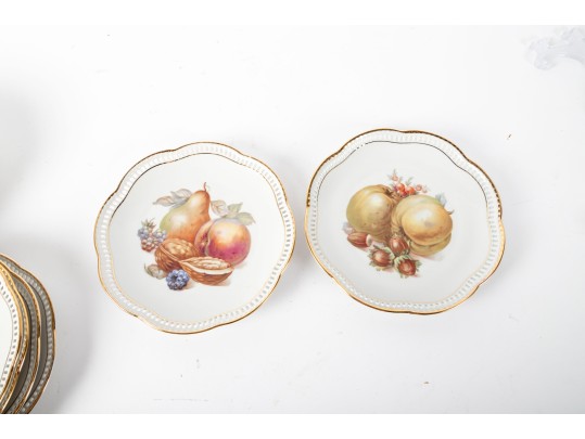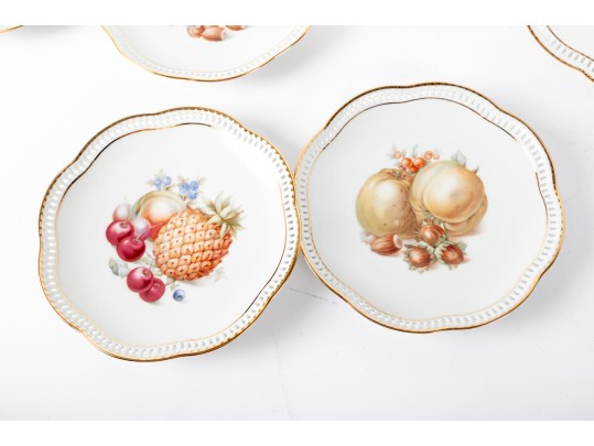 Twelve vintage Schumann Arzberg Bavaria china plates (Varied sizes: 7" - 8") featuring delicate pierced/gilt trim and a central motif of hand-painted fruits and vegetables.