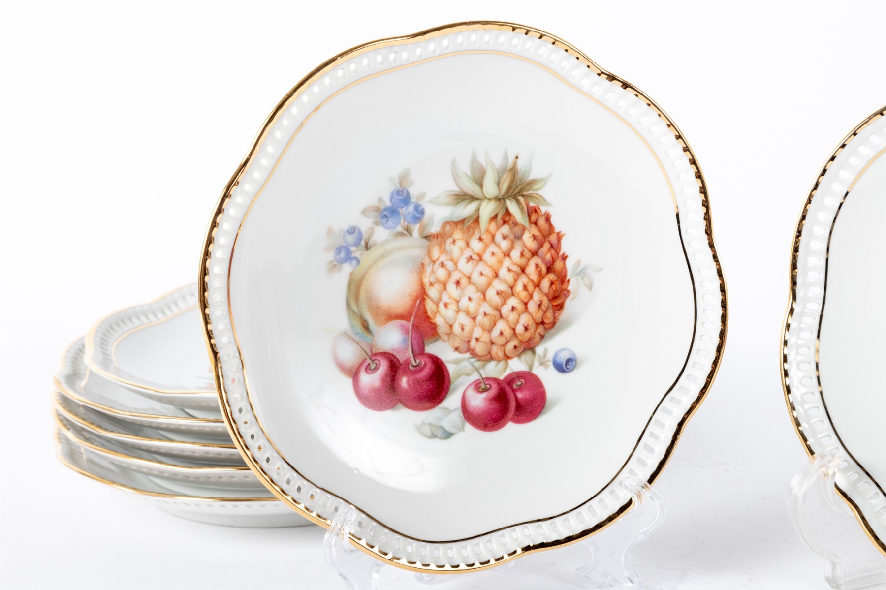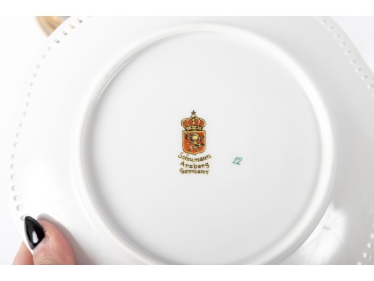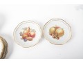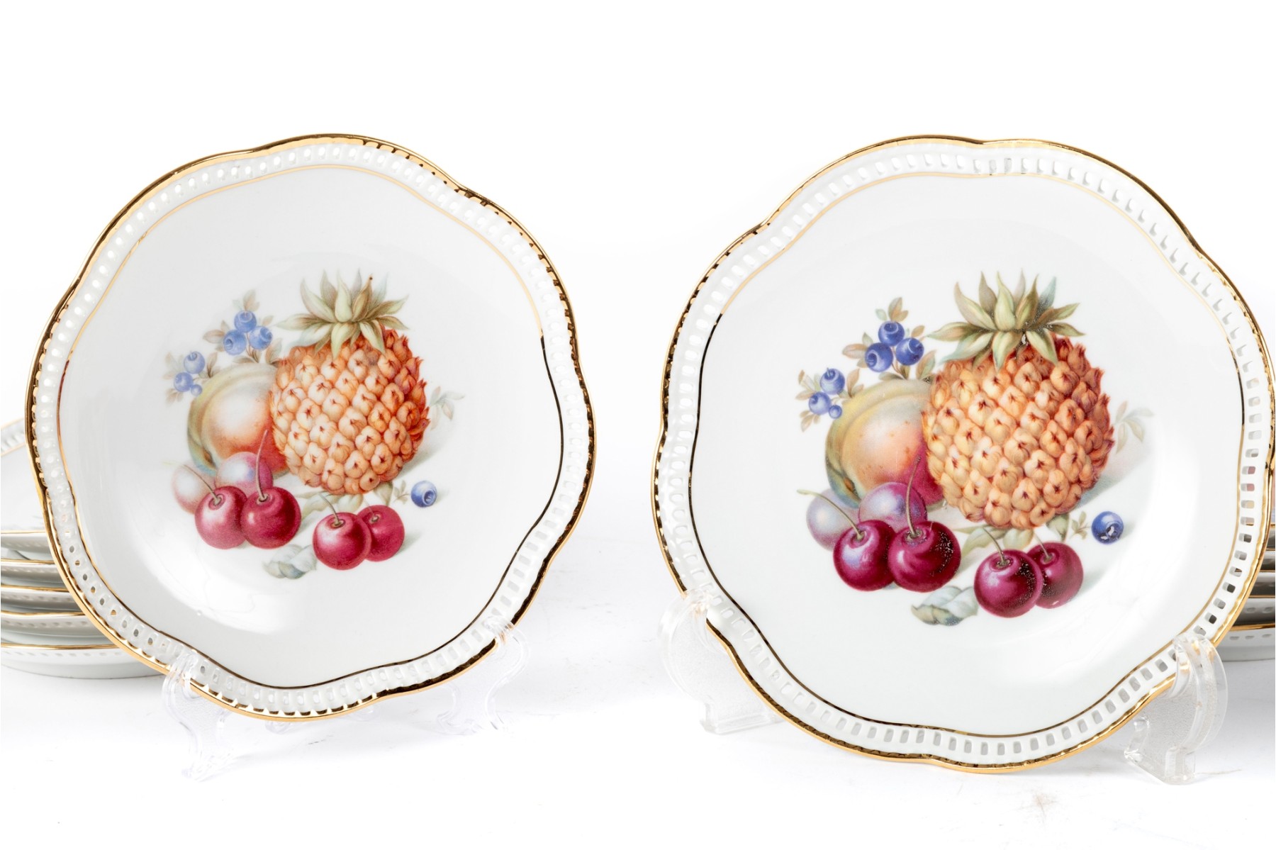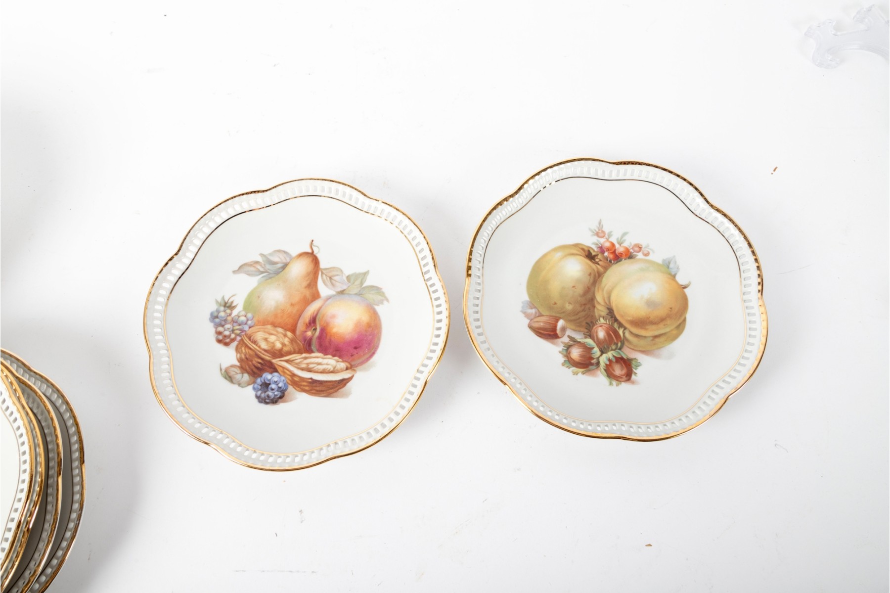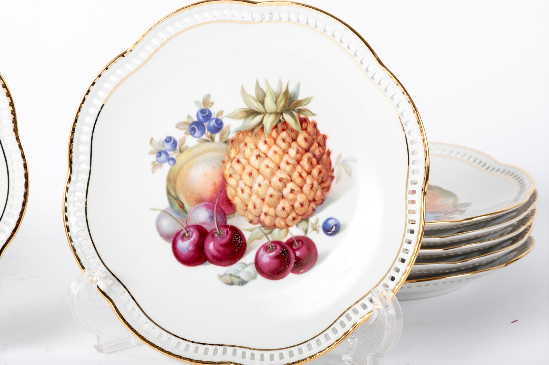 Twelve vintage Schumann Arzberg Bavaria china plates (Varied sizes: 7" - 8") featuring delicate pierced/gilt trim and a central motif of hand-painted fruits and vegetables.