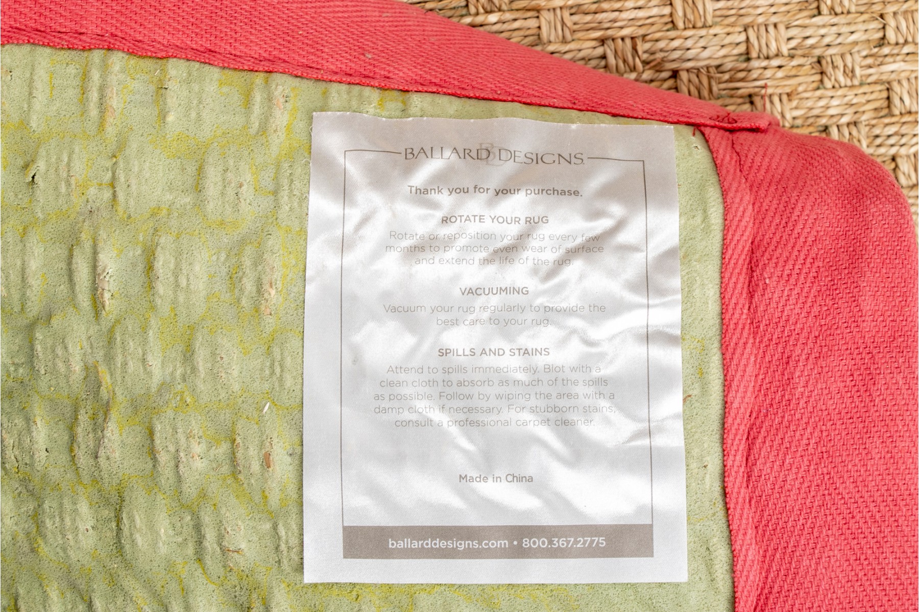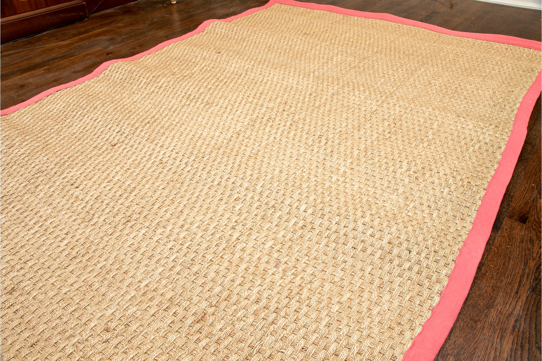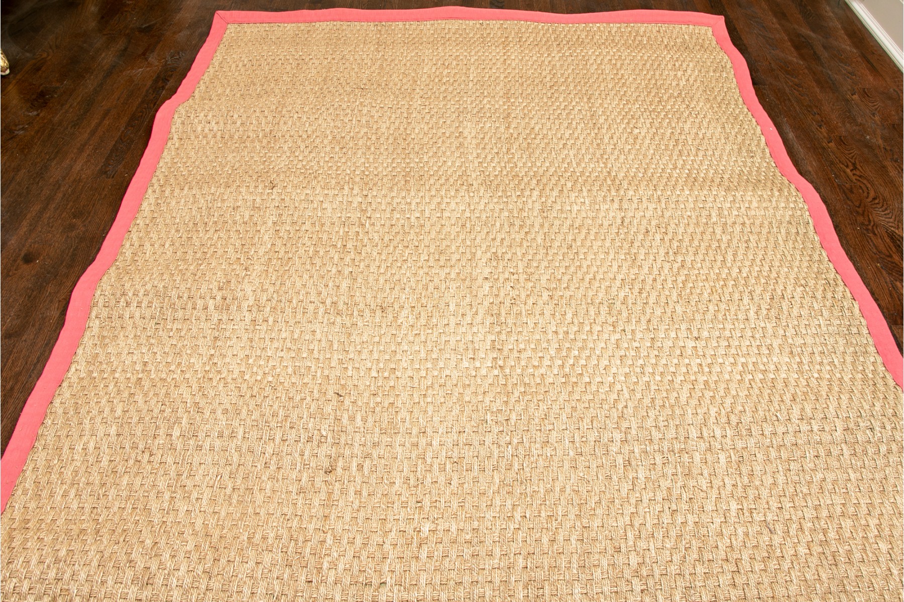 Seagrass area rug with pink cotton twill border from Ballard Designs. Rug is made from natural seagrass in a classic basket pattern bound by a pink cotton twill border and has a latex back for added durability.