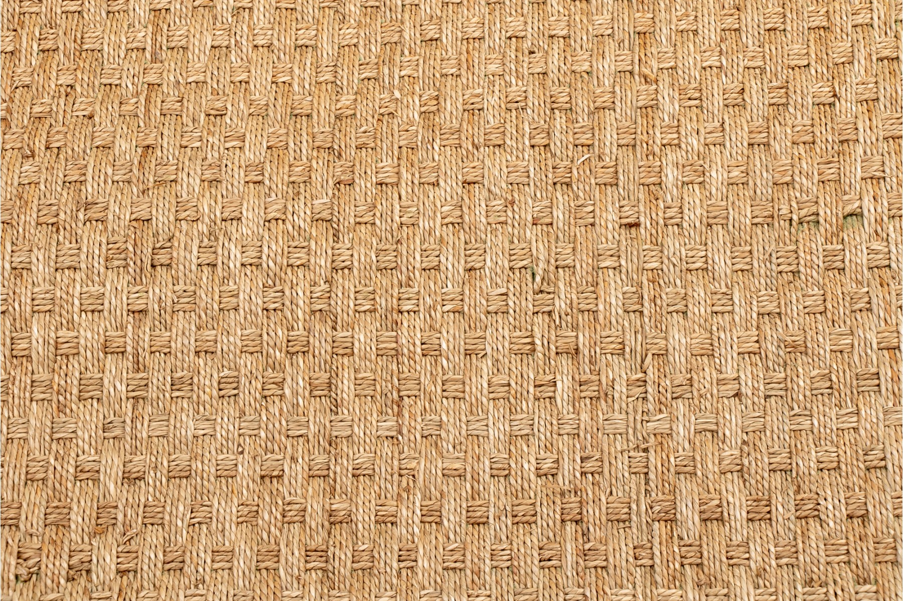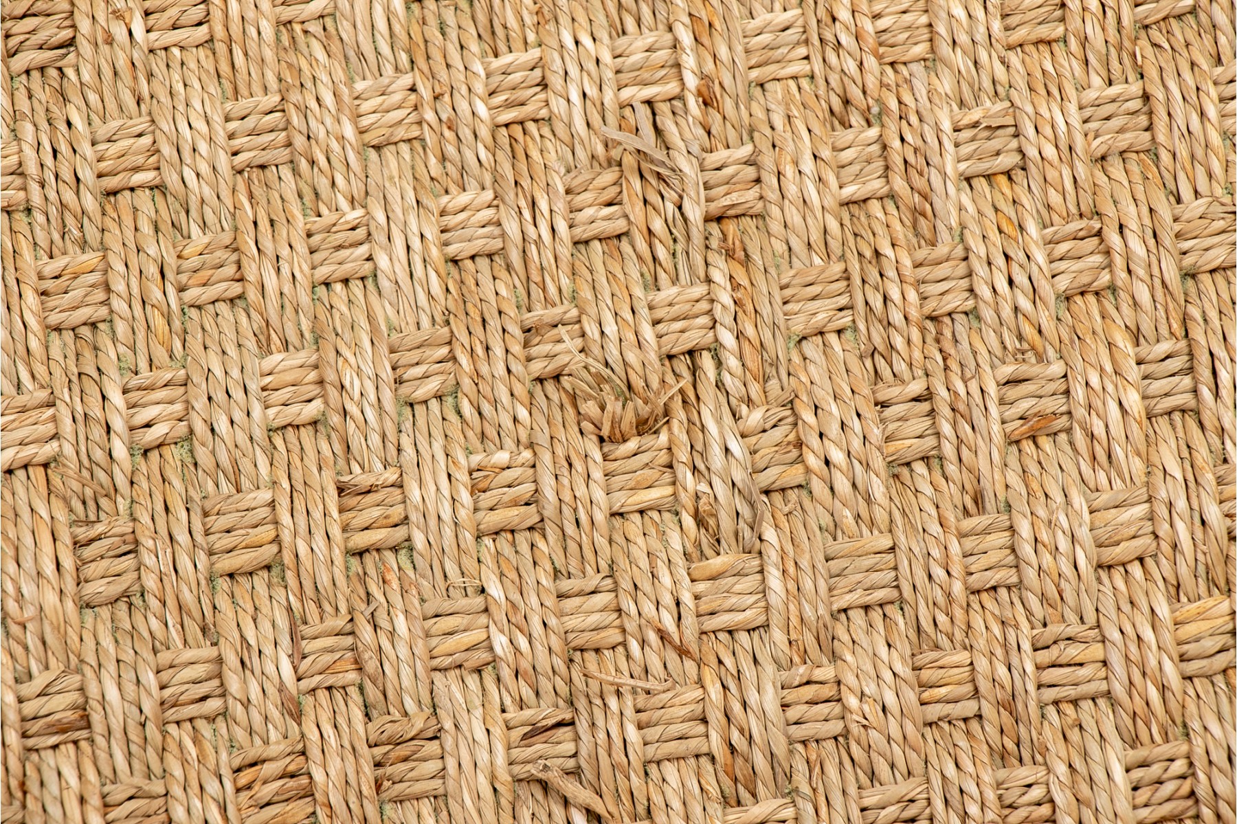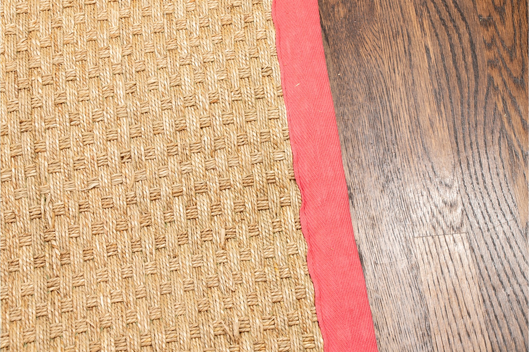 Seagrass area rug with pink cotton twill border from Ballard Designs. Rug is made from natural seagrass in a classic basket pattern bound by a pink cotton twill border and has a latex back for added durability.