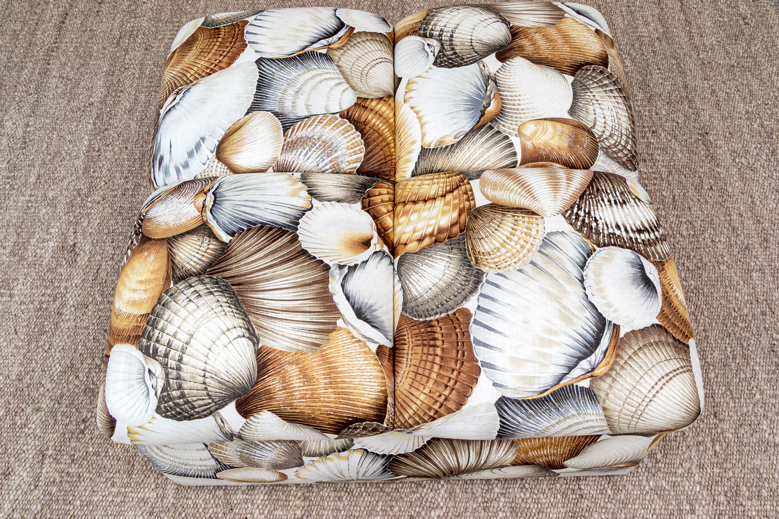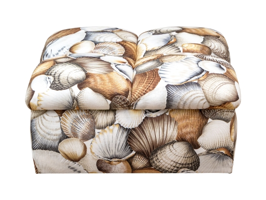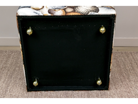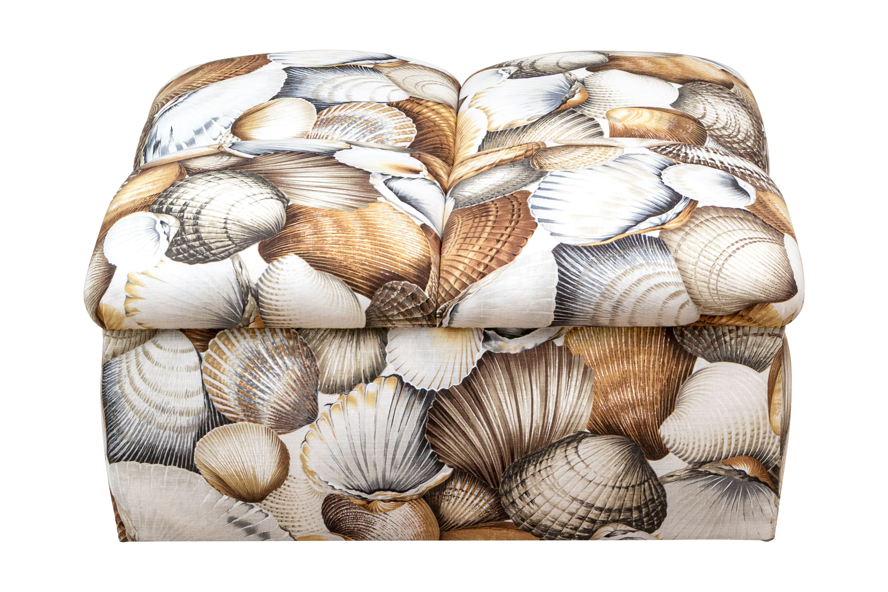 An ottoman featuring a distinct seashell print with woven upholstery fabric, giving it a coastal or beach-themed aesthetic in natural or muted tones with grays, browns, and creams and raised up on brass ball casters. The ottoman is especially designed for extra seating or resting your feet making it a functional and decorative for various rooms, such as a bedroom, living room, or entryway.